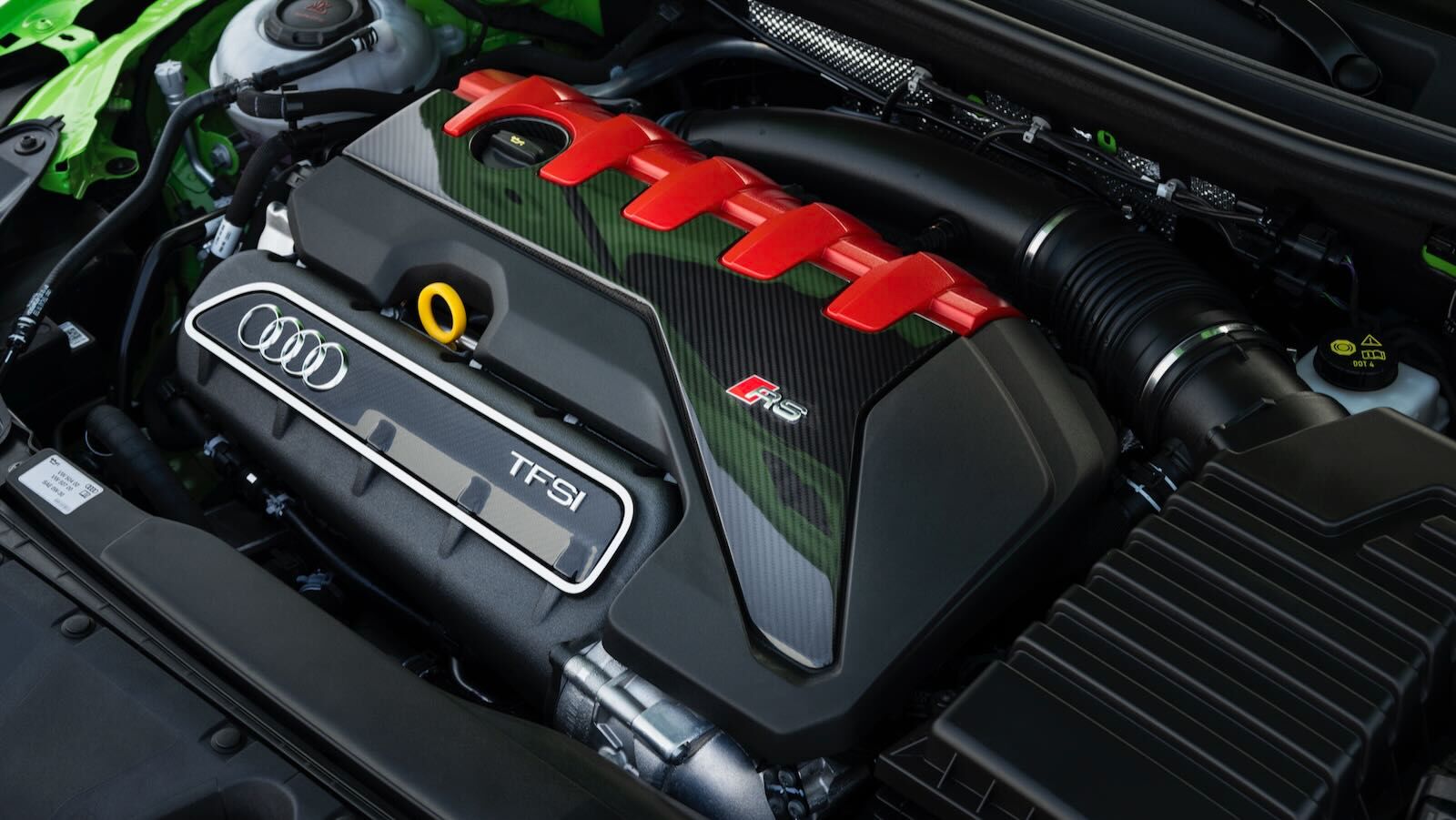 El gran protagonista de esta versión de altas prestaciones es el motor de cinco cilindros 2.5 TFSI con 400 CV (294 kW) y un par máximo de 500 Nm, con el que este compacto acelera de 0 a 100 km/h en 3,8 segundos y alcanza 290 km/h de velocidad punta. Destacar el sonido, gracias a la secuencia de encendido 1-2-4-5-3, que alterna los cilindros adyacentes y los más distantes entre sí, al que hay que sumar el sistema de escape doble RS con mariposas de control variable.