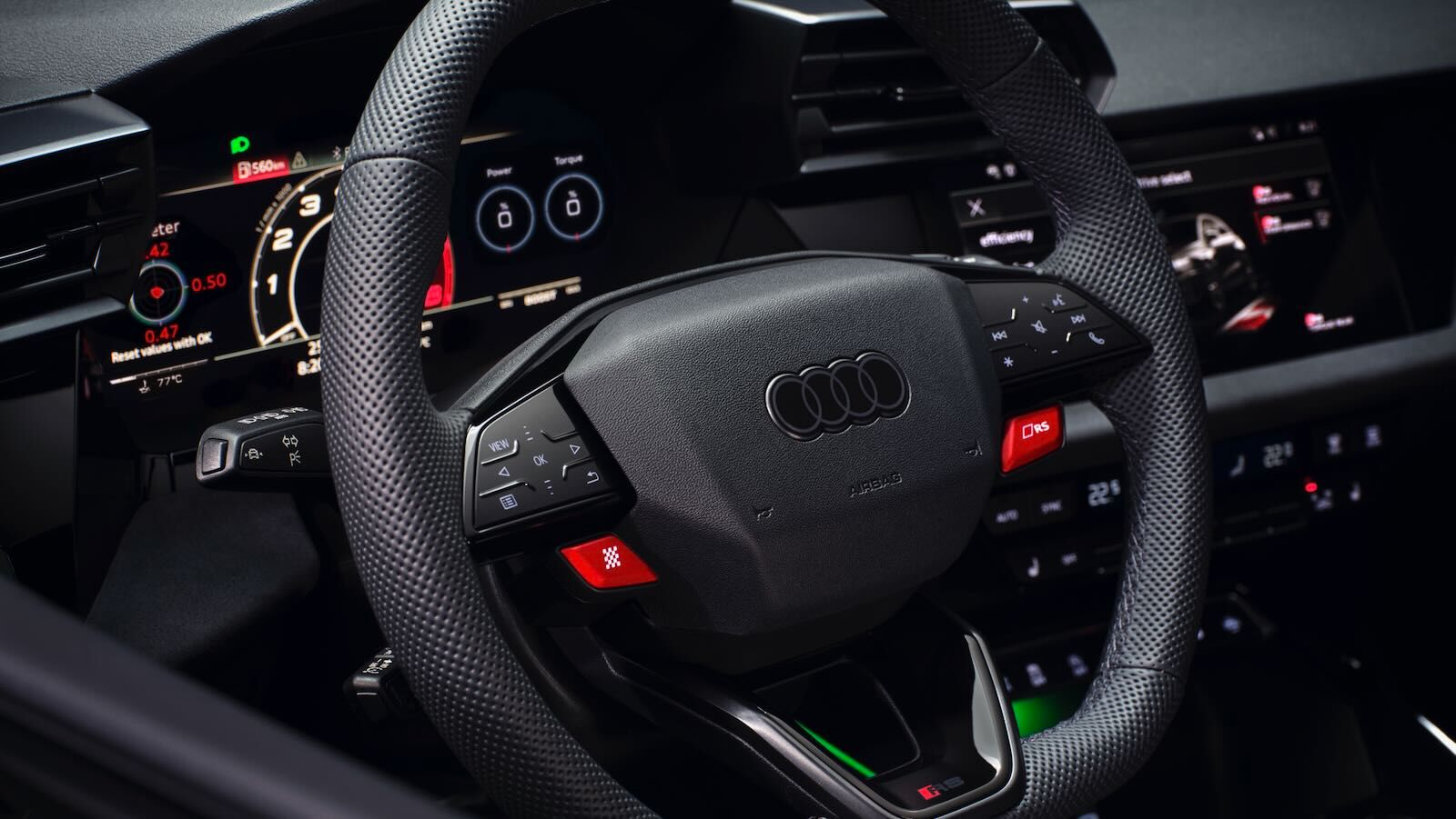 Hay novedades importantes respecto al Audi RS 3 Sportback 2021. En este, el sobreviraje se generaba pisando el acelerador. Ahora, es más fácil de iniciar a través del ángulo de dirección, para que el conductor consiga más rápido el mismo ángulo de derrape. Ahora el modo Performance, especialmente diseñado para el circuito, puede activarse pulsando el botón satélite izquierdo del volante. Con el icono de la bandera a cuadros, es nuevo, al igual que el botón rojo RS situado en el radio derecho del volante, un acceso rápido al modo RS Individual.