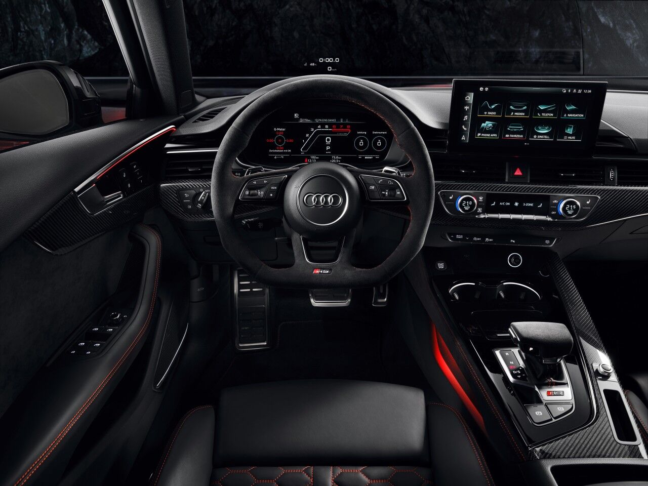La gran noticia para el habitáculo es la nueva pantalla táctil MMI de 10,1 pulgadas. Está ligeramente orientada hacia el conductor y adopta las funciones que anteriormente se manejaban con el mando giratorio de la consola central. Al tratarse de un modelo RS, la pantalla puede mostrar desde información vital del vehículo hasta fuerzas G y tiempos de vuelta. La generación actual (B9) se introdujo en 2015, por lo que es un cambio bienvenido.