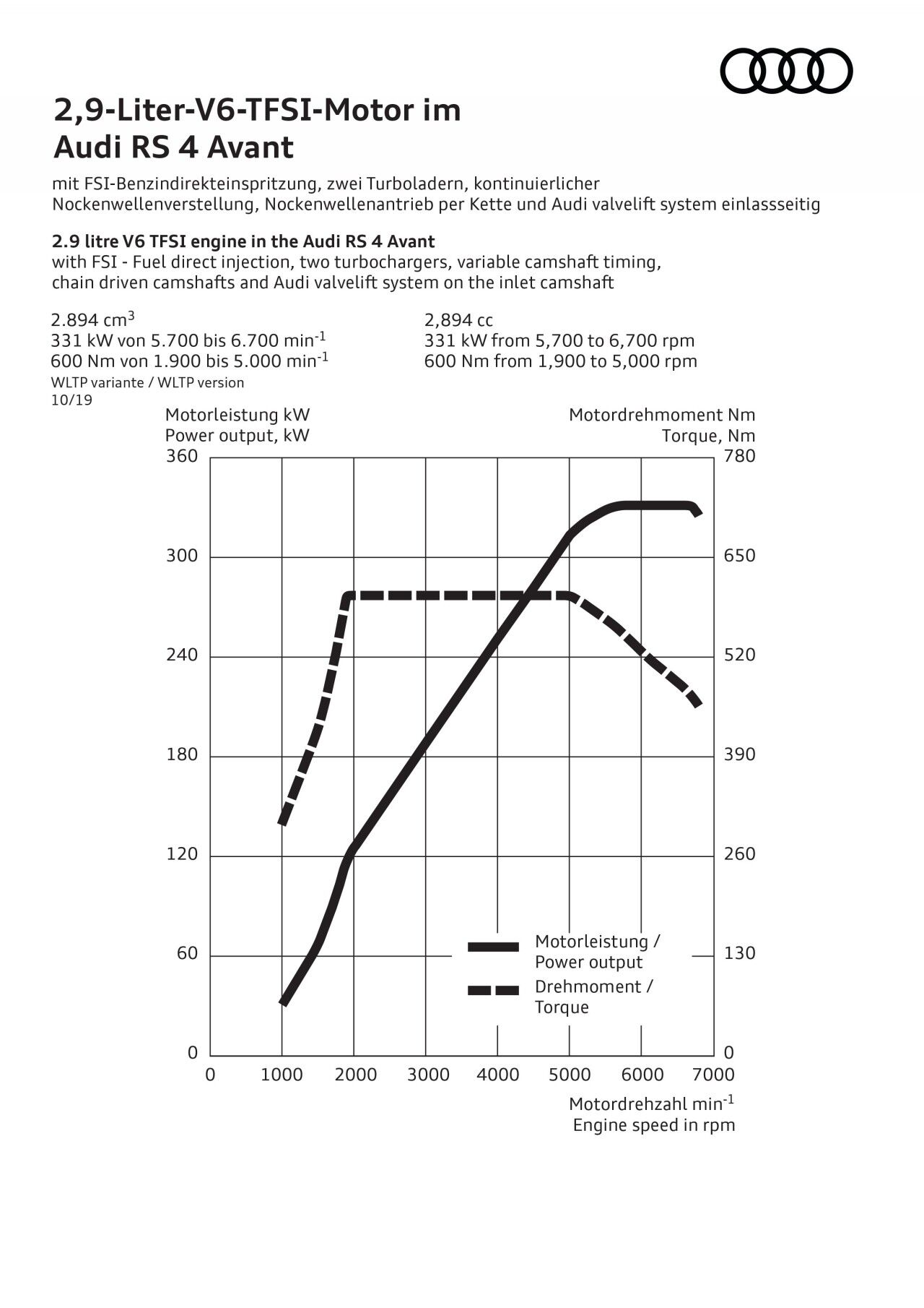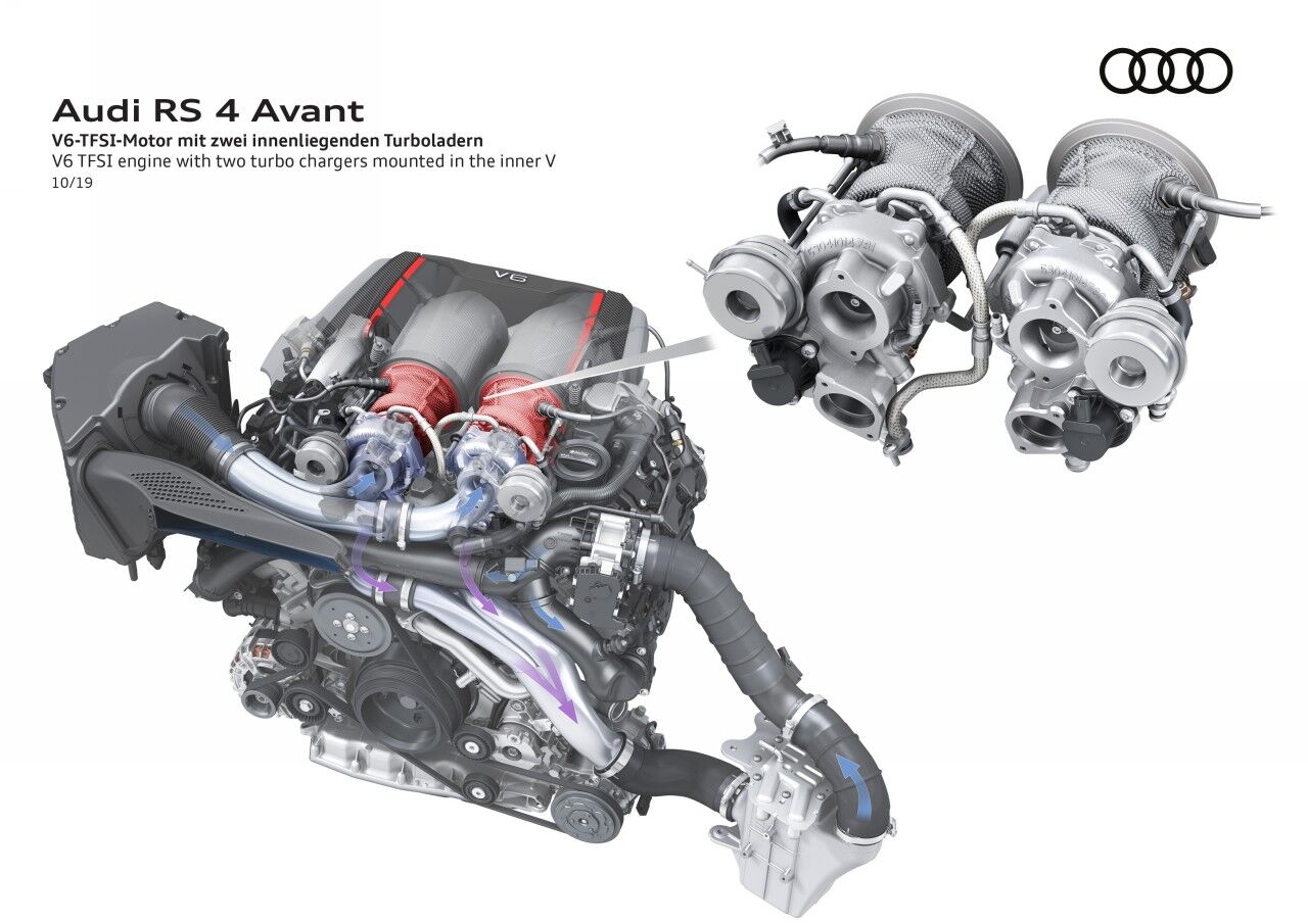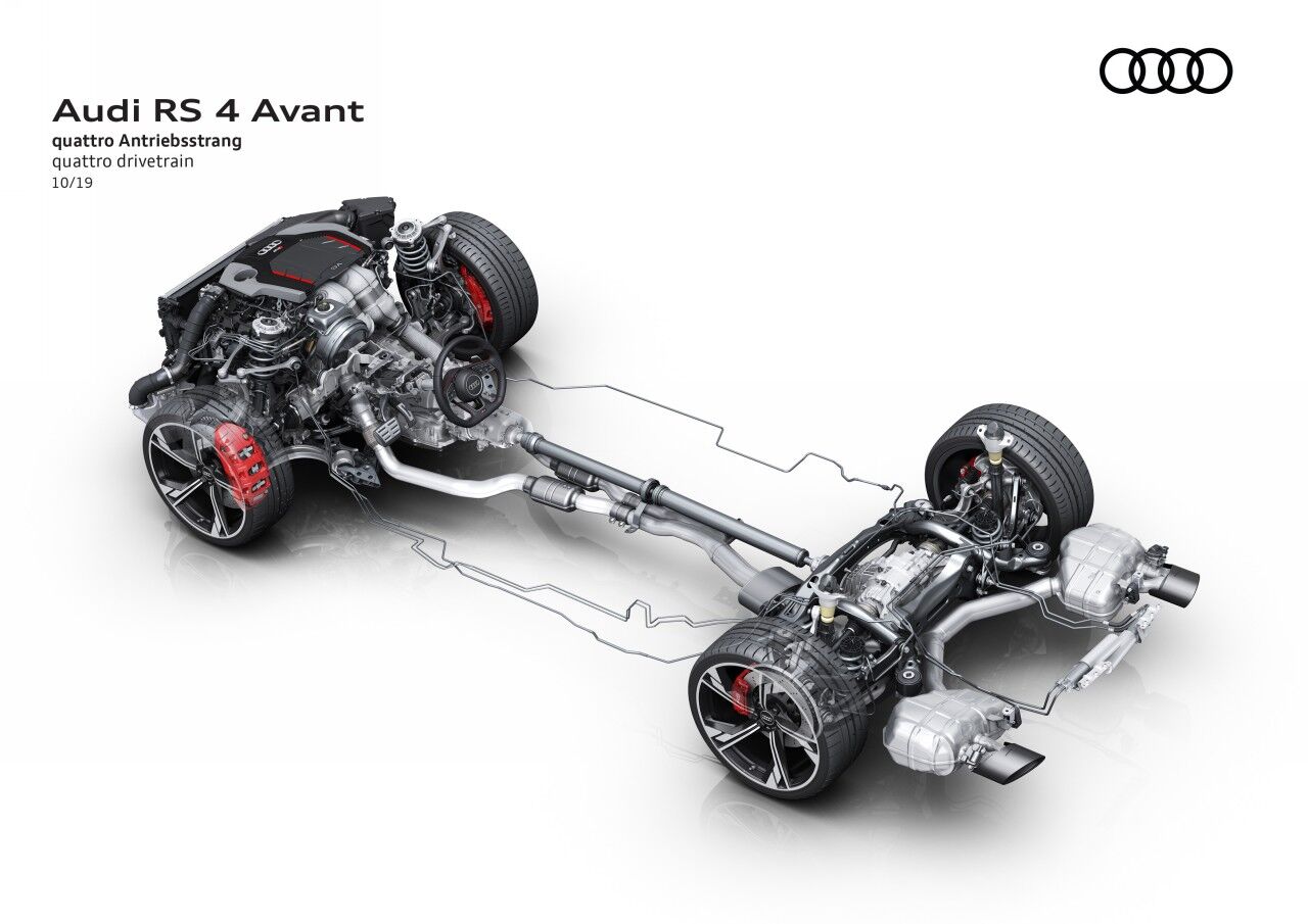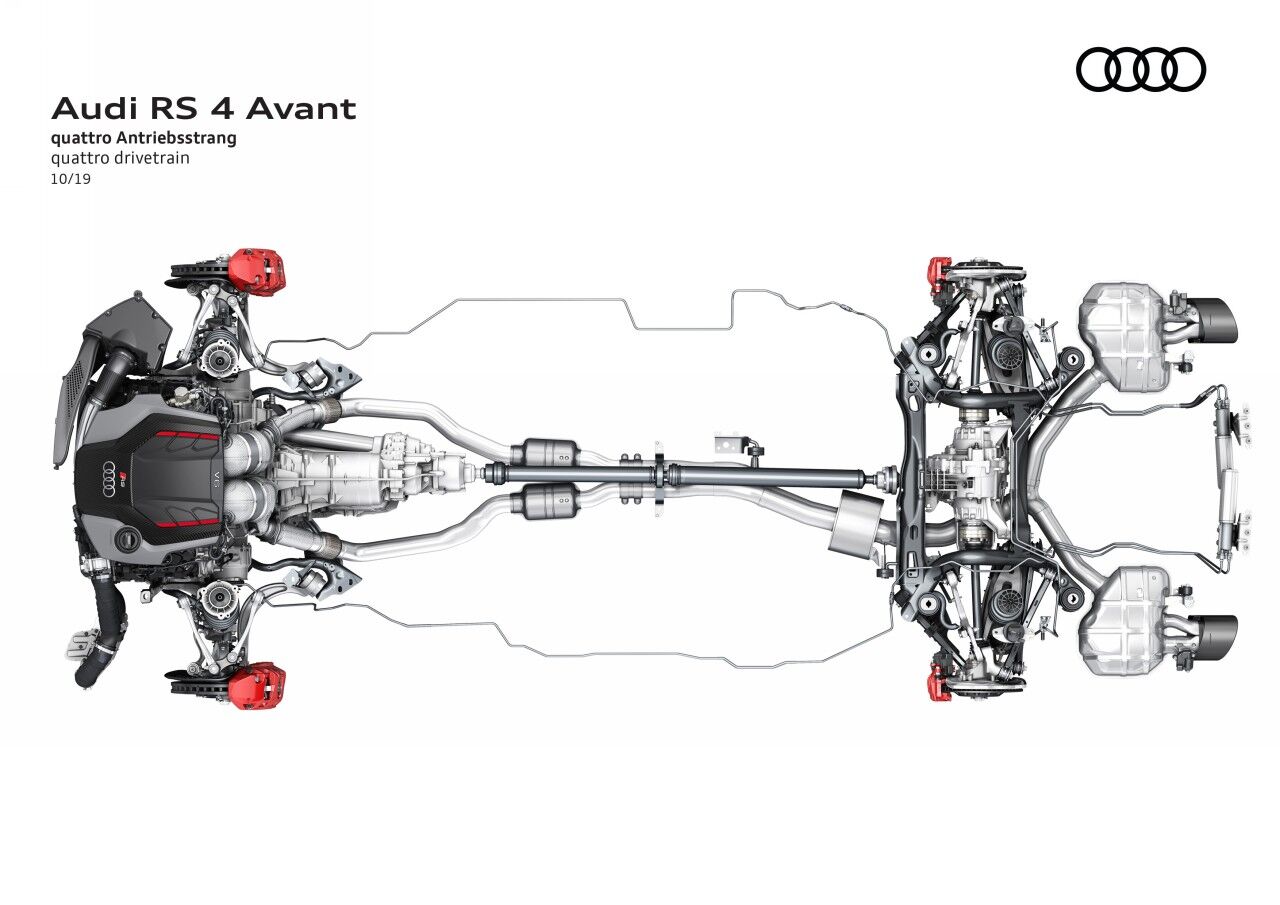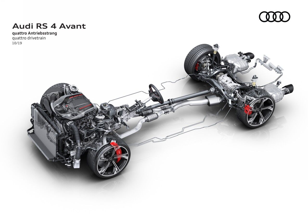 El tren motriz del actualizado Audi RS 4 Avant 2020 comienza por el motor V6 de 2.9 litros y doble turbocompresor. Genera 450 CV y 600 Nm, con este último de 1.900 a 5.000 rpm. La energía del bloque se envía a una transmisión automática de doble embrague y cocho marchar que, a su vez, traslada mediante un sistema de tracción integral quattro (40:60). Audi afirma que puede hacer el 0 a 100 en 4,1 segundos y alcanzar una velocidad máxima limitada de 250 km/h.