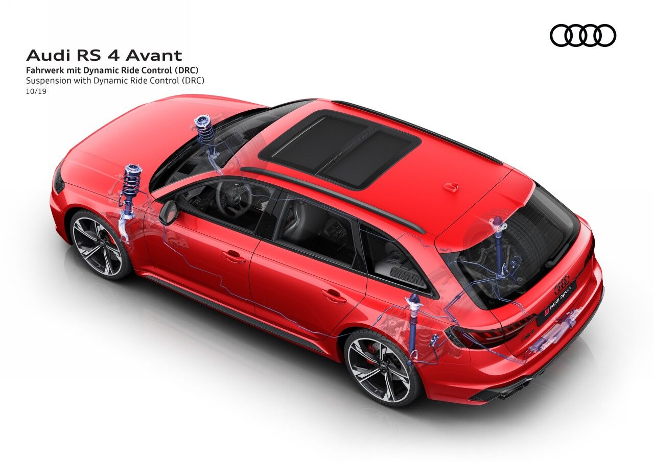El nuevo Audi RS 4 Avant viene equipado de fábrica con llantas de aluminio forjado de 19 pulgadas envueltos en neumáticos 265/35. Varios diseños de 20 pulgadas están disponibles bajo pedido, así como unas gomas 275/30. Los frenos quedan compuestos por discos perforados de 375 mm en el eje anterior y 330 mm en el posterior Opcionalmente, se pueden pedir discos carbocerámicos para las ruedas delanteras de 400 mm de diámetro.
