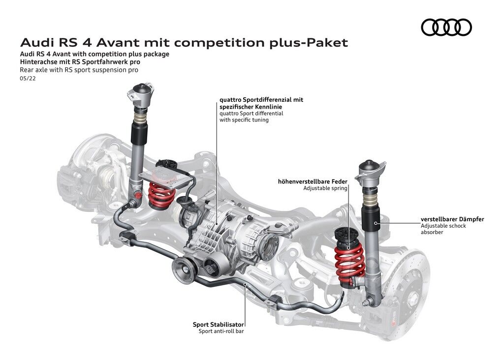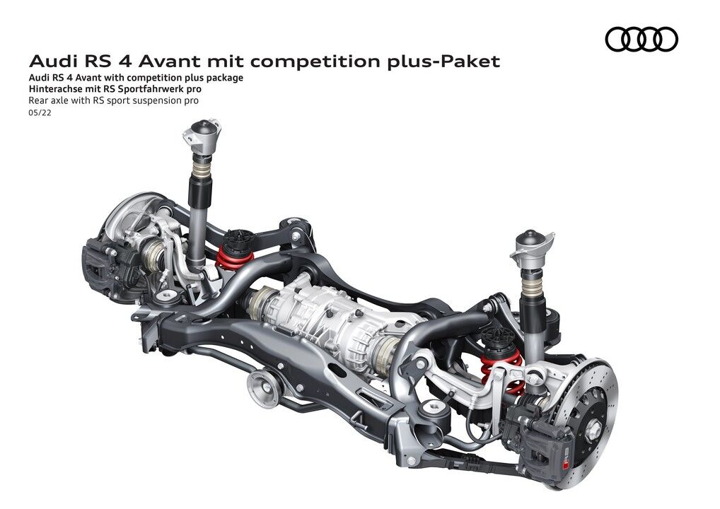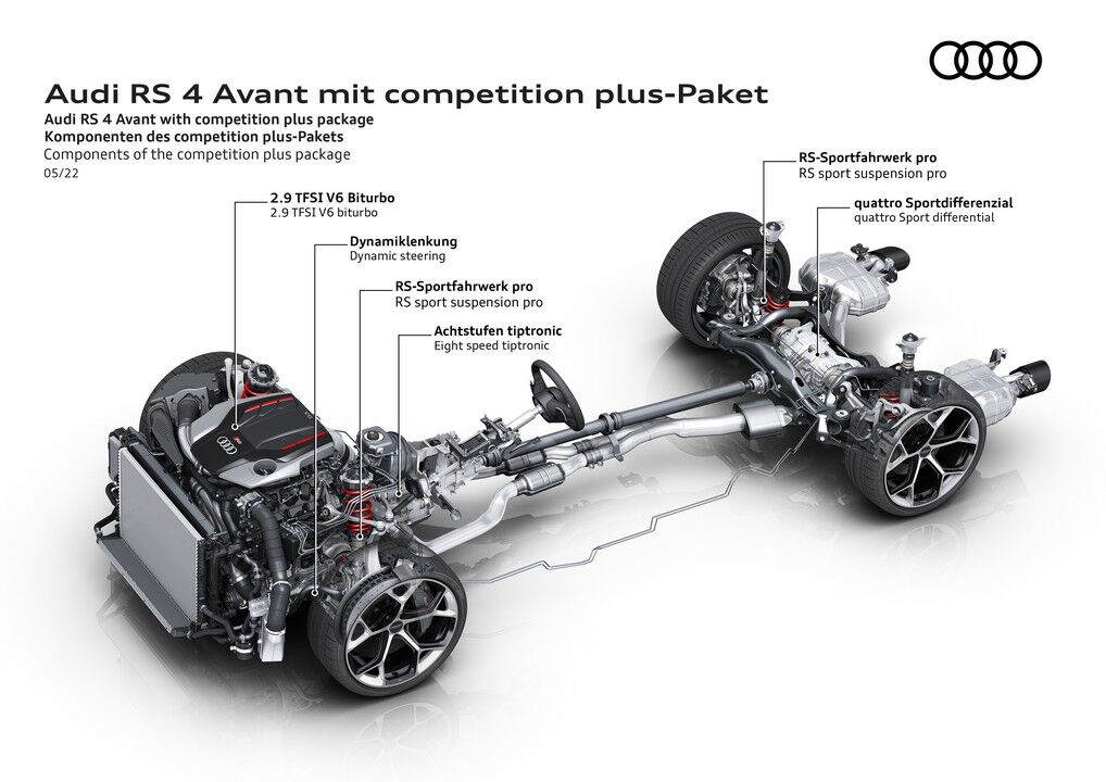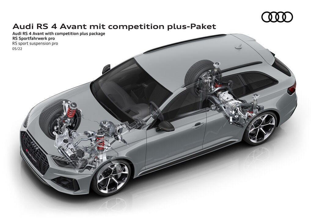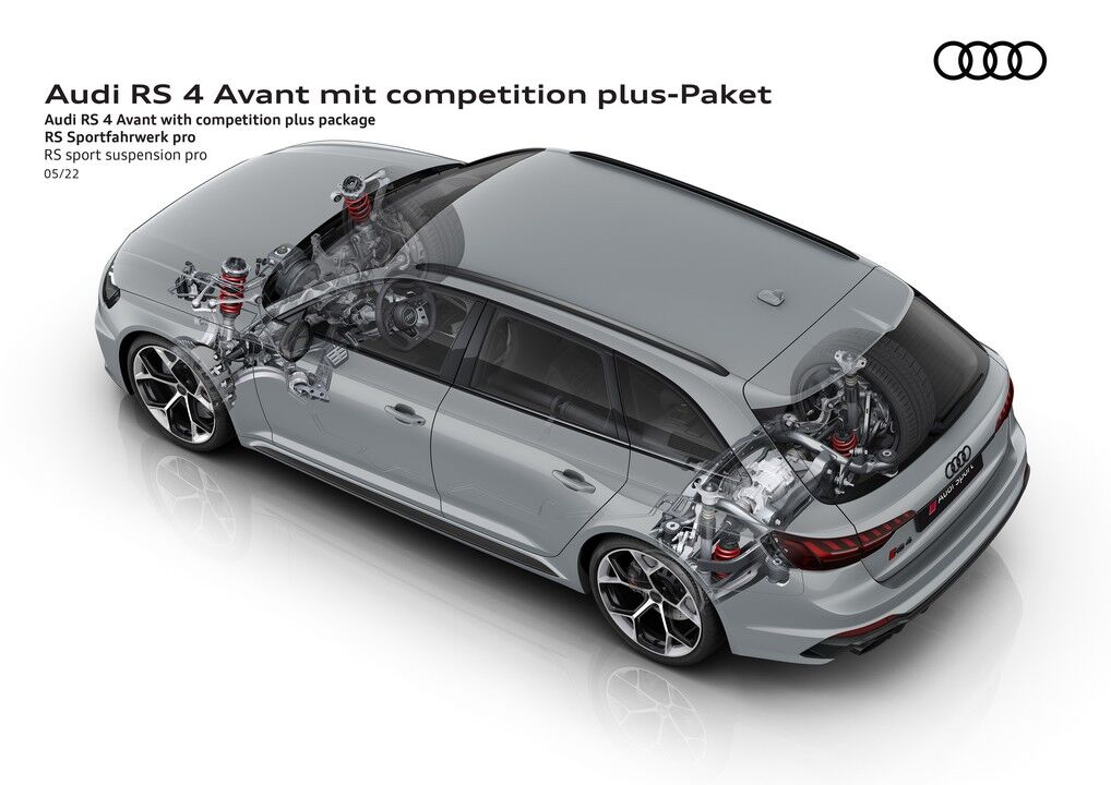 Otros componentes que incluye el RS 4 Avant Competition Plus son unas barras estabilizadoras más rígidas y una dirección más rápida, con una desmultiplicación de 13,1: 1 en vez de 15,9: 1. Asimismo, el diferencial trasero tiene un tarado diferente para darle “mayor protagonismo” al eje posterior, especialmente en el modo de conducción Dynamic. También estrena un software específico para la transmisión que permite hacer cambios más rápidos, bajando en el sprint de 0 a 100 km/h hasta los 3,9 segundos y aumentando la punta hasta los 290 km/h.
