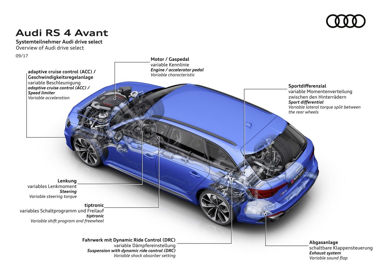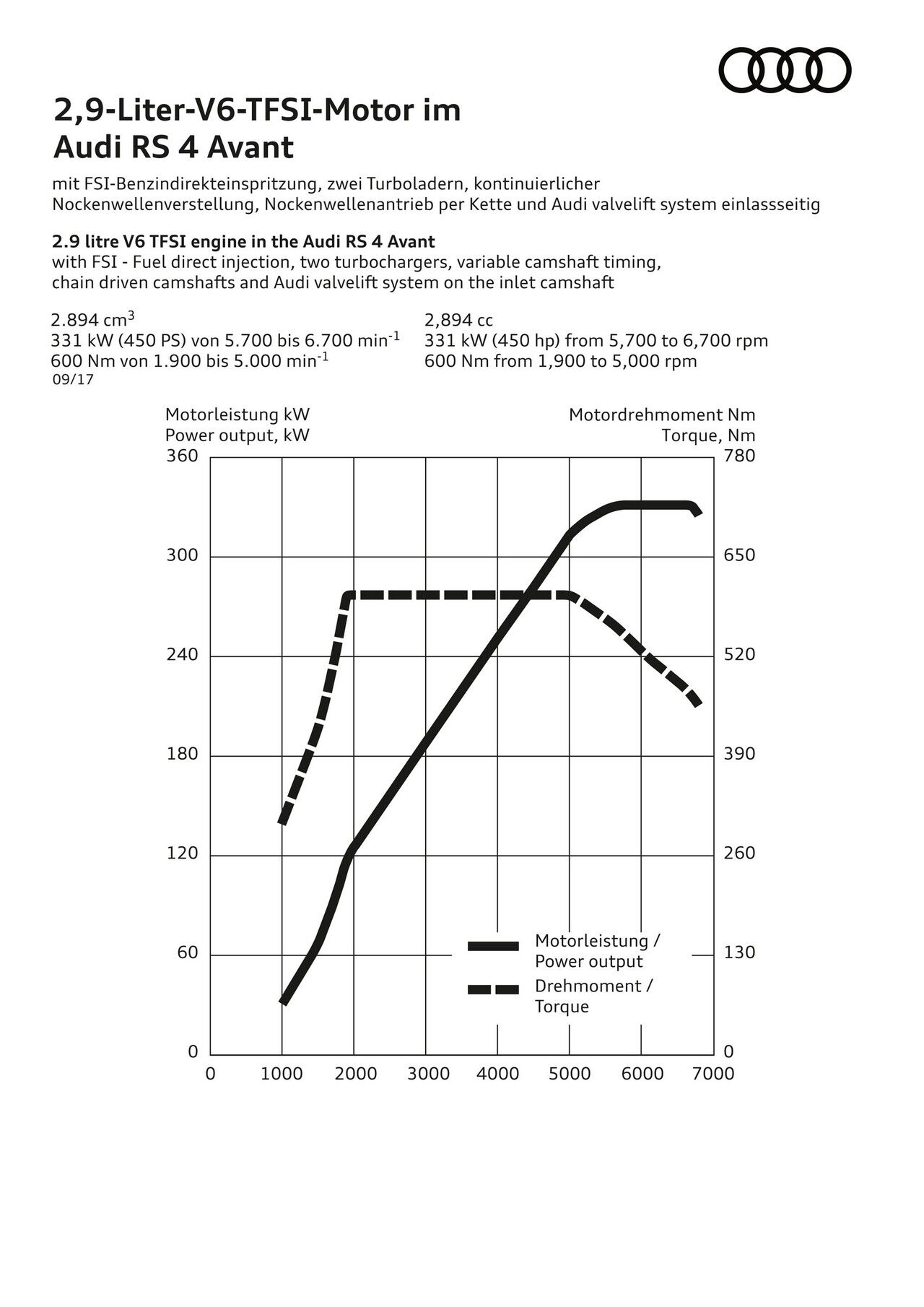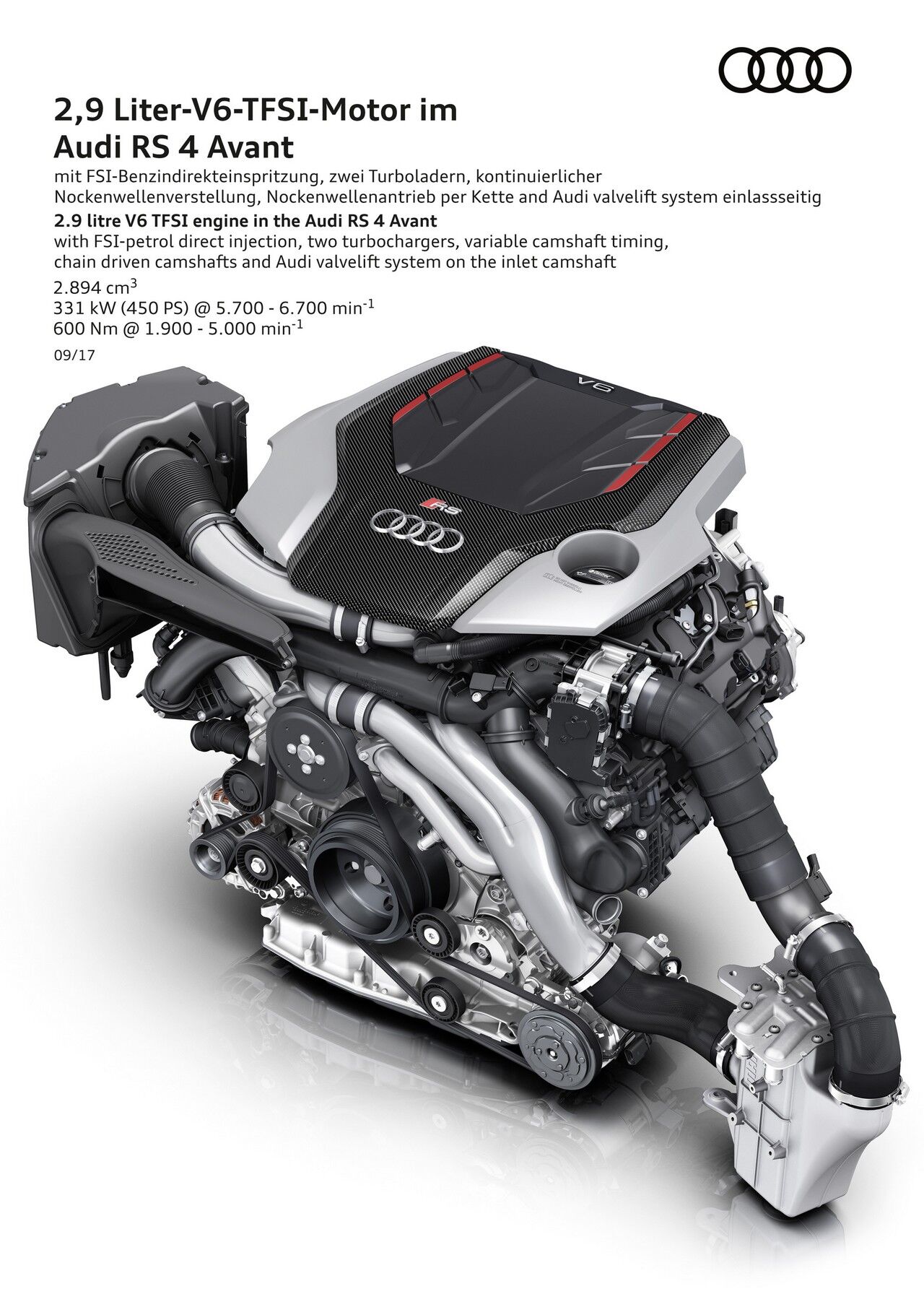 La marca asegura que este propulsor, con 155 CV/litro, se ha inspirado en el 2.7 V6 del RS 4 Avant de 1999. Con él bajo el capó, el Audi RS 4 Avant 2018 acelera de 0 a 100 km/h en 4,1 segundos y puede alcanzar los 250 km/h (280 km/h con el paquete RS dynamic).