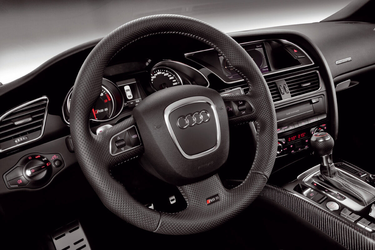 En el exterior llama la atención el alerón retráctil que lleva el RS5. Se despliega cuando se circula a partir de una velocidad de 120 km/h y se oculta cuando la velocidad es menor de 80 km/h. El cliente podrá escoger además un paquete decorativo con piezas de fibra de carbono y otros dos con piezas negras o de aluminio mate. En el interior, los asientos son de estilo deportivos y van tapizados en Alcantara y cuero. El carbono y el aluminio forman parte también de la decoración del interior.