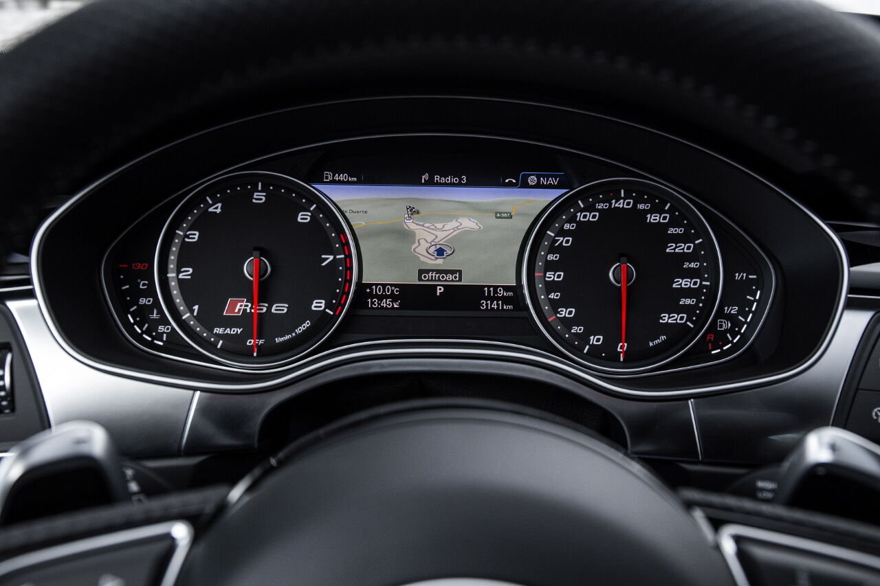 En el diseño interior del Audi RS 6 Avant destaca su elegante acabado en negro. El familiar incluye el sistema MMI Navigation Plus, asientos delanteros deportivos S con ajustes eléctricos y función memoria, climatizador automático de cuatro zonas, ayuda al aparcamiento y cámara de visión trasera.