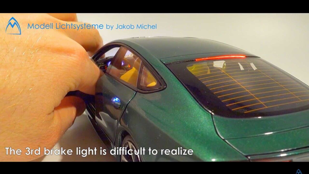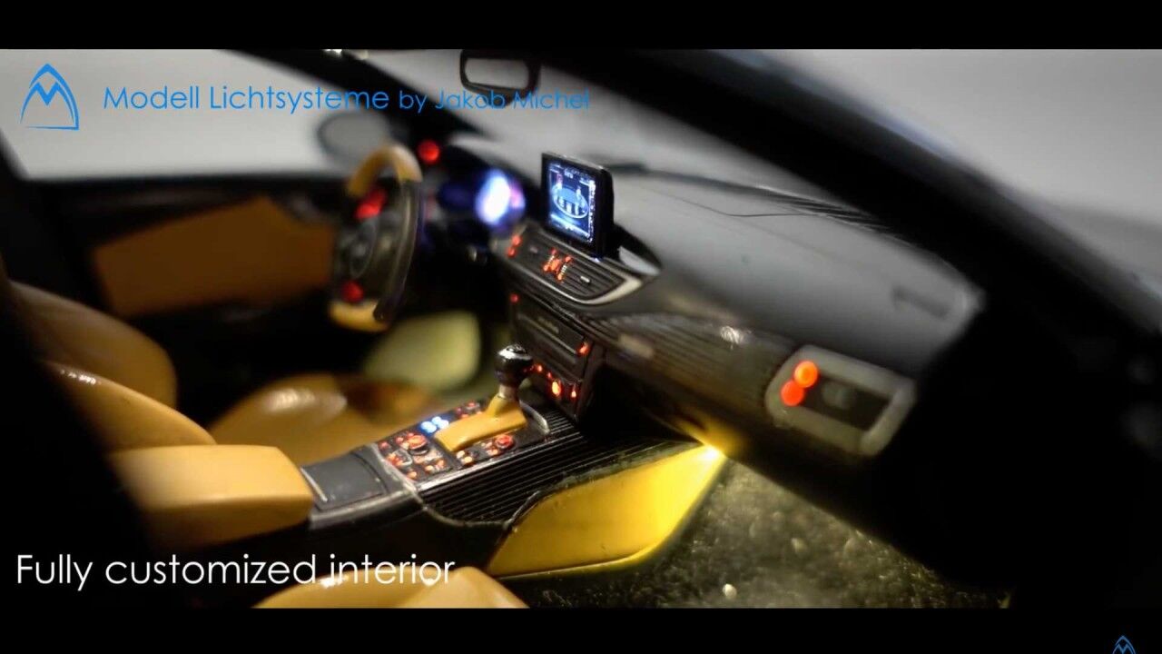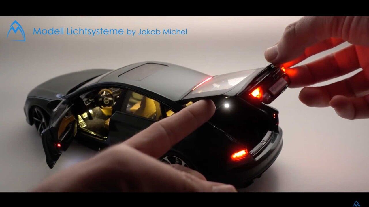 Pero los chicos de Modell Lictsysteme también añadieron más cositas aparte de las luces: calcomanías de fibra de carbono, modificaciones en los frenos o ruedas personalizadas. Todo el sistema de iluminación funciona a través de interruptores magnéticos ocultos en la carrocería de la maqueta. Pero los imanes no encienden todas las luces. Al abrir las puertas, se activa la luz interior del techo, mientras que al abrir la puerta del maletero se enciende la correspondiente.