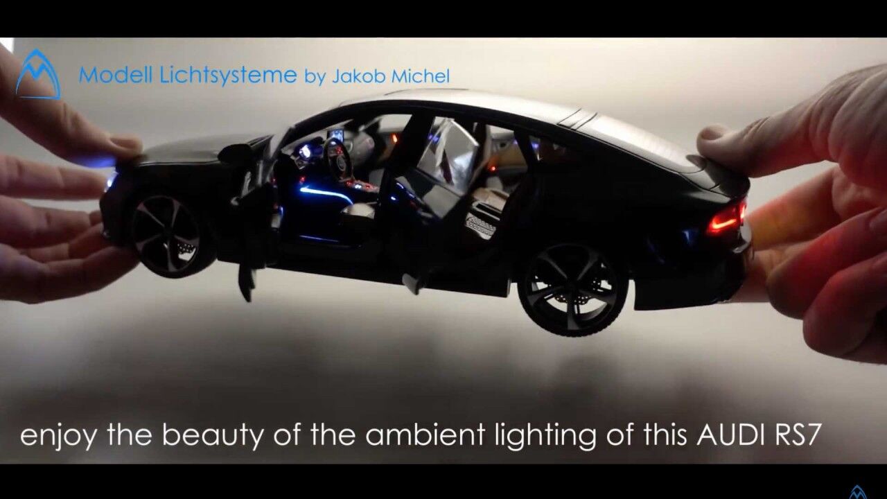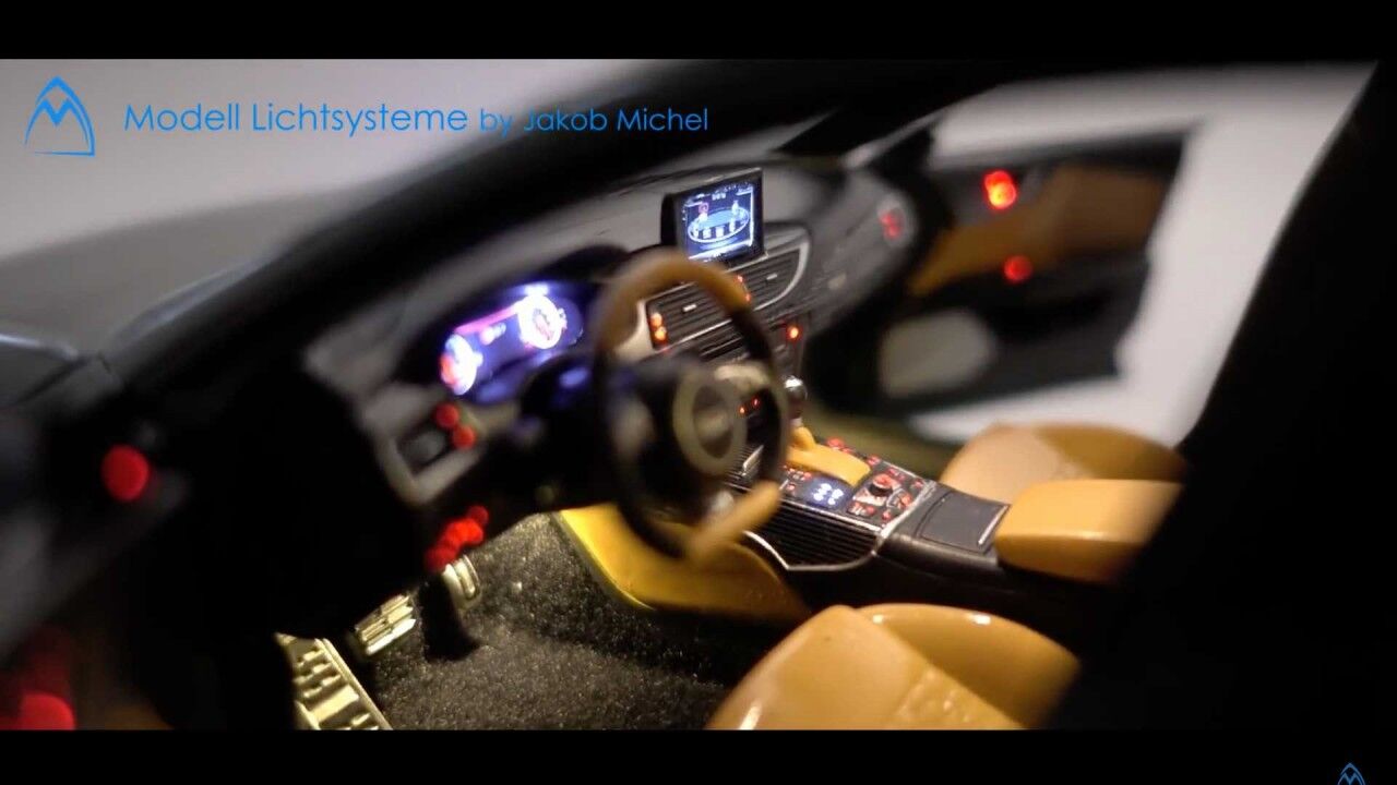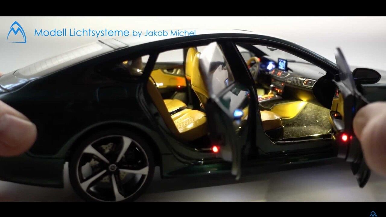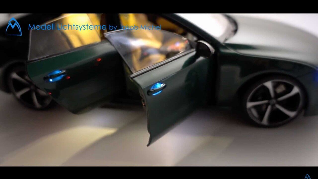 Pero los chicos de Modell Lictsysteme también añadieron más cositas aparte de las luces: calcomanías de fibra de carbono, modificaciones en los frenos o ruedas personalizadas. Todo el sistema de iluminación funciona a través de interruptores magnéticos ocultos en la carrocería de la maqueta. Pero los imanes no encienden todas las luces. Al abrir las puertas, se activa la luz interior del techo, mientras que al abrir la puerta del maletero se enciende la correspondiente.