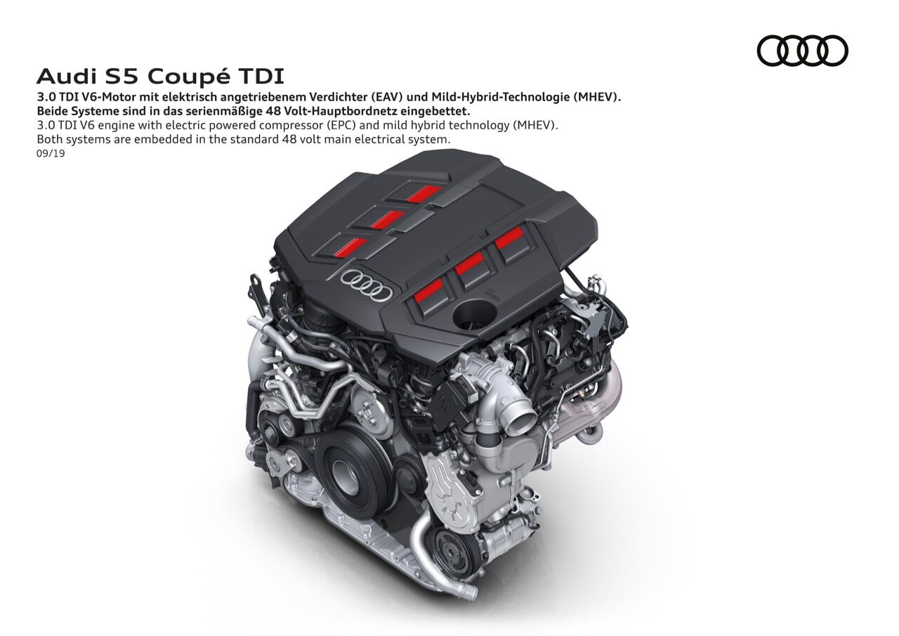 Los Audi S5 TDI llegan con una potencia de 347 CV y 700 Nm de par. Se consiguen gracias a la tecnología Mild Hybrid con sistema eléctrico de 48 voltios y también a un compresor eléctrico que apoya a los turbos. Esa solución que ya fue vista en el Audi SQ7 es capaz de girar a 65.000 rpm para que el aire llegue constantemente a la turboalimentación y que la respuesta sea inmediata, eliminando el conocido lag de estas mecánicas.