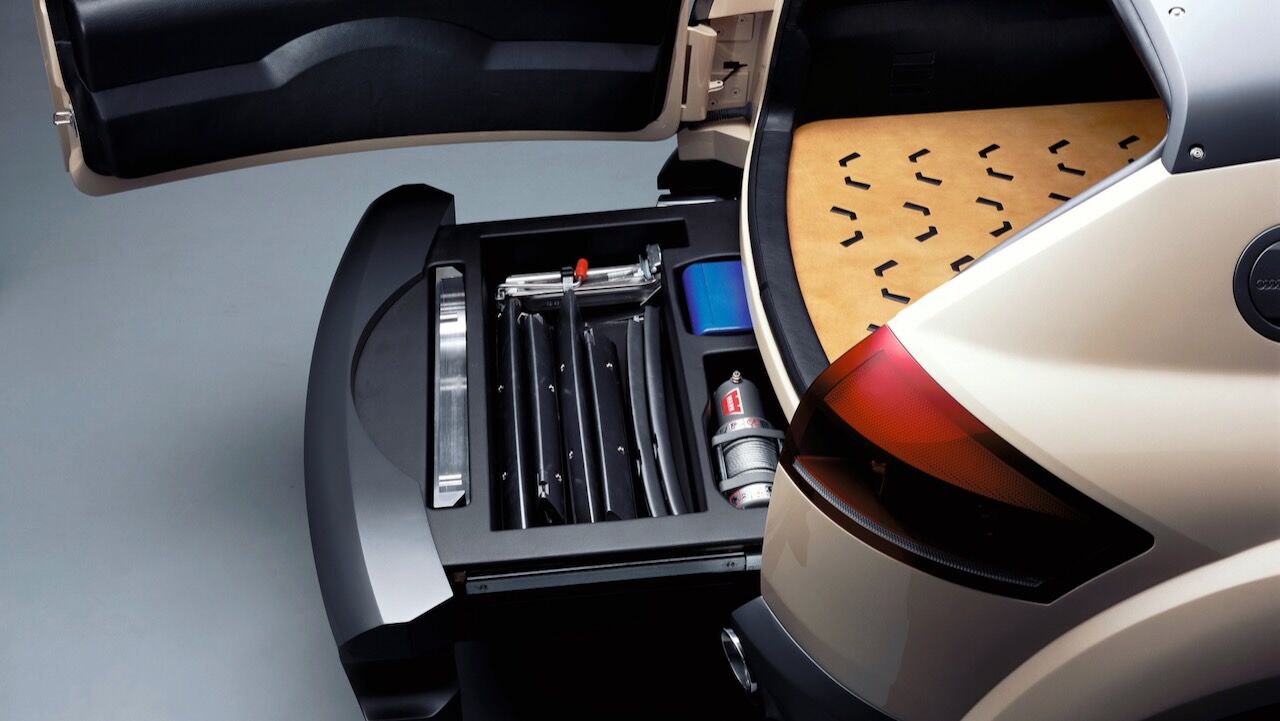 El habitáculo de corte deportivo estaba forrado en cuero y lucía controles metálicos cepillados, ofreciendo un ambiente refinado pero muy funcional. En la parte trasera, el portón se abría de forma lateral e incluía una luneta que descendía automáticamente para facilitar el acceso y la carga del equipaje. Además, contaba con un ingenioso cajón extraíble bajo el paragolpes posterior que servía para ocultar la rueda de repuesto o un completo kit de supervivencia con un cabestrante.