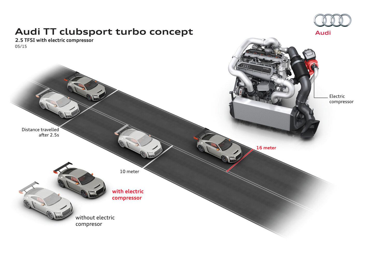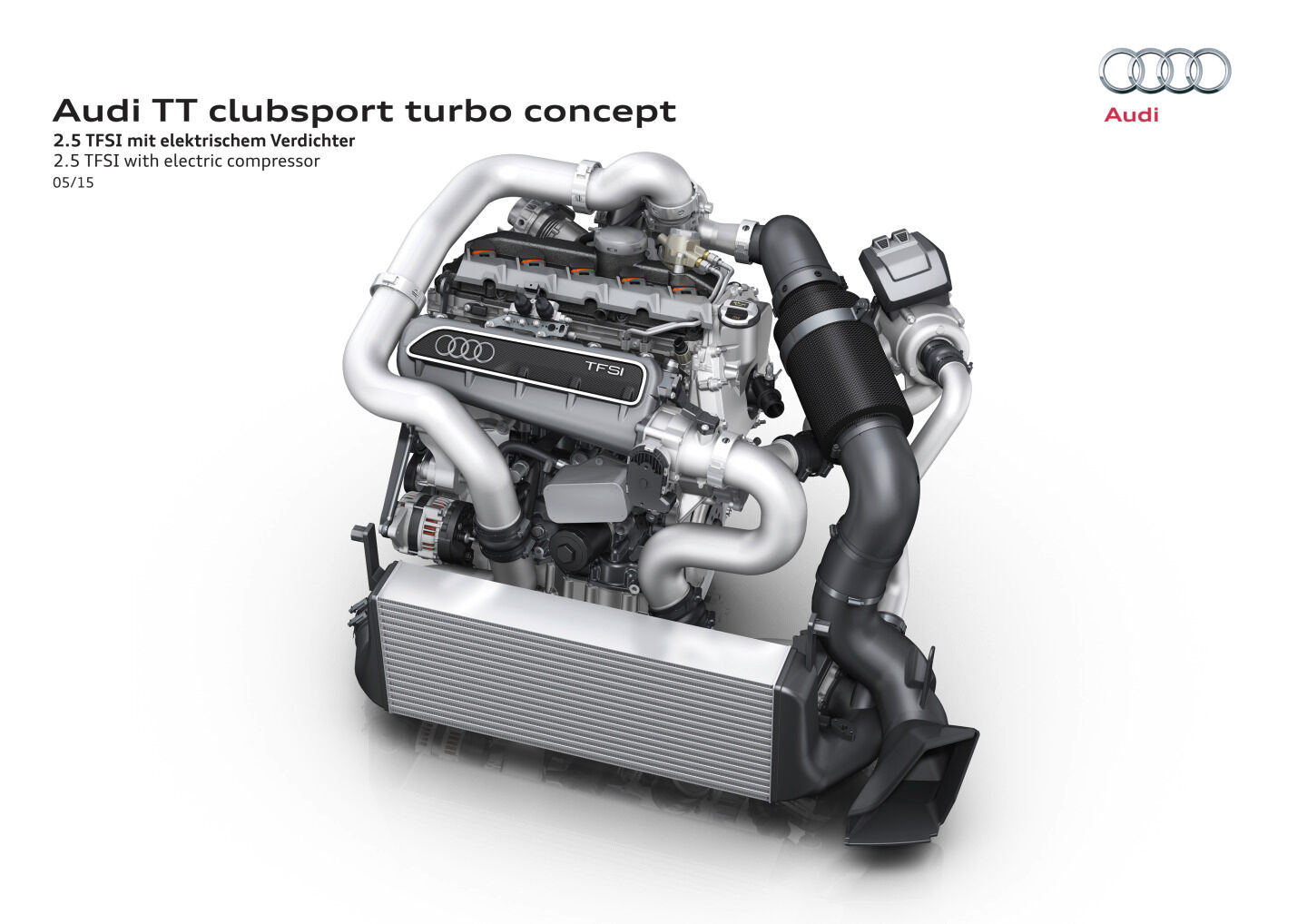 Pero volvamos a la actualidad. El Audi TT clubsport turbo monta un propulsor 2.5 turbo de cinco cilindros, similar al que equipan los Audi RS 3 y RS Q3, pero que en este prototipo rinde 600 CV y tiene un par máximo de 650 Nm entre 3.000 y 6.000 rpm. ¿Cómo? Gracias a un biturbo eléctrico con un sistema eléctrico de 48 voltios, que suministra energía eléctrica al turbocompresor, mientras que la energía que se genera durante el frenado se almacena en una batería de iones de litio compacta situada en el maletero.