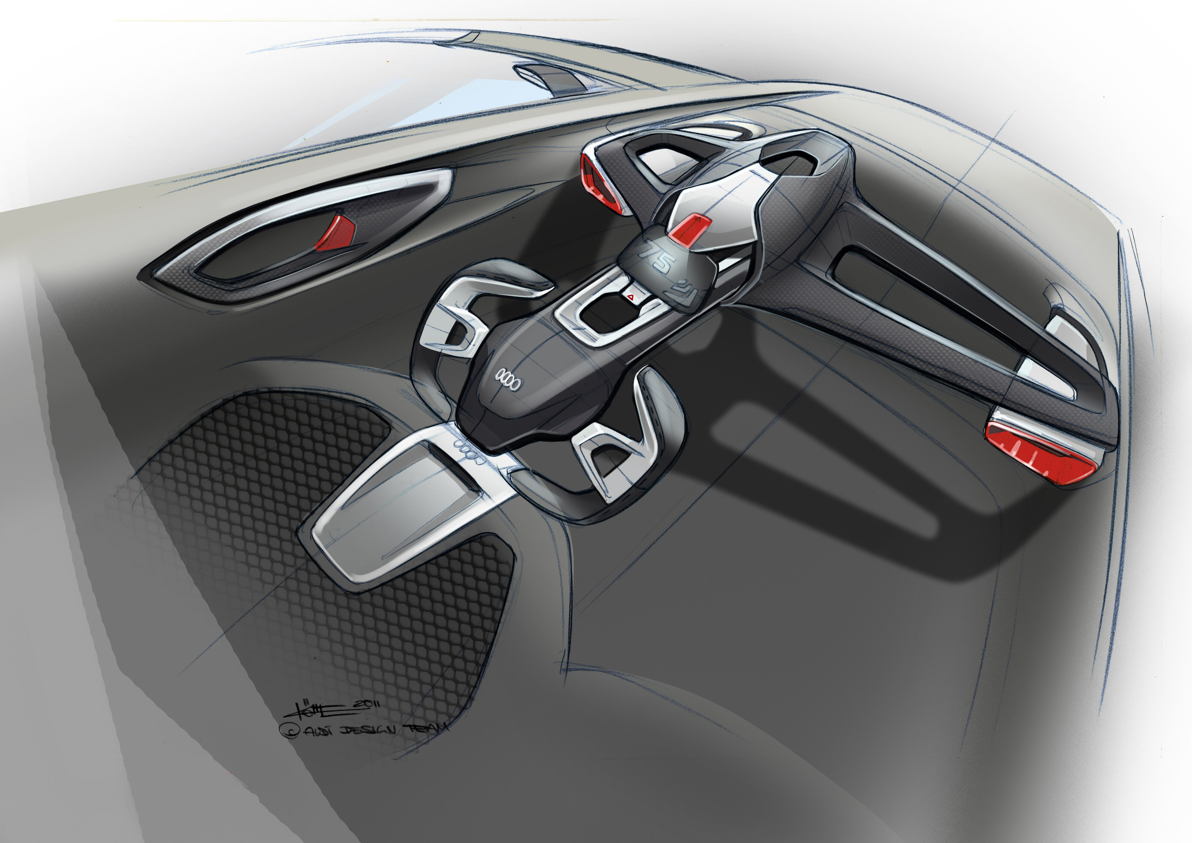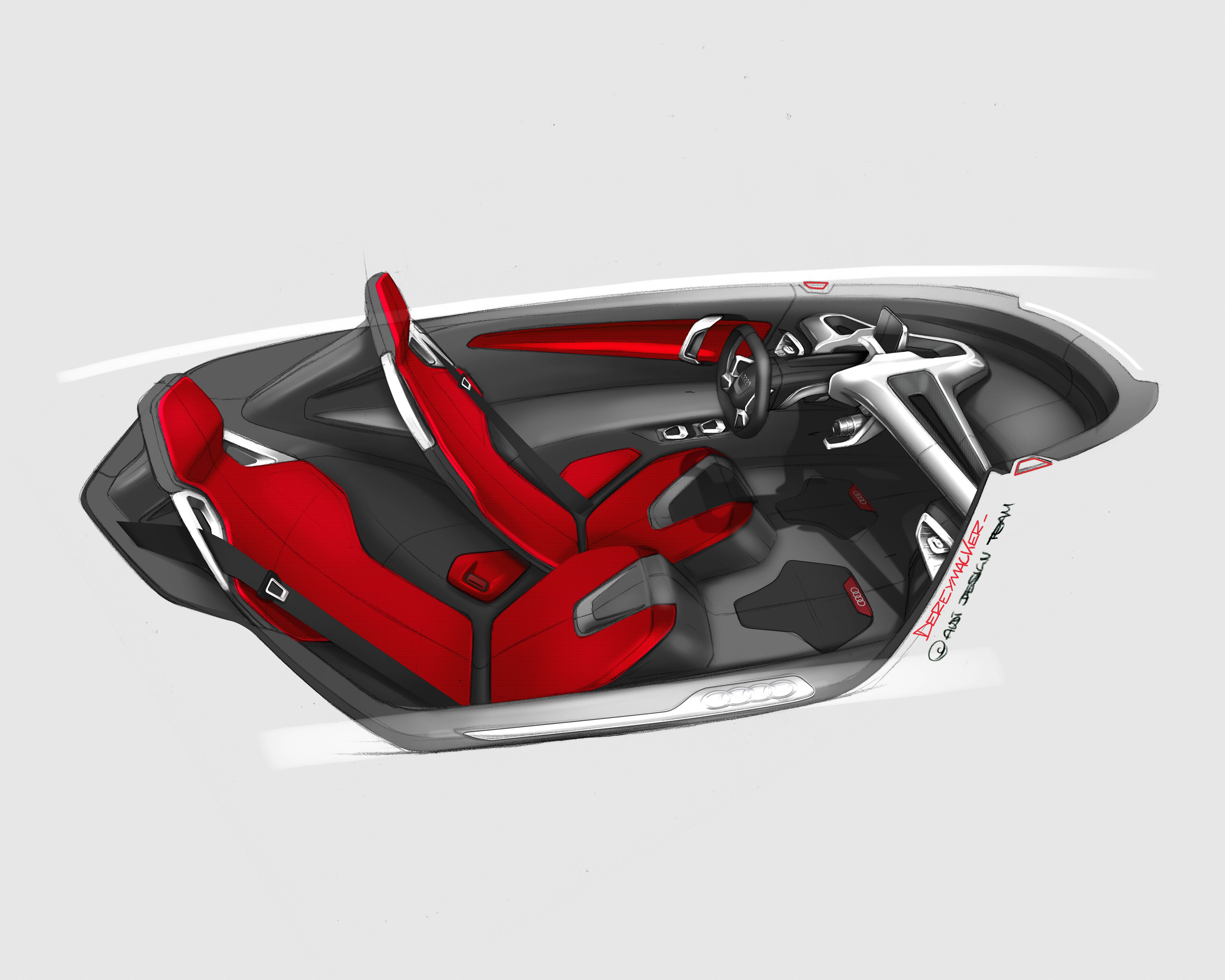 Dentro, Audi asegura que hay espacio para dos personas, que irán a muy baja altura. La posición de los coupantes está ligeramente escalonada, lo que recuerda a los deportivos. El conductor puede ajustar la disposición del volante y los pedales a la medida de su cuerpo y al coche se entra a través del portón trasero. El techo está diseñado para ser manejado fácilmente y se abre deslizando hacia atrás.