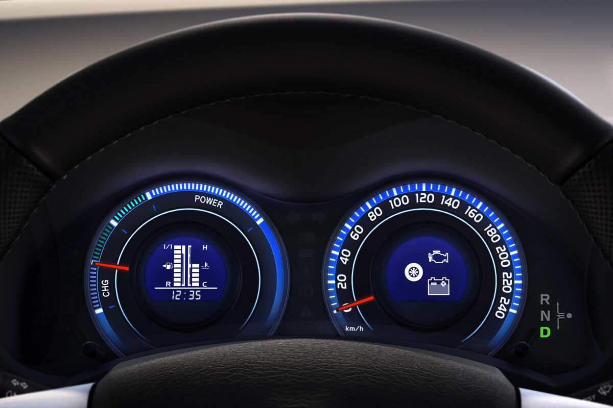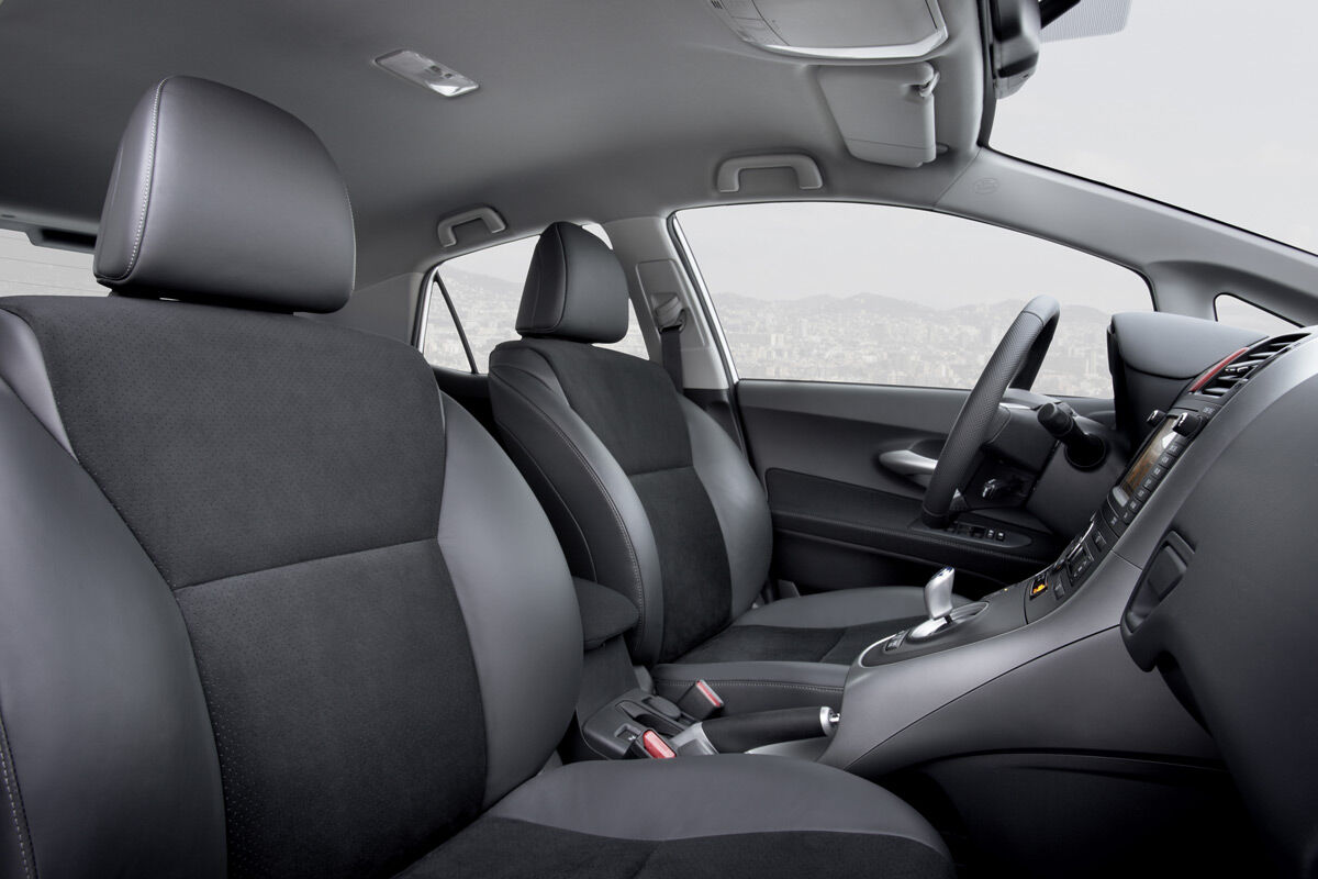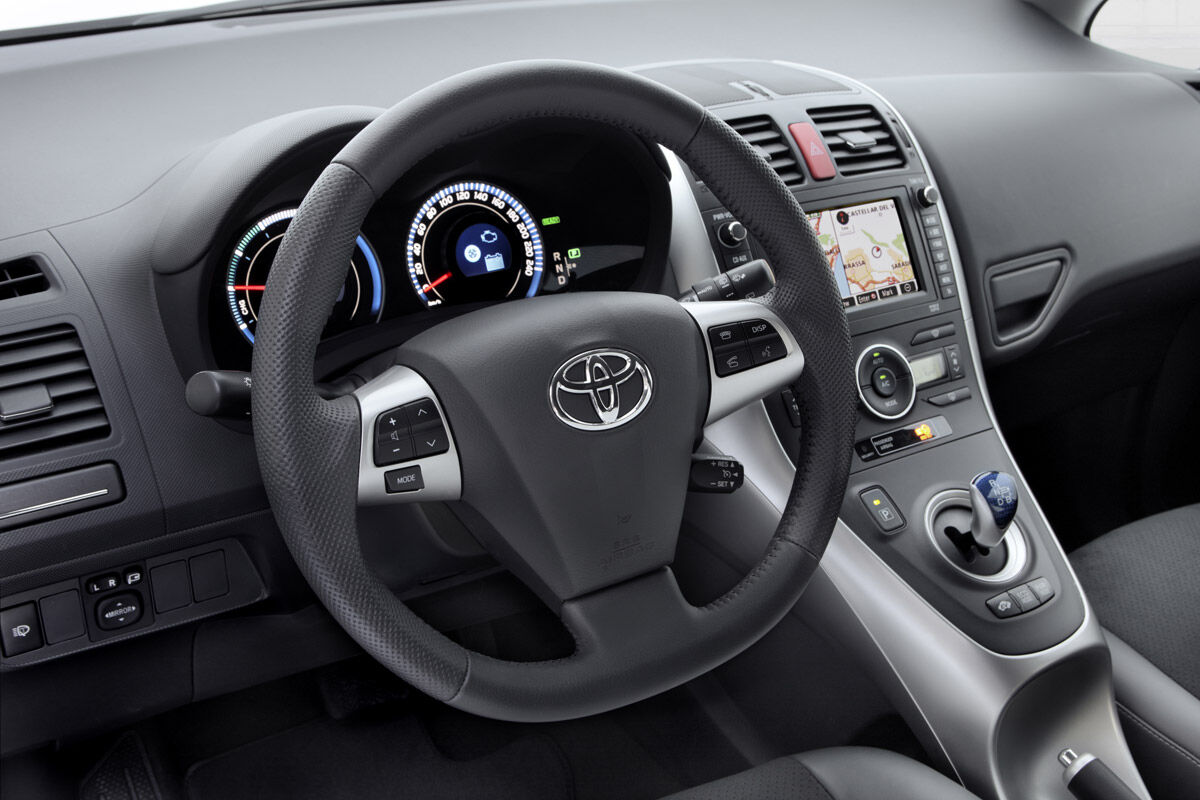 El interior de este modelo es prácticamente igual que el de cualquier otro Auris. Las diferencias se aprecian en la instrumentación específica que lleva esta versión híbrida. El cuentarrevoluciones ha sido sustituido por un indicador con tres tramos diferentes: uno para ver la recuperación de energía, otro que indica si se está realizando una conducción eficiente y un tercero bajo la denominación Power. Además, la tapicería de esta versión es diferente así como la iluminación azulada del cuadro de instrumentos.