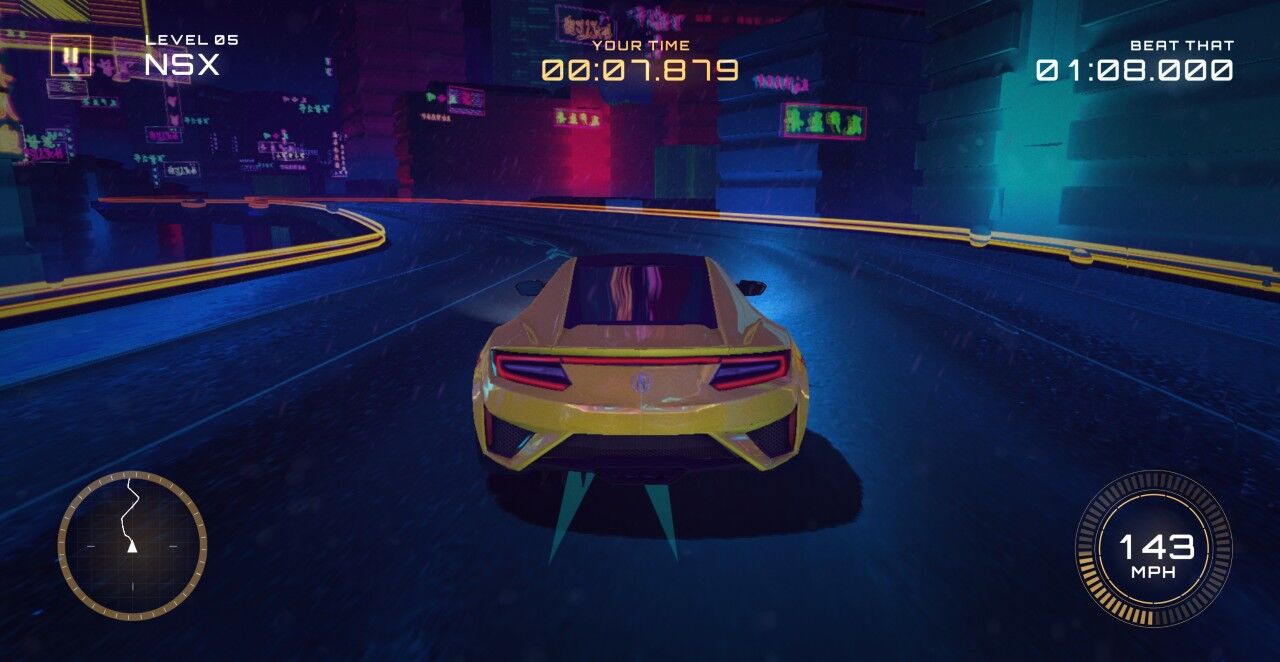 En “Beat That”, cada coche recibe un guiño a los videojuegos de su época. El primer NSX y el primer nivel (“Playa de 8 bits”) se desarrolla a lo largo de una carretera costera bordeada de palmeras que recuerda al mencionado “OutRun” (SEGA), mientras que otros niveles nos trasladan a los gráficos de “Gran Turismo” (Sony), “Ridge Racer” (Bandai-Namco) y “Midnight Run” (Konami). Los protagonistas incluyen desde deportivos a un SUV y un prototipo de resistencia.