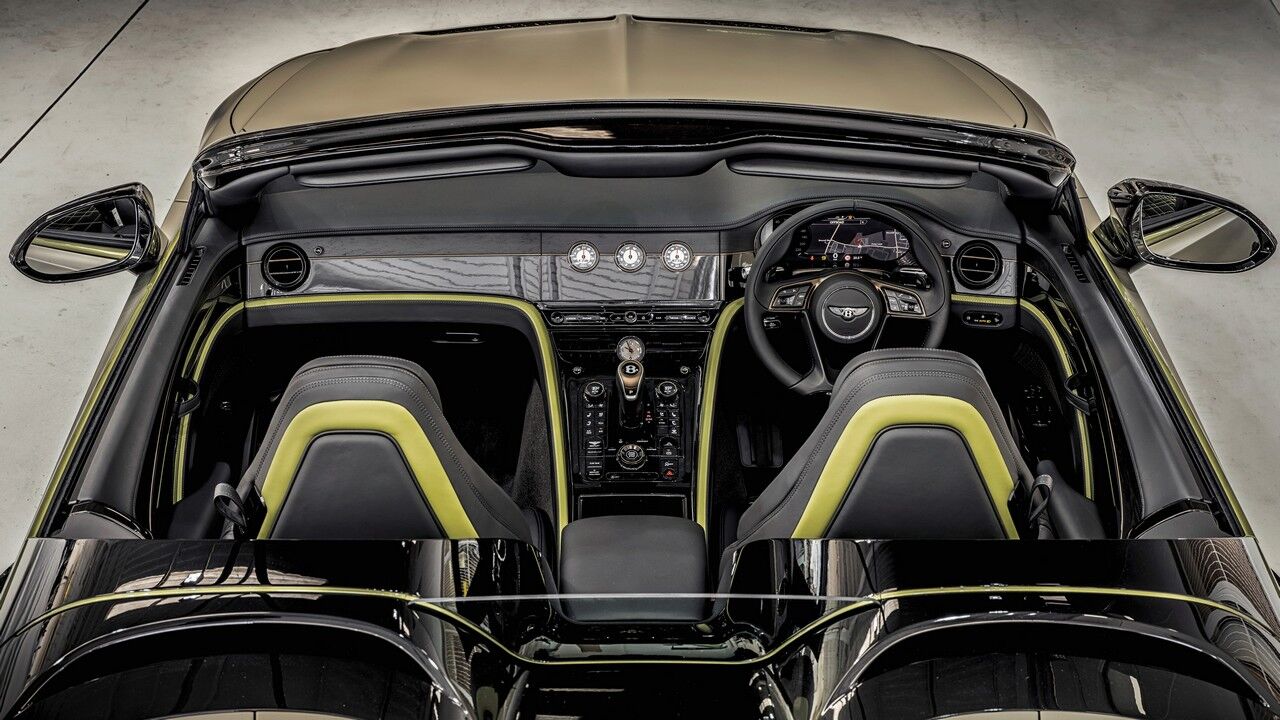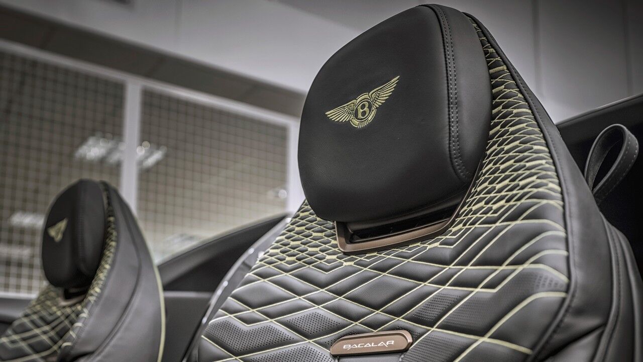 El interior de Bacalar primigenio sigue la misma tendencia en negro y verde. El cuero Beluga está acentuado con más cuero Moss Green en las alas de la consola, los respaldos exteriores de los asientos y en toda la cabina como costuras de contraste a través del patrón de acolchado único de Bacalar. Los centros de los asientos emplean cuero napa fina, mientras que la moqueta son tapetes tallados en diamantes con ribetes y costuras en verde musgo. También hay detalles en bronce satinado que fluyen a través de la cabina hacia las puertas y tras los asientos.