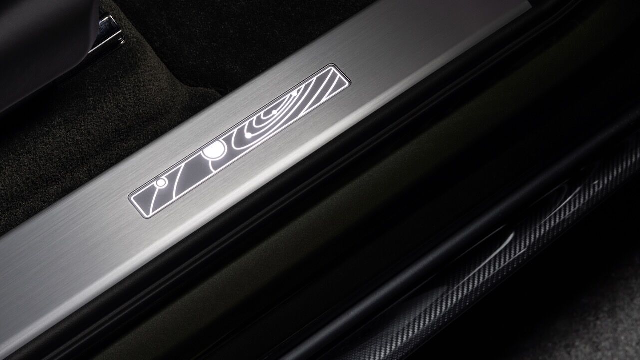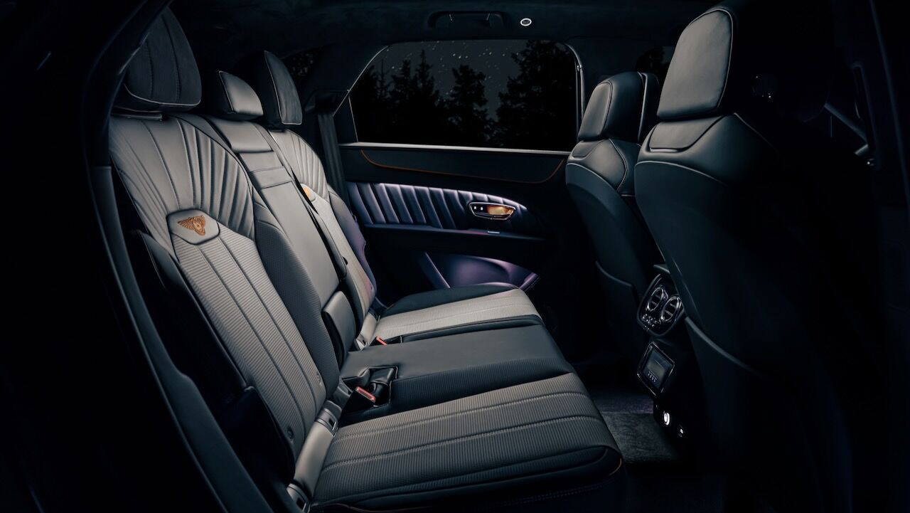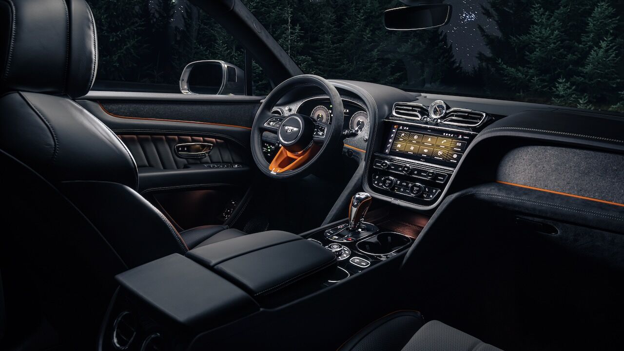 El Bentley Bentayga Space Edition lleva la Blackline Specification para tener faros y pilotos oscurecidos y también incorpora una serie de acentos en Orange Flame haciendo contraste. Esa misma línea se sigue en el habitáculo, al que se accede a través de unos umbrales iluminados. Hay molduras Galaxy Stone en el tablero, una piedra que le da un toque de lujo y distinción. La tapicería de cuero beluga y marsopa cuenta con un patrón específico, mientras que el sistema de sonido Naim for Bentley va iluminado.