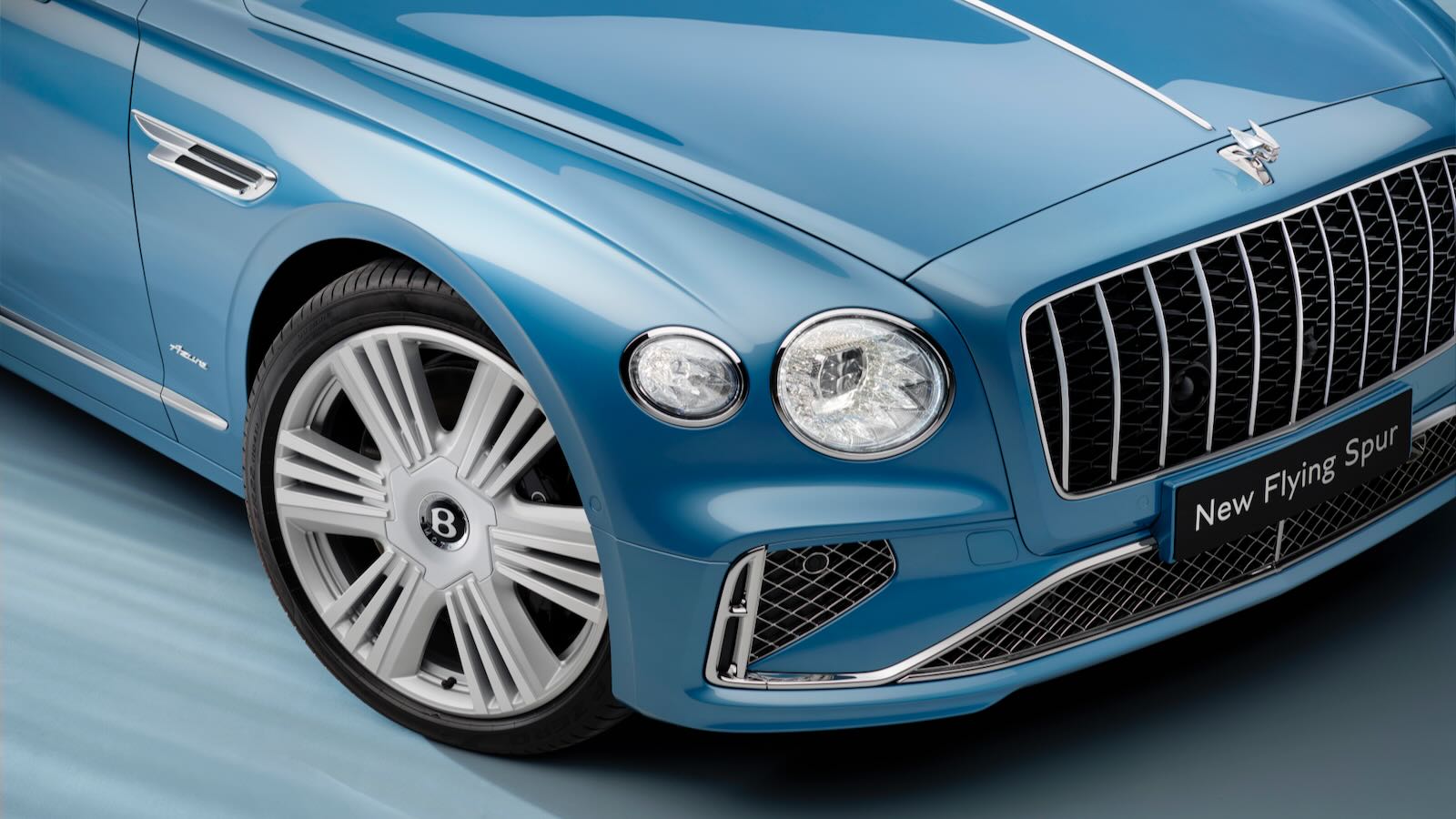 - Flying Spur core: Presume de parrilla negra brillante, rejillas inferiores negras mate y salidas de escape ovaladas cromadas. En el interior encontramos asientos con acanalado recto y logos Bentley bordados.