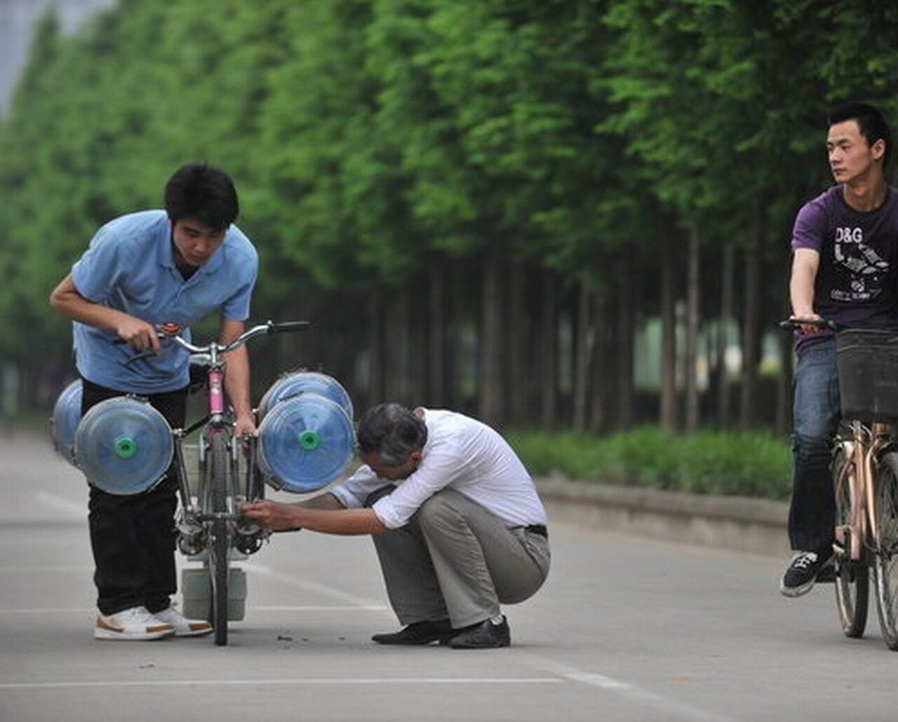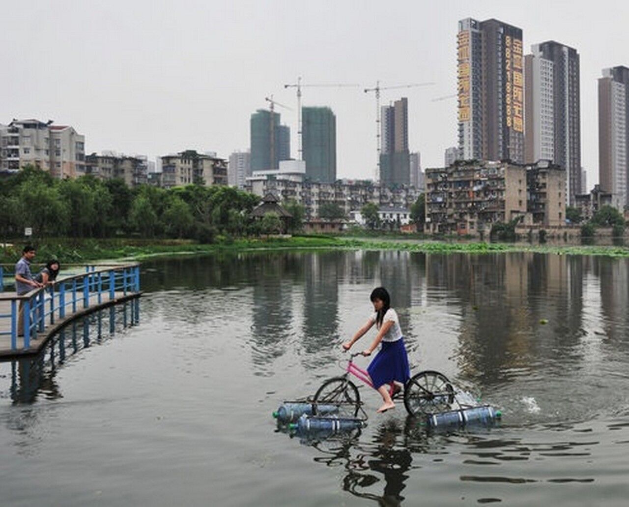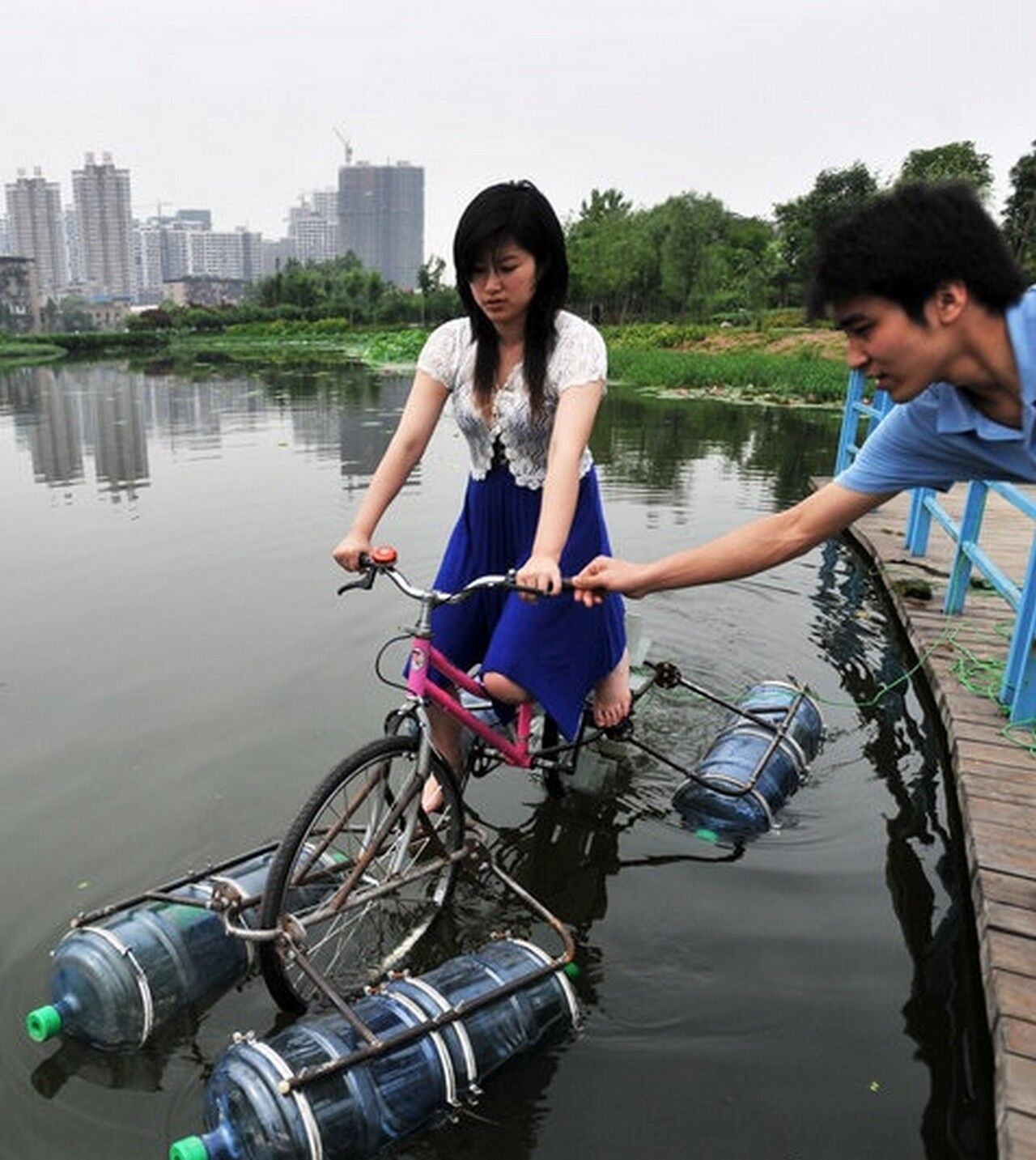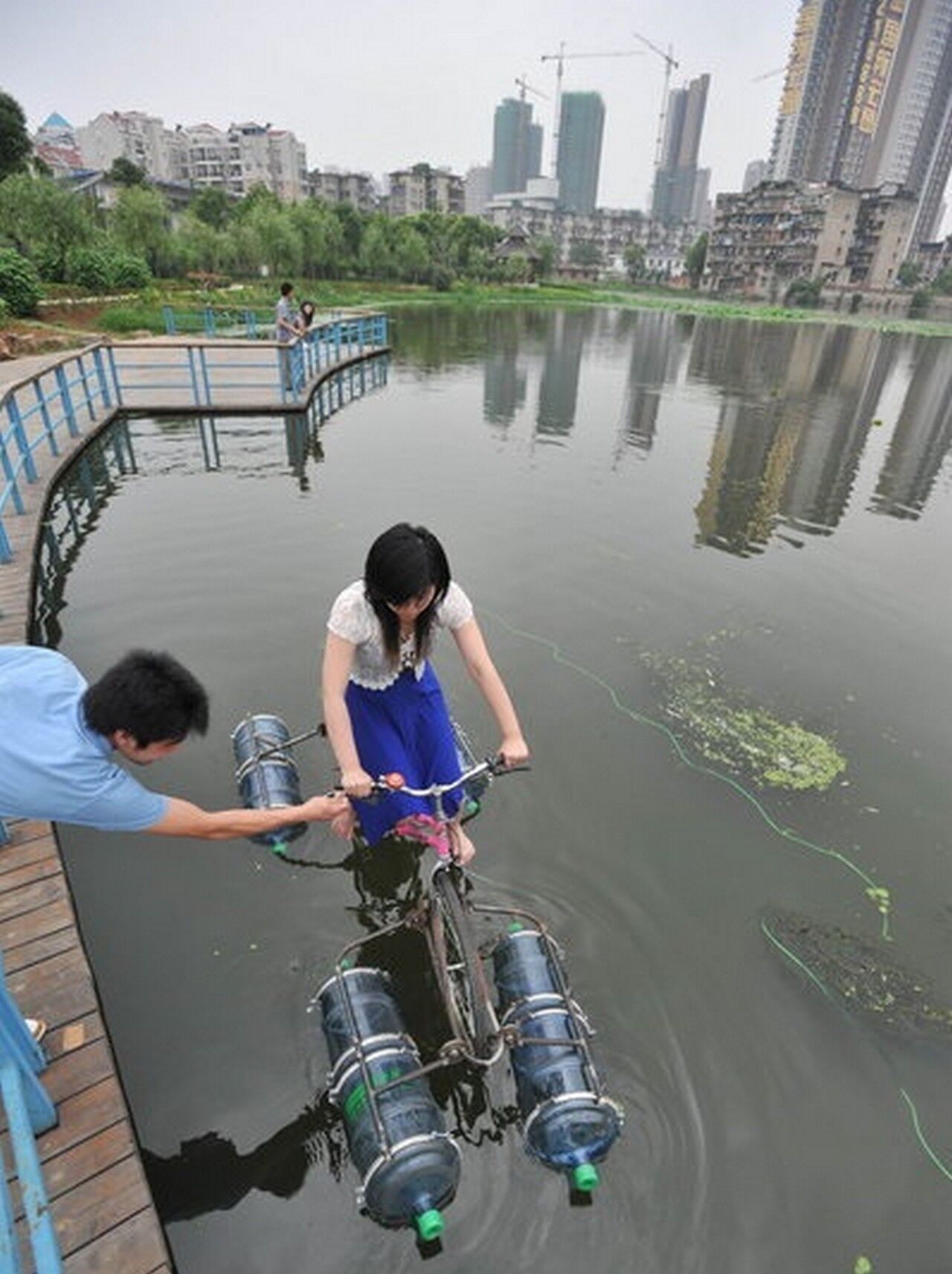 Otro caso de bicicleta anfibio se encuentra en China, el inventor, Li Weiguo, es un señor y la encargada de probar el prototipo, en un lago de un parque chino es su hija.