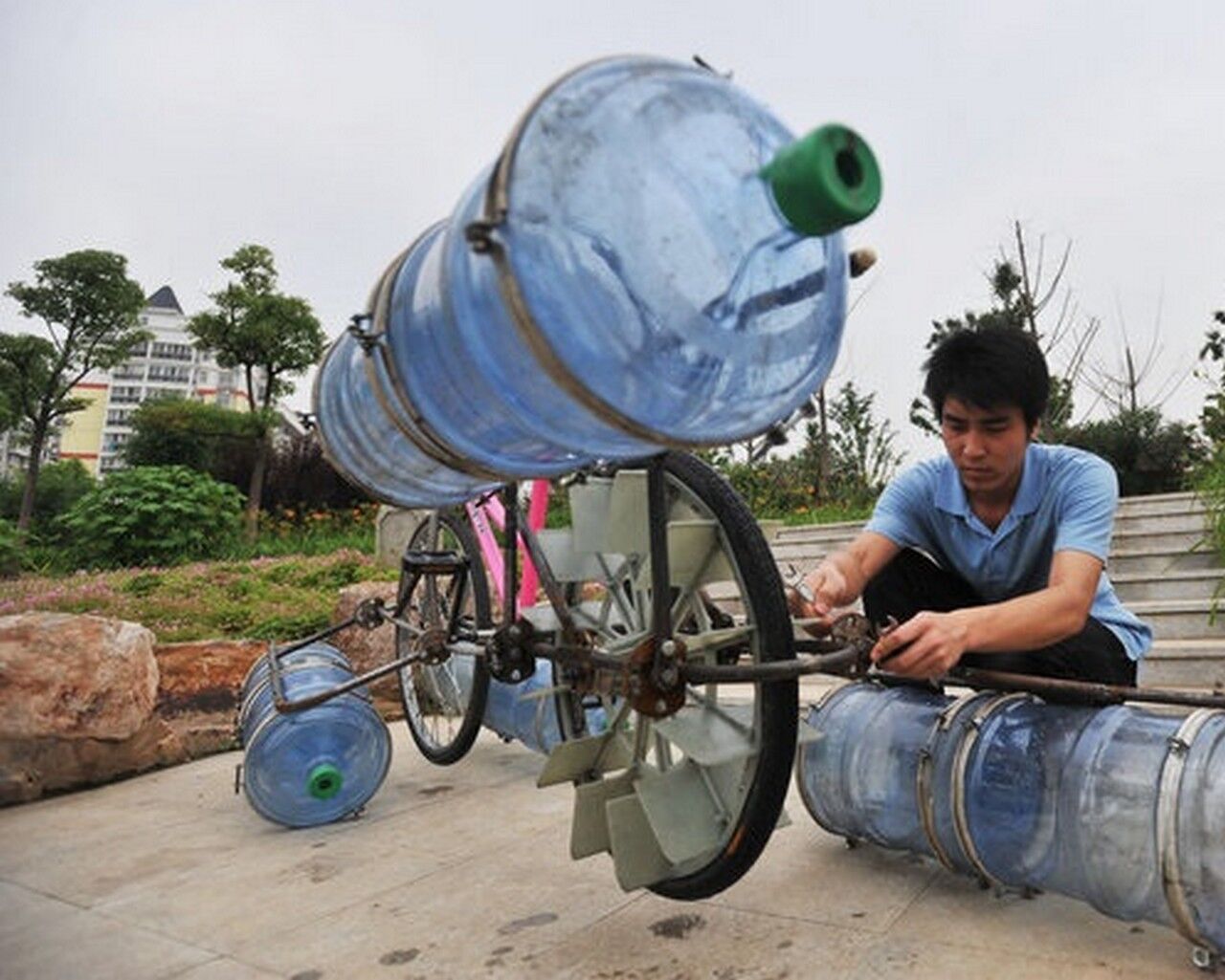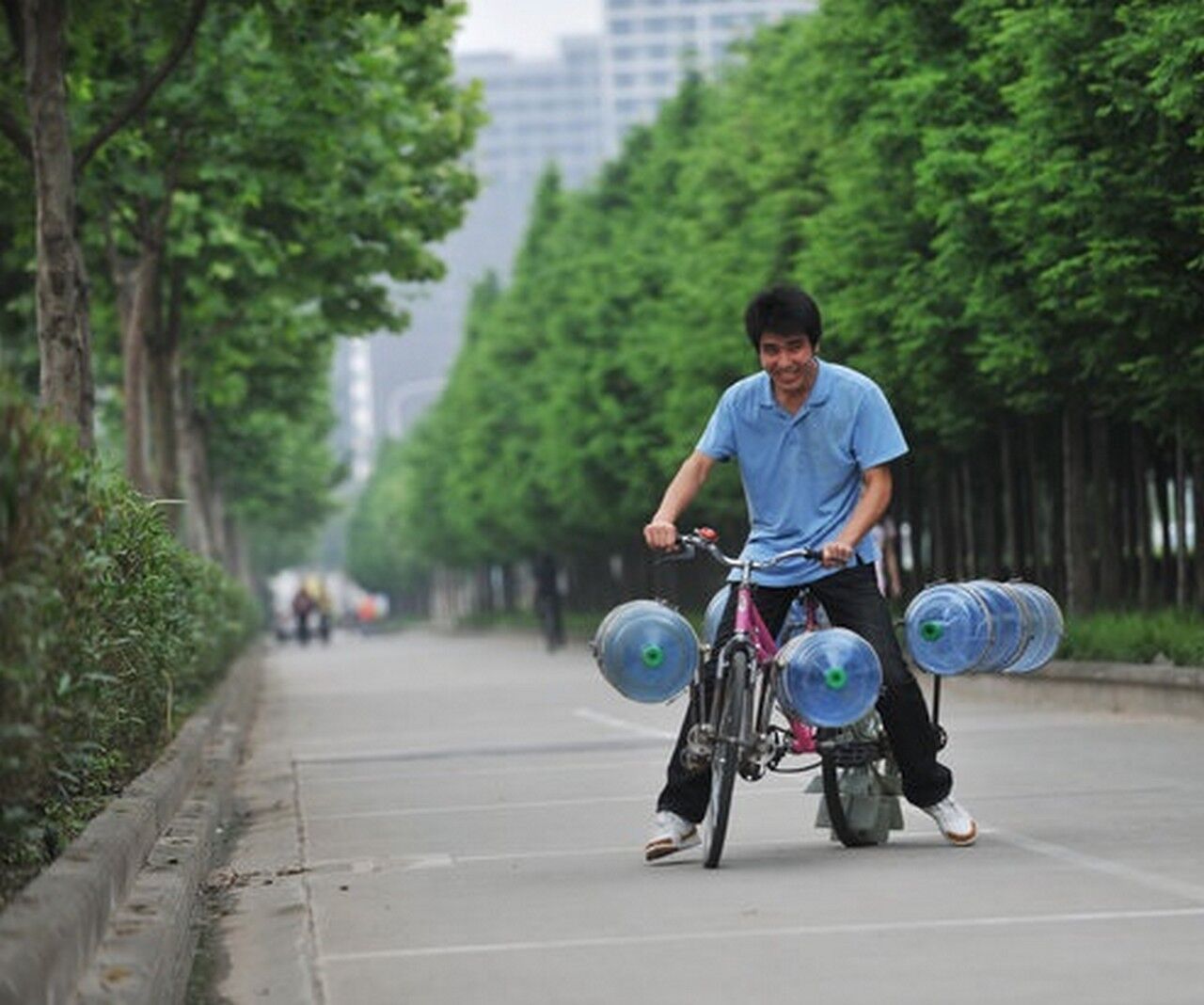 Allá por el año 2009, esta bicicleta anfibio circulaba por el agua de Wuhan en la provincia de Hubei con ocho bidones vacíos y ruedas con aletas ajustables en la rueda motriz, la trasera. Lo bueno, no hace falta mucha modificación a parte de la adaptación de la estructura para los bidones, el resto es completamente válido para la carretera.
