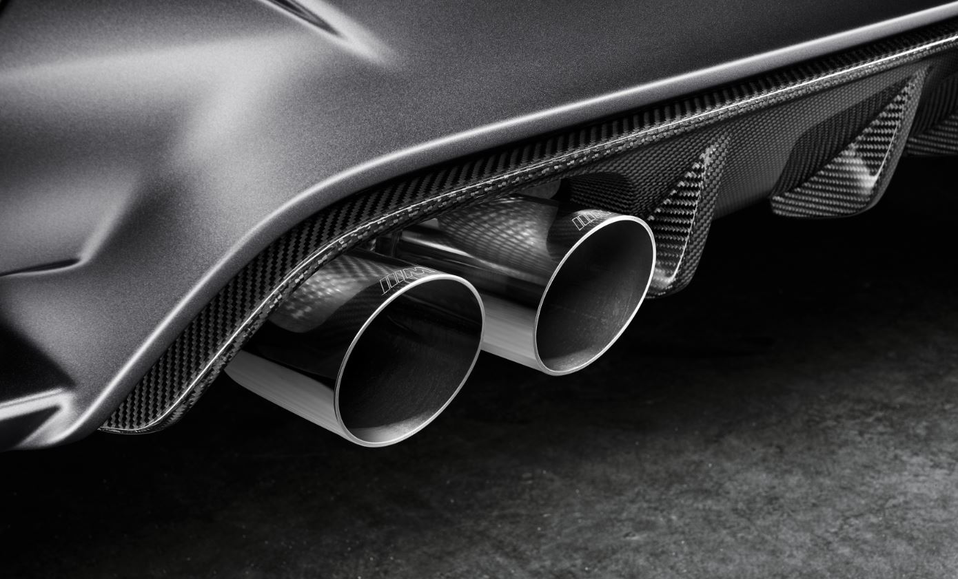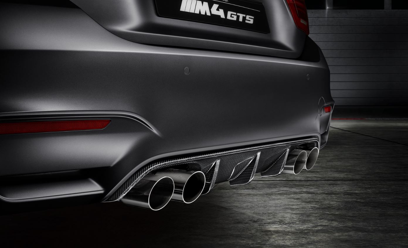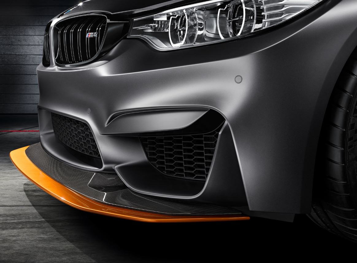 En el exterior, el BMW Concept M4 GTS no se diferencia demasiado del BMW M4 Coupé en el que se basa. Cuenta con un deflector delantero regulable manualmente, así como el alerón posterior, ambos de fibra de carbono visible, para adaptar el coche a las características de cada circuito... o fuera de él. Hay signos de la construcción ligera en el capó, de polímero reforzado con fibra de carbono (PRFC), que también ayuda a que el centro de gravedad del coche sea más bajo.