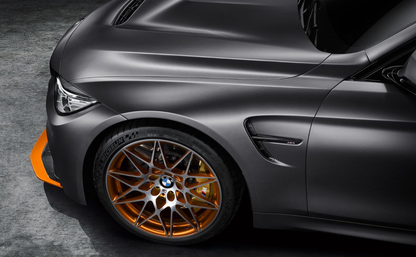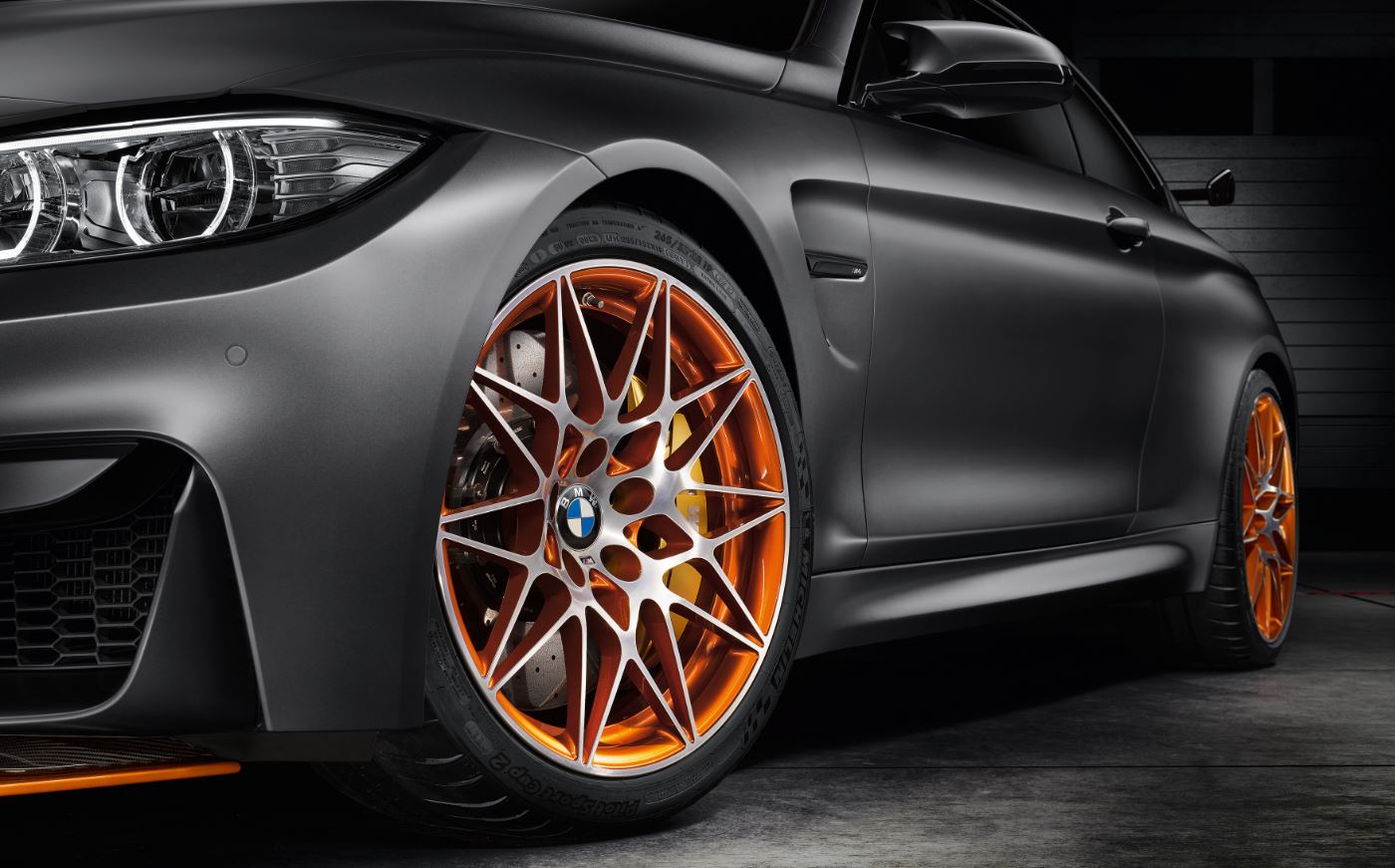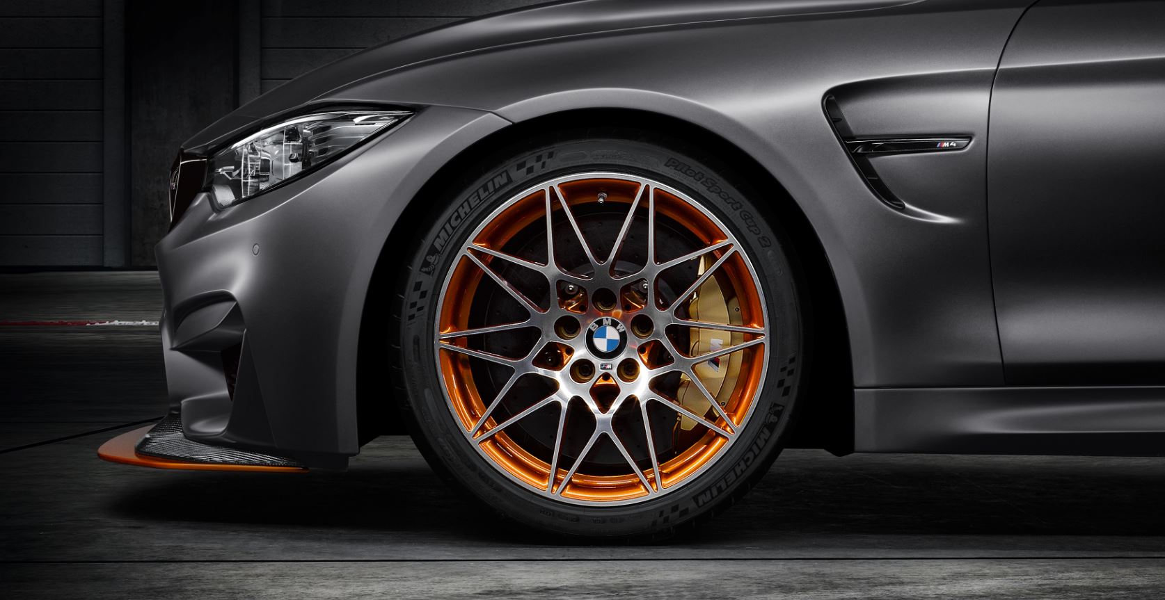 Además del llamativo gris metalizado elegido para este prototipo, que contrasta a la mil maravillas con el deflectro delantero naranja, el BMW Concept M4 GTS cuenta con llantas de aleación ligera forjadas, las delanteras de 19 pulgadas (con neumáticos 265/35) y las traseras de 20, con gomas 285/30 Michelin Sport Cup 2. Podrá llevar llantas híbridas de PRFC que, por primera vez, estarán disponibles en un modelo de serie de BMW M (que ayudan a reducir las masas giratorias no amortiguadas del coche.