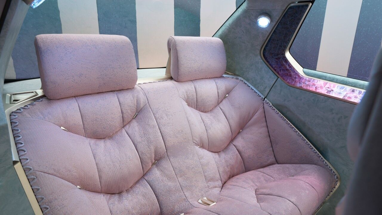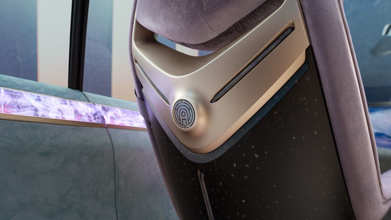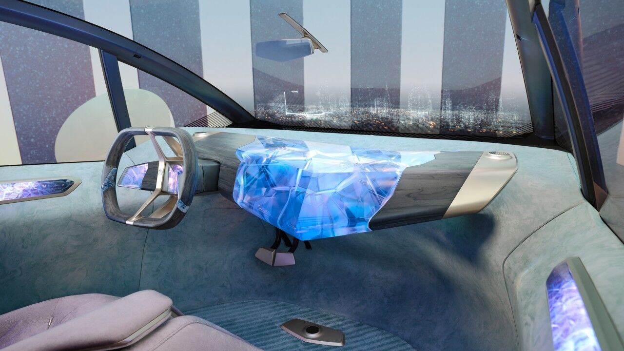 Dominada por lo que parece una losa gigante de kriptonita en el salpicadero que usa efectos de luz para mostrar el cerebro del vehículo en funcionamiento, y destacado por su falta de pantallas visibles, la cabina abandona la configuración convencional a favor de una pantalla de visualización frontal en la base del parabrisas. Los asientos de color lavanda también son de material reciclado, mientras que el volante rectangular está impreso en 3D con material de base biológica; en este caso, polvo de madera. Habría que ver el desgaste con el tiempo.