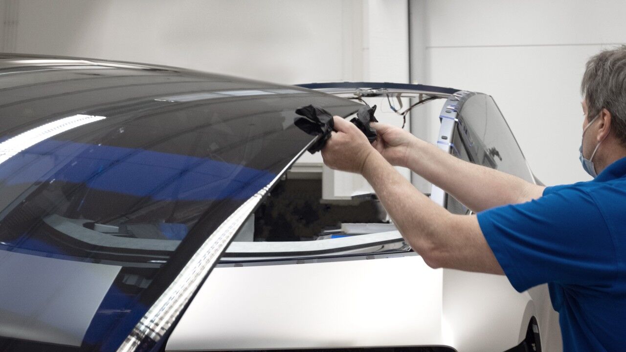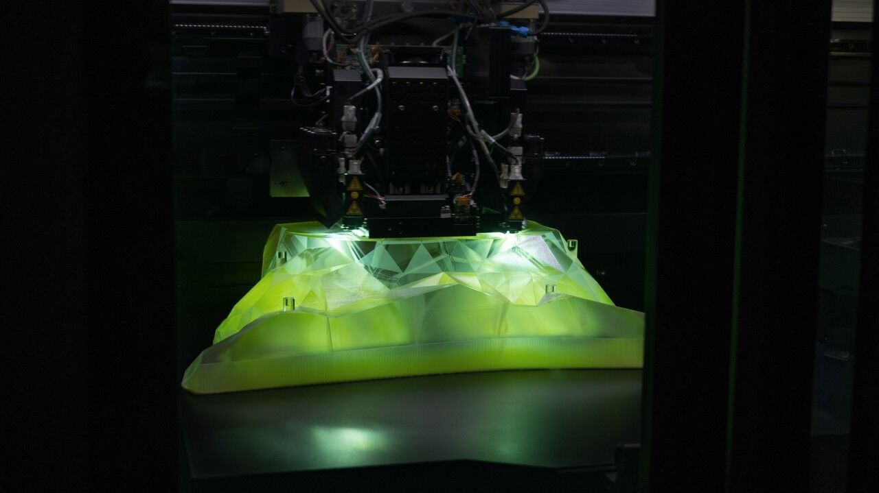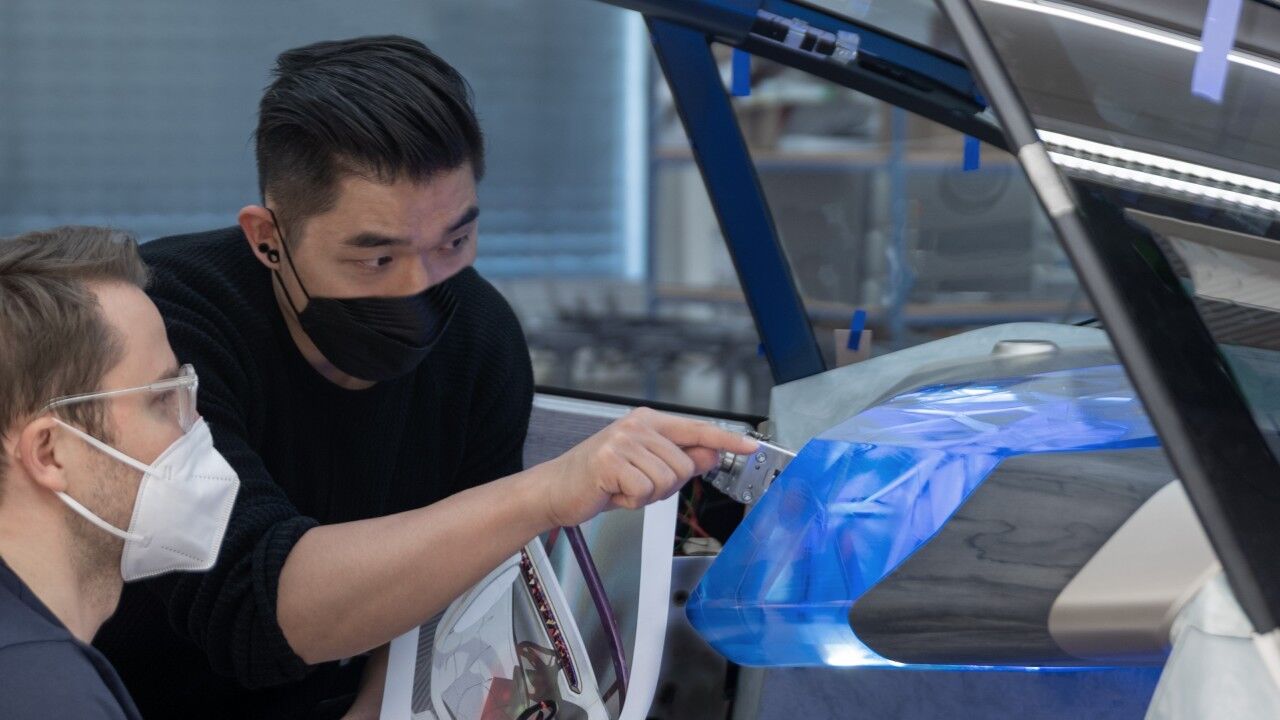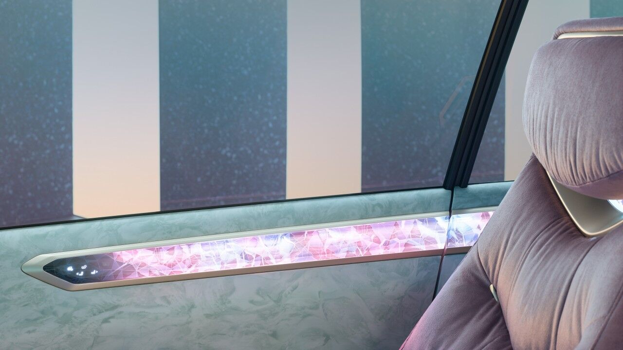 Dominada por lo que parece una losa gigante de kriptonita en el salpicadero que usa efectos de luz para mostrar el cerebro del vehículo en funcionamiento, y destacado por su falta de pantallas visibles, la cabina abandona la configuración convencional a favor de una pantalla de visualización frontal en la base del parabrisas. Los asientos de color lavanda también son de material reciclado, mientras que el volante rectangular está impreso en 3D con material de base biológica; en este caso, polvo de madera. Habría que ver el desgaste con el tiempo.