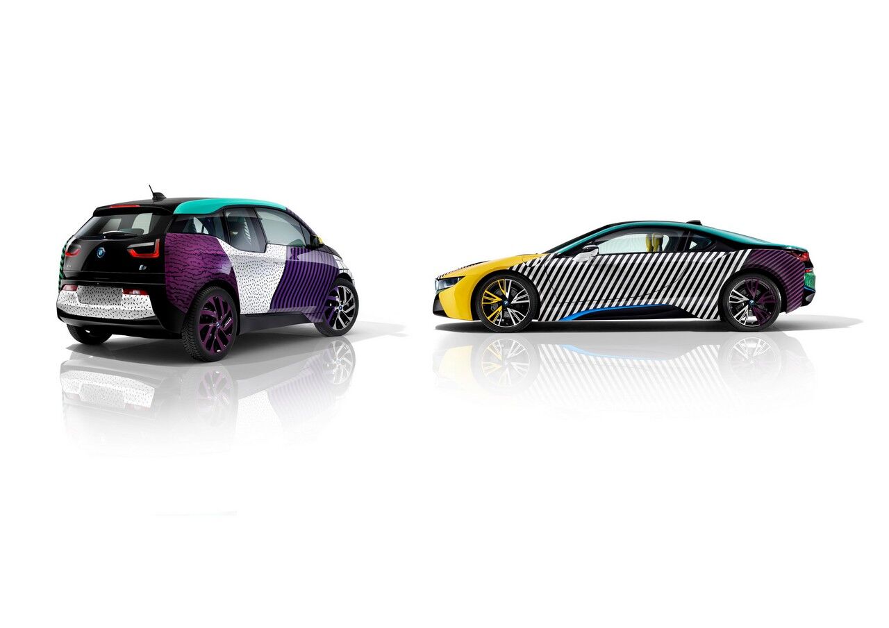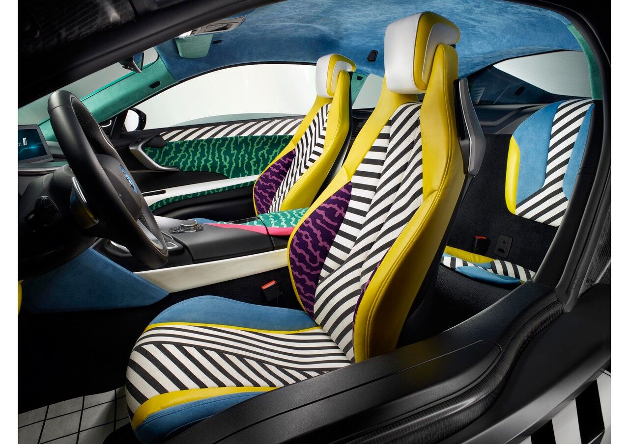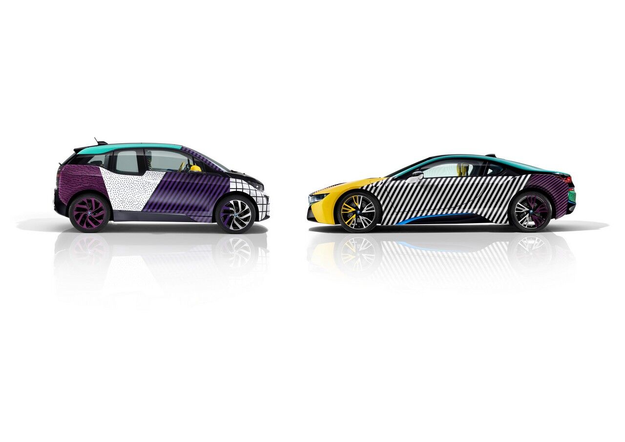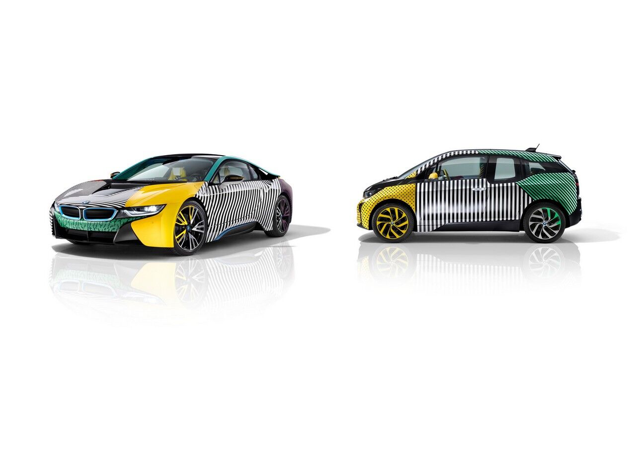 Los BMW i3 y BMW i8 se han transformado completamente por dentro y por fuera para esta ocasión. En su carrocería se mezclan colores en diferentes texturas y estampados. Por un lateral del i8 podemos encontrar rayas blancas y negras que lo hacen parecer una cebra, por el otro lateral en cambio vemos cuadros del mismo color. No faltan toques de amarillo en las esquinas, naranja rayado o un verde con una textura que parece de sandía en la zaga.