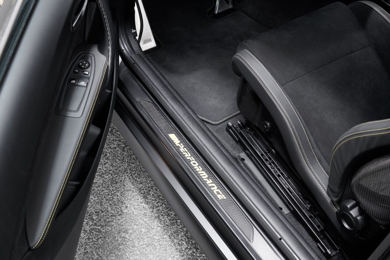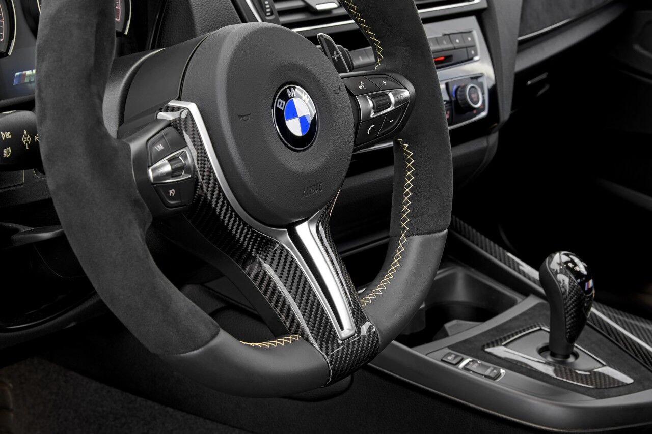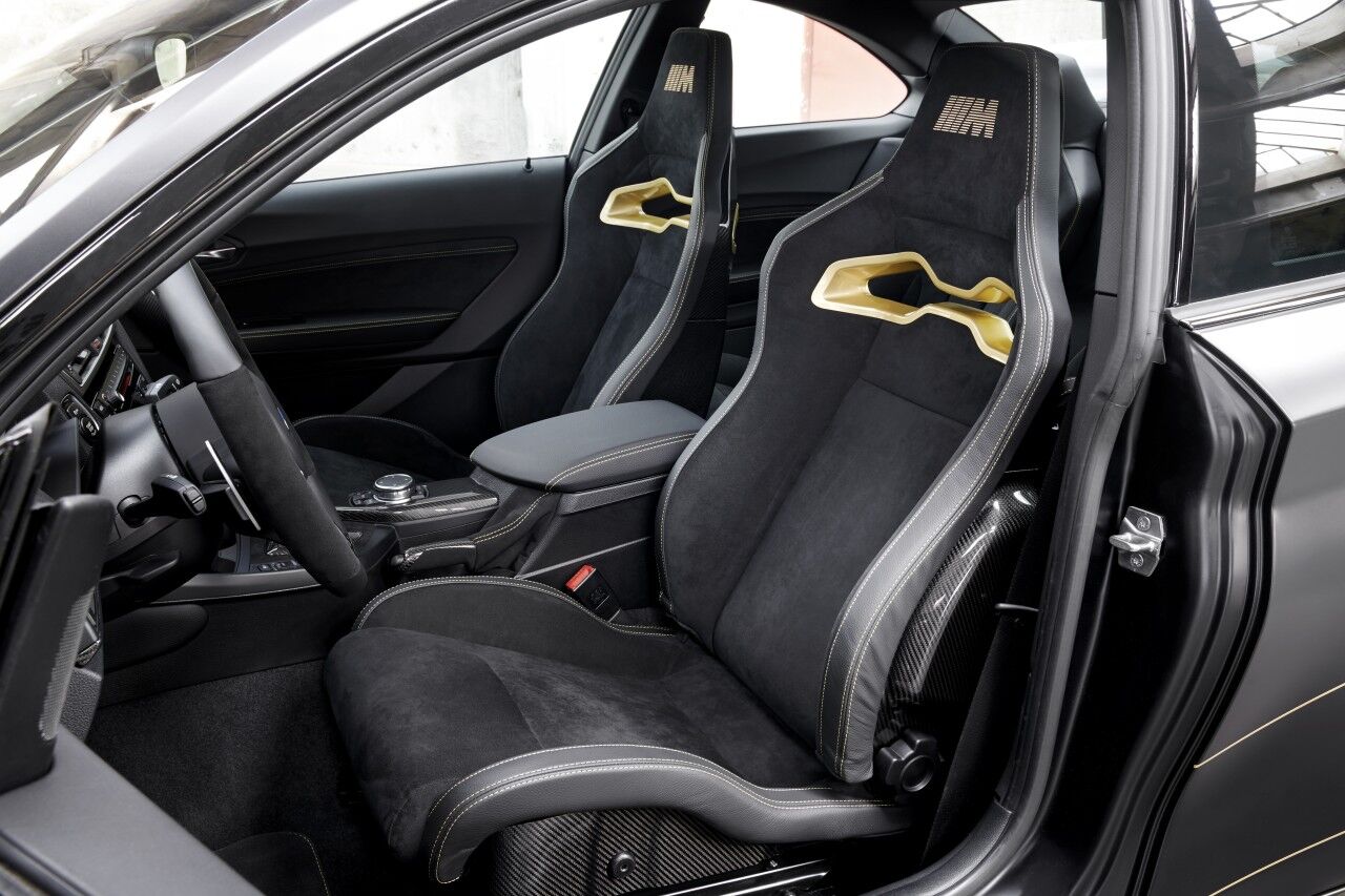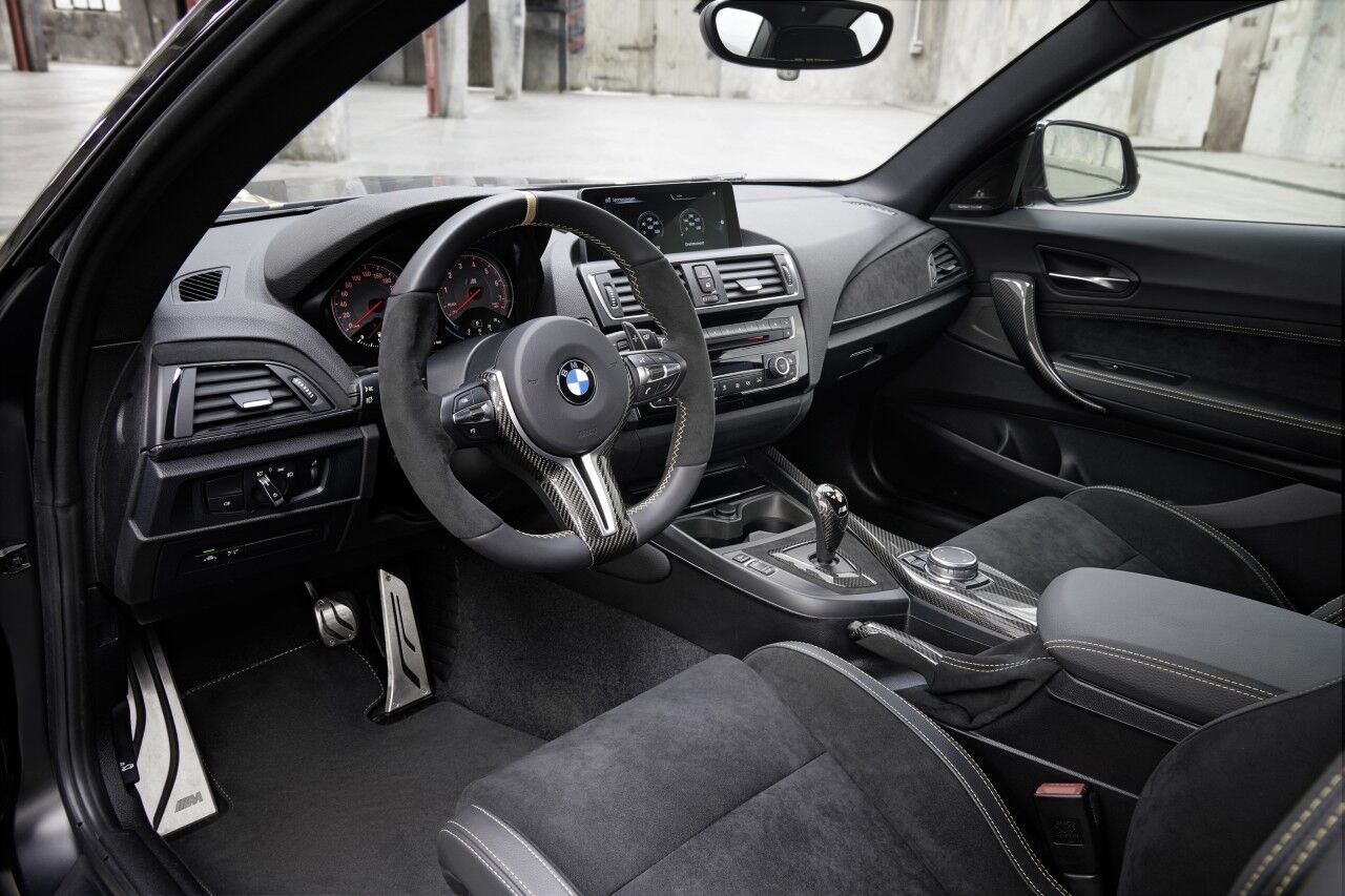 En el interior del BMW M2 M Performance Parts Concept también se notan las modificaciones. La fibra de carbono y el Alcántara serán los protagonistas, ambos están presenten en los asientos deportivos delanteros, que ahorran 9 kg respecto a los convencionales. Otro detalles llamativo son los asientos traseros M Performance, que consiguen restar otros 13 kg más al conjunto. La decoración va en color negro con costuras y detalles dorados, con técnicas de vanguardia como la impresón láser.