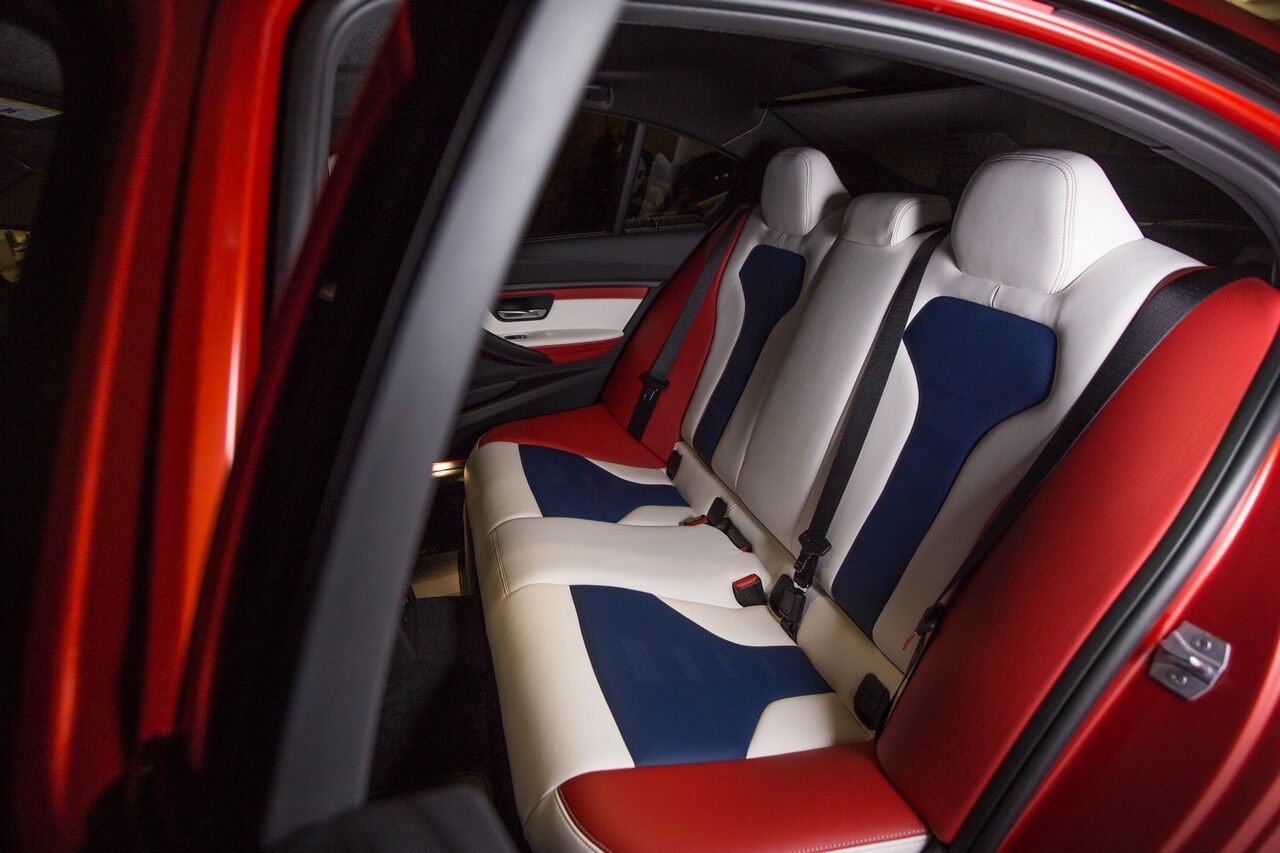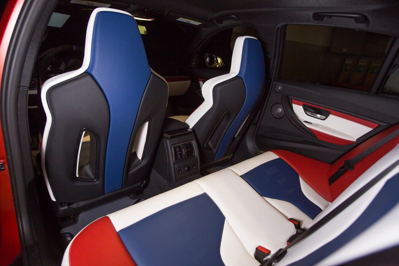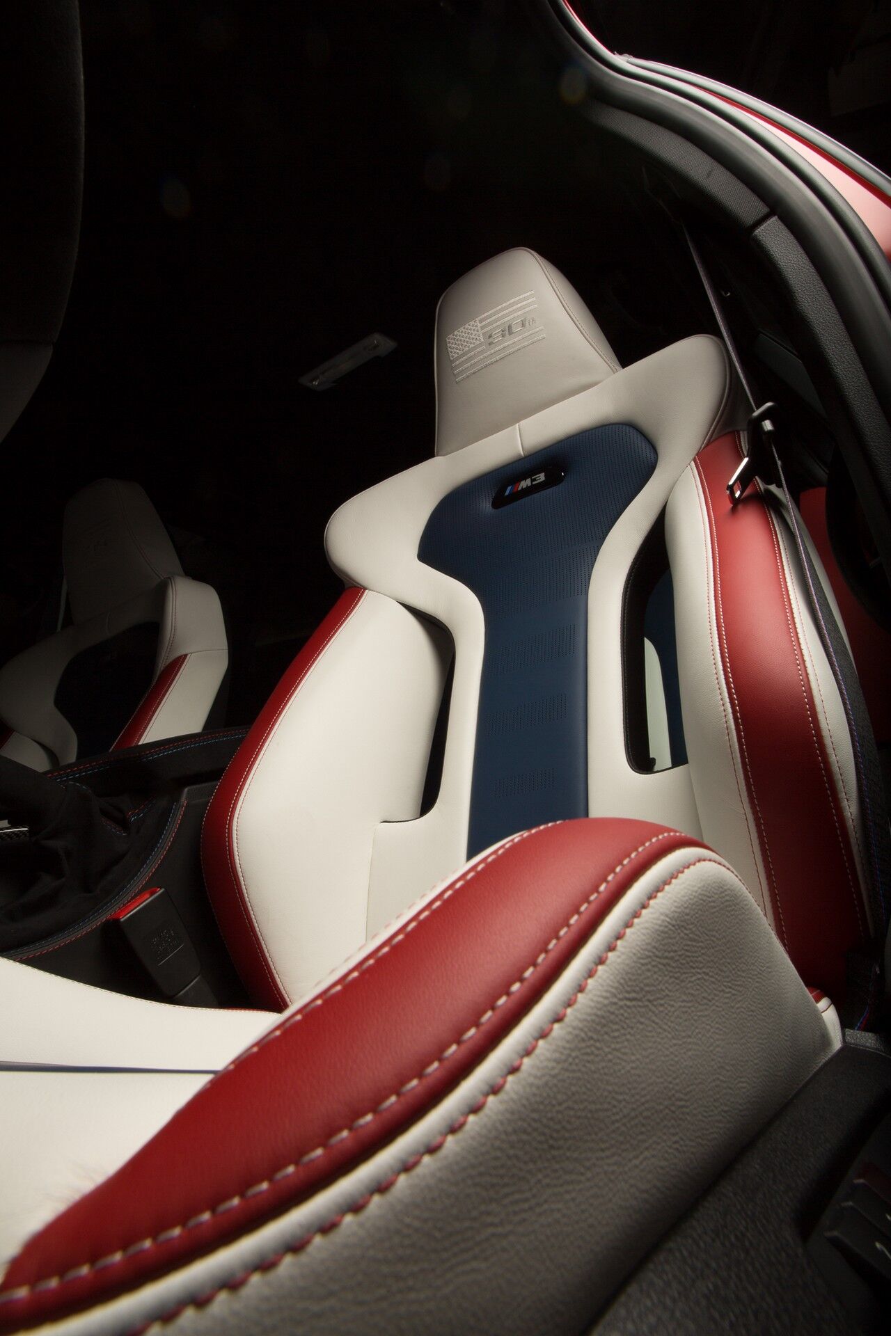El interior del BMW M3 30 Years American Edition destaca por la combinación de tres cueros de colores rojo, blanco y azul en referencia a la bandera de estados unidos a los que se suman la fibra de carbono y el Alcántara. El símbolo de la edición especial aparece en el salpicadero y los reposacabezas.