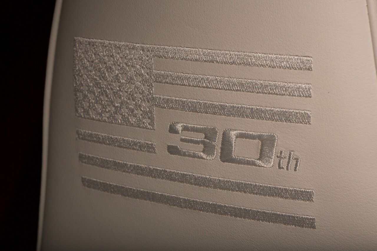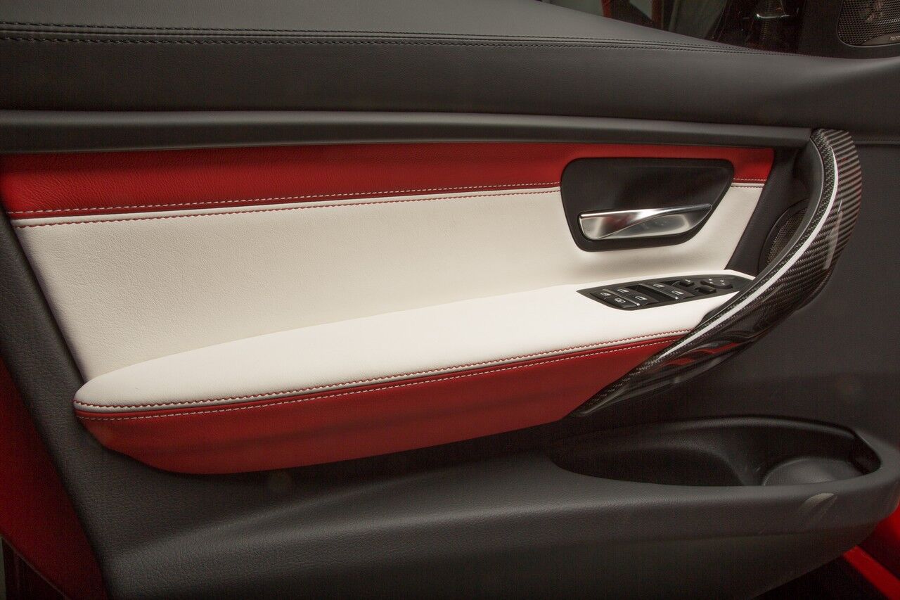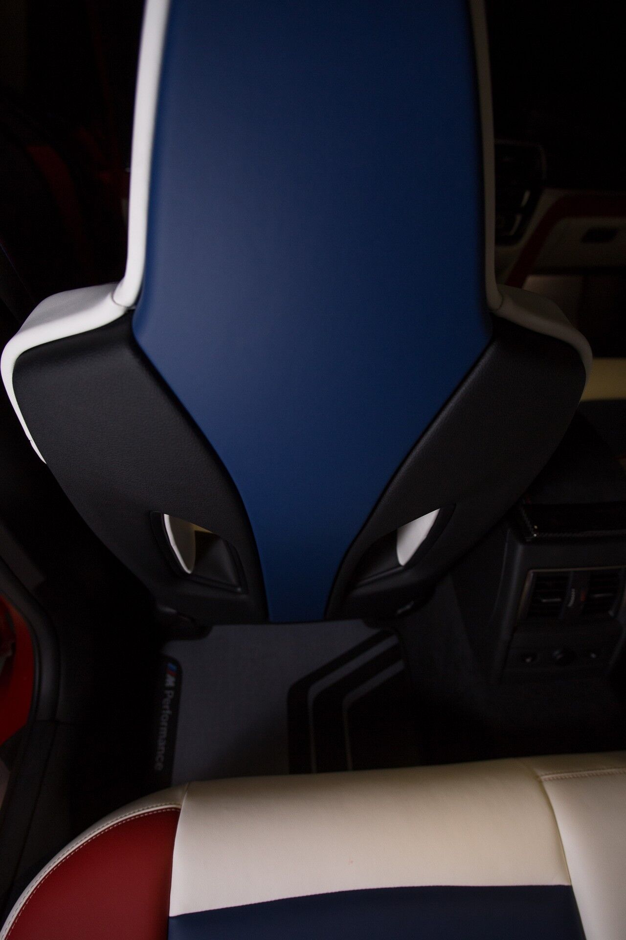 El interior del BMW M3 30 Years American Edition destaca por la combinación de tres cueros de colores rojo, blanco y azul en referencia a la bandera de estados unidos a los que se suman la fibra de carbono y el Alcántara. El símbolo de la edición especial aparece en el salpicadero y los reposacabezas.