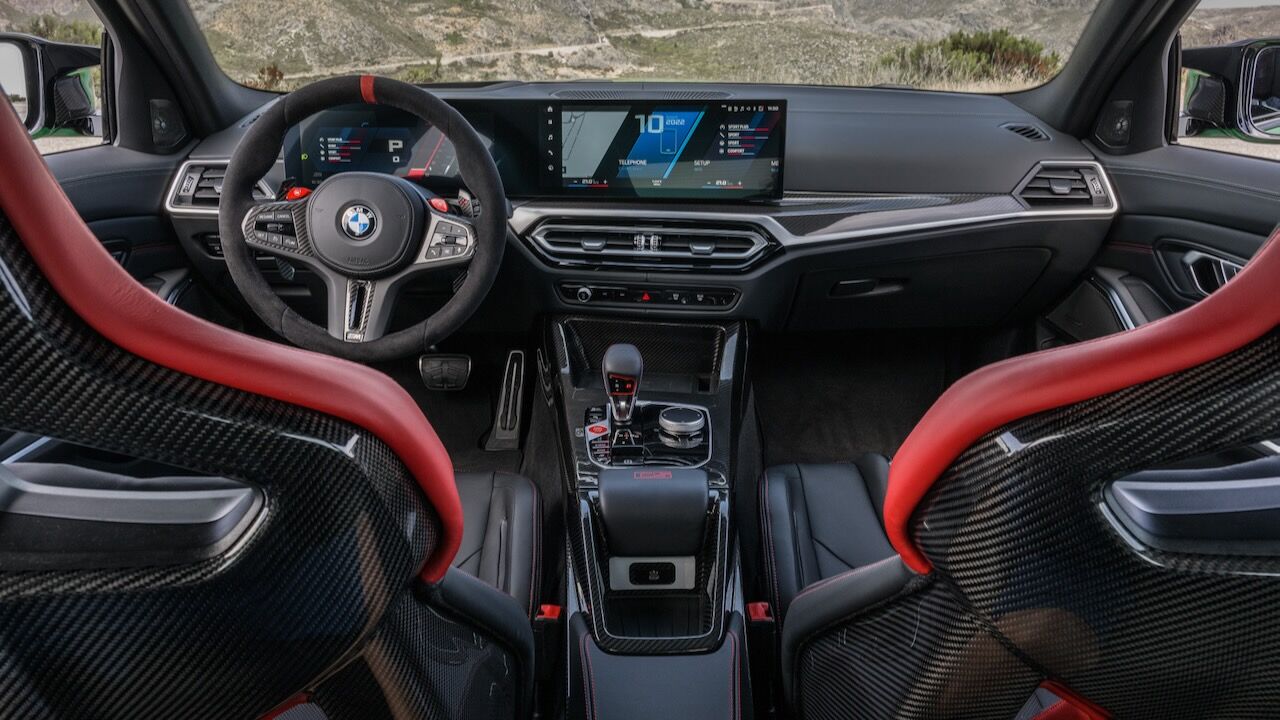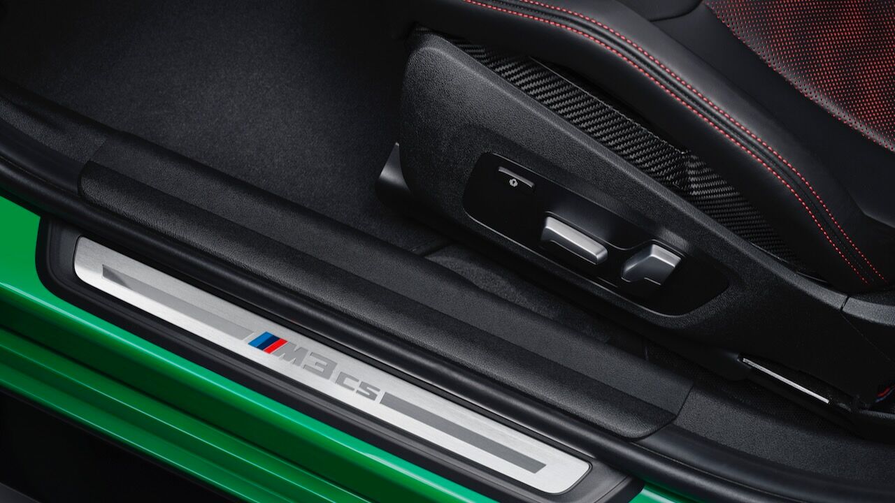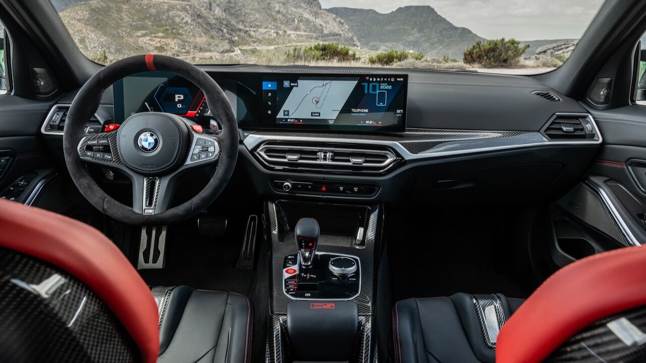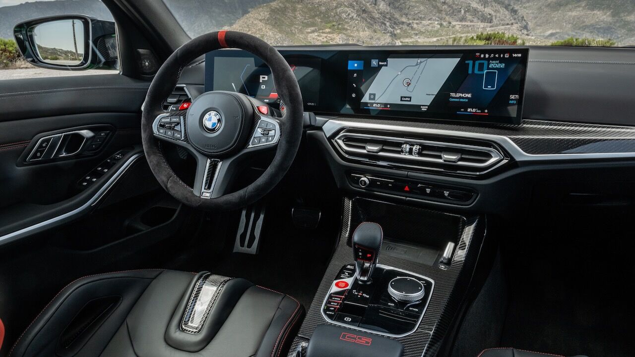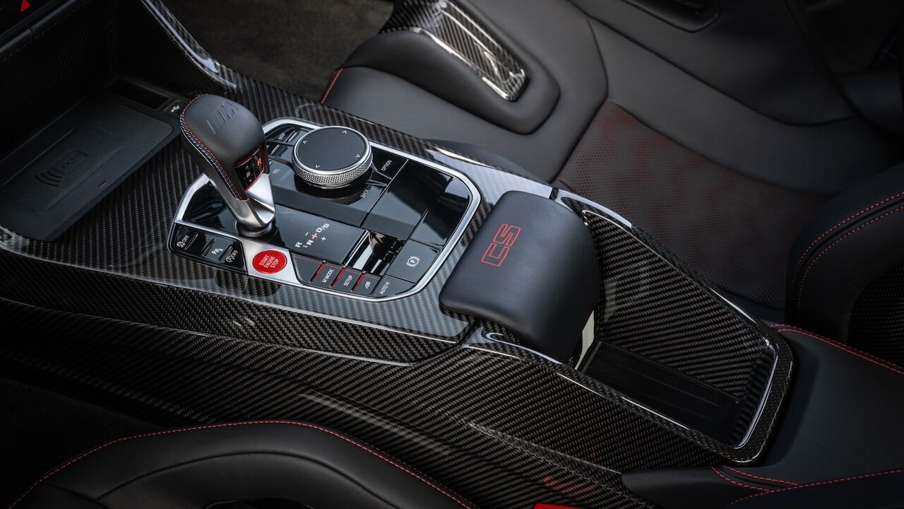 El interior se no queda atrás y ofrece una atmósfera realmente deportiva. Los principales culpables son los asientos tipo baquet M de fibra de carbono específicos. Cuentan con reglajes eléctricos y calefacción, además de tener el distintivo iluminado y de recibir una tapicería en cuero Merino con costuras en contraste. Va a juego con el volante M Alcántara con levas de cambio en CFRP y con la inscripción M3 CS en varios puntos del habitáculo. También se incluye el botón Setup en la consola central para un accedo directo a las funciones de conducción.