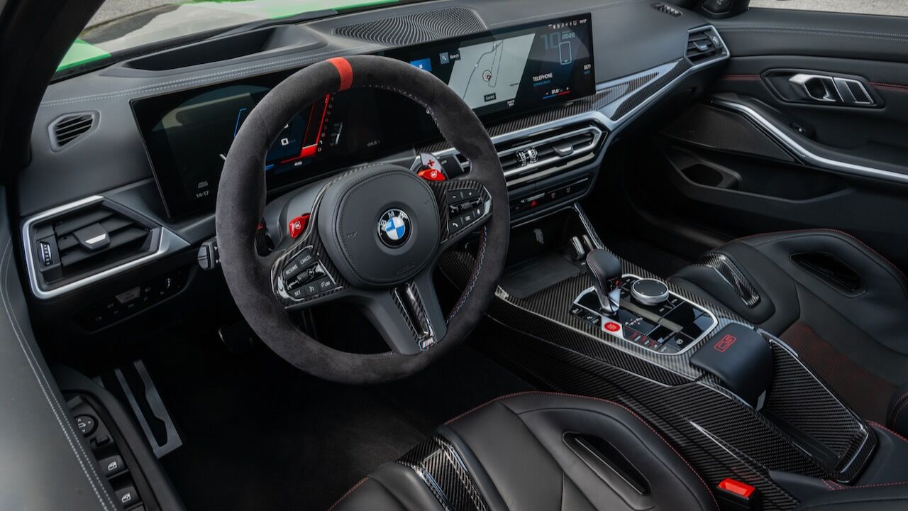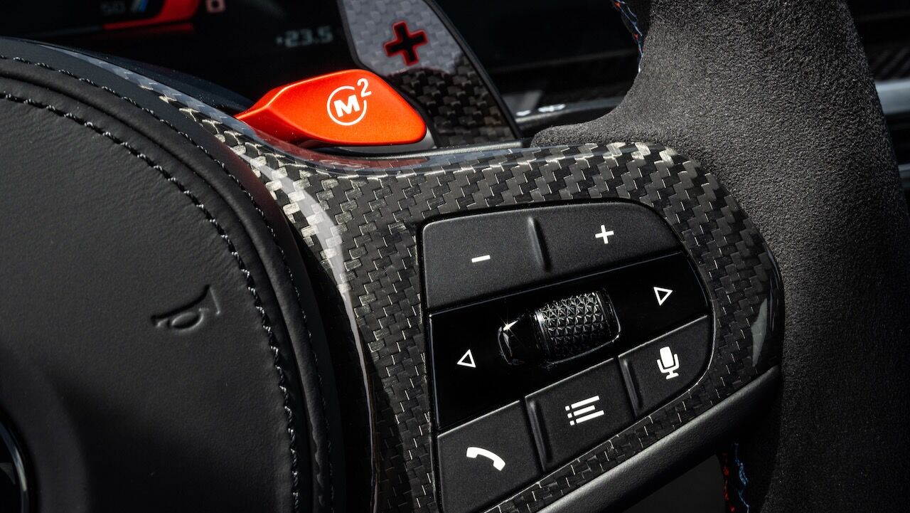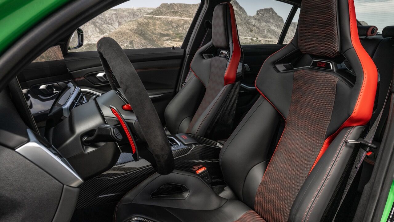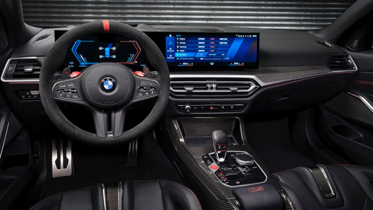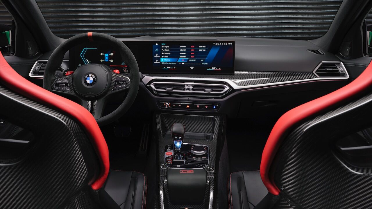El interior se no queda atrás y ofrece una atmósfera realmente deportiva. Los principales culpables son los asientos tipo baquet M de fibra de carbono específicos. Cuentan con reglajes eléctricos y calefacción, además de tener el distintivo iluminado y de recibir una tapicería en cuero Merino con costuras en contraste. Va a juego con el volante M Alcántara con levas de cambio en CFRP y con la inscripción M3 CS en varios puntos del habitáculo. También se incluye el botón Setup en la consola central para un accedo directo a las funciones de conducción.