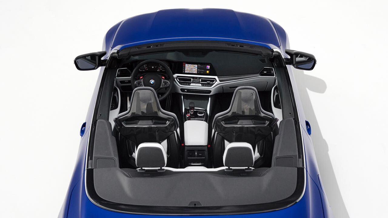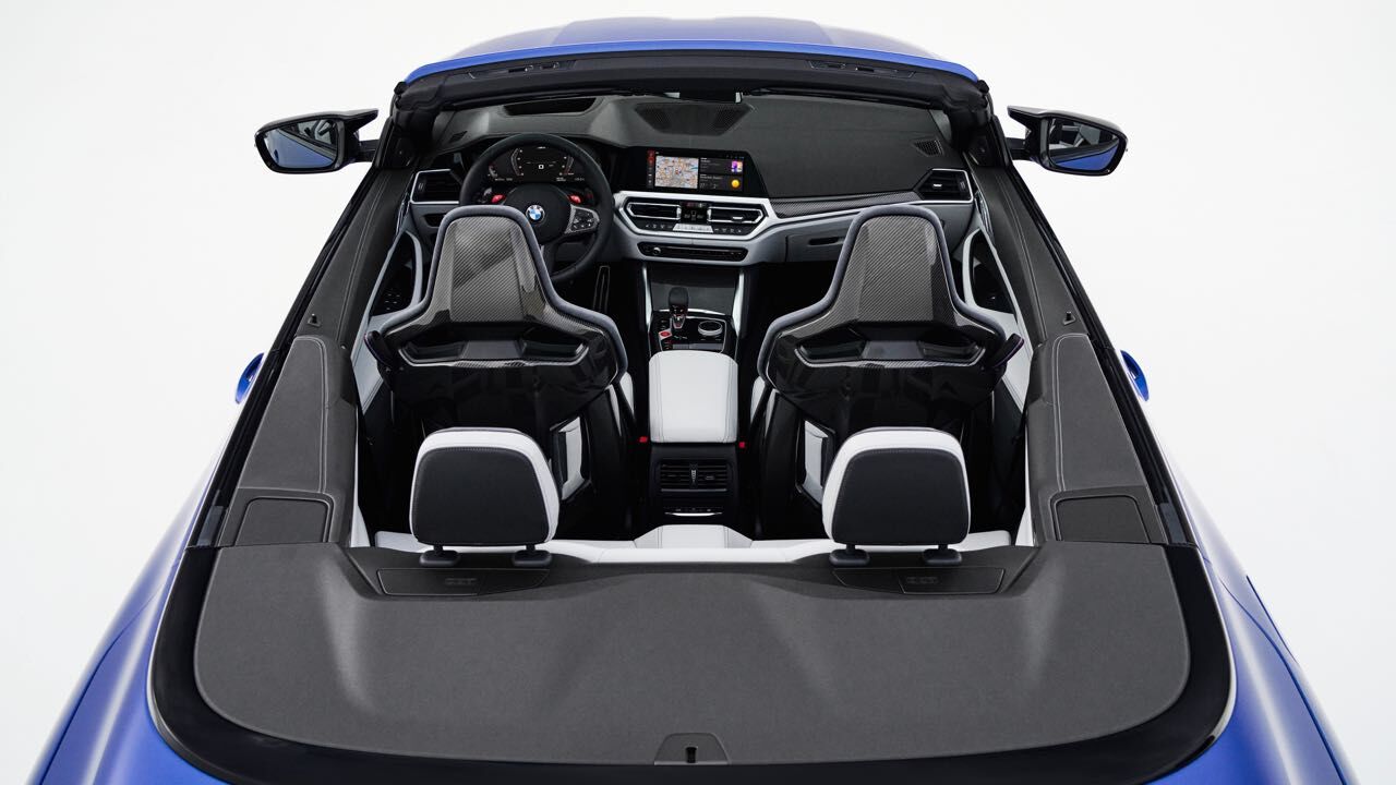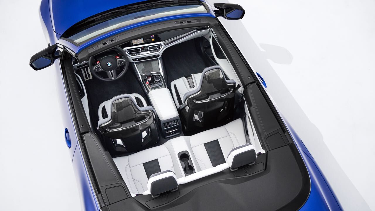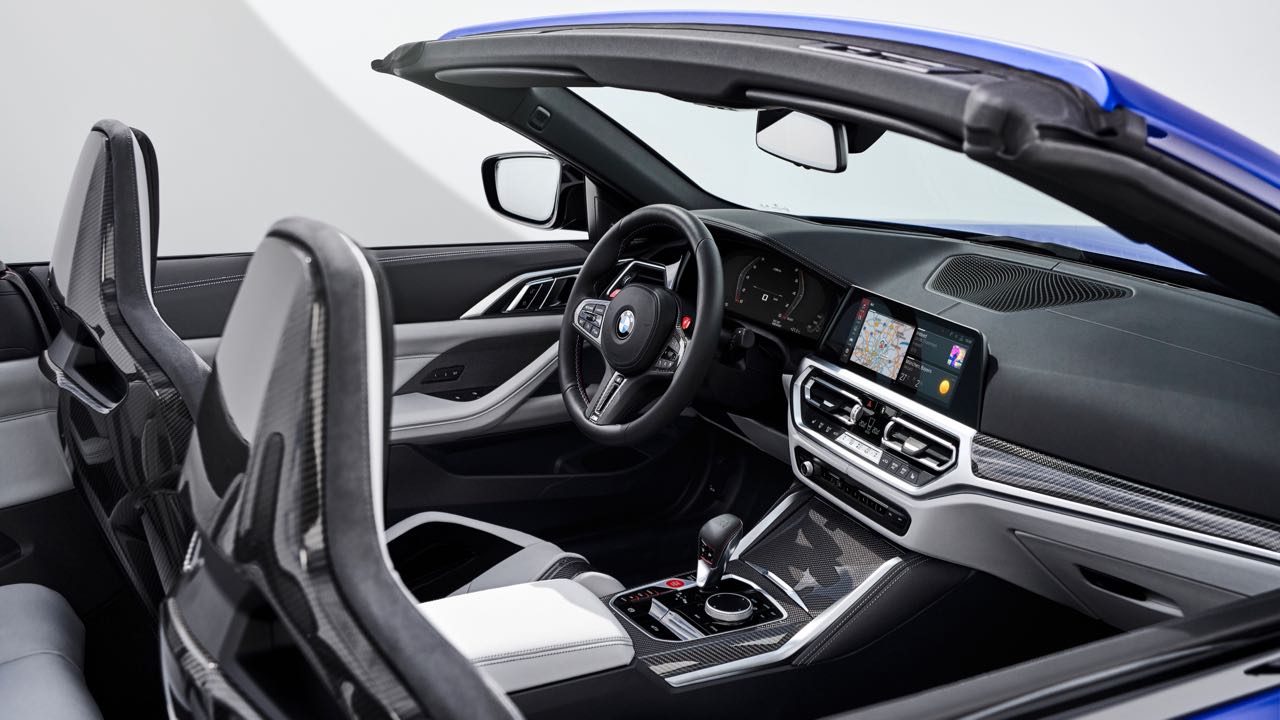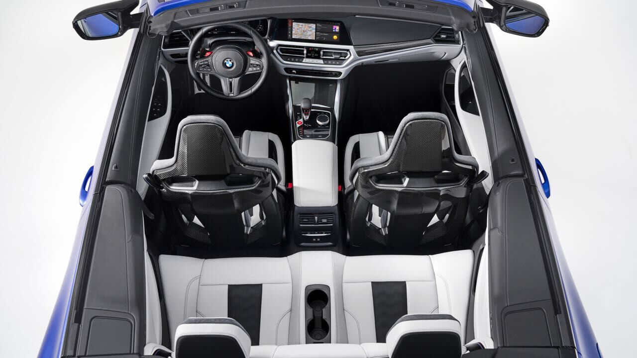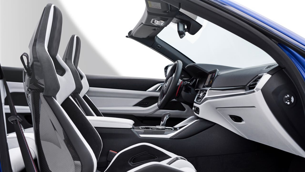 El interior es muy similar al de un M4 Coupé. No faltan asientos deportivos M de serie, tapizados en cuero (con ventilación opcional) y pueden tener estructura de carbono. Tiene un cuadro de mandos digital, el Live Cockpit Navigation Pro, y un volante cuenta con el botón M para ajustar configuración del motor, chasis, dirección, frenos y la tracción.
