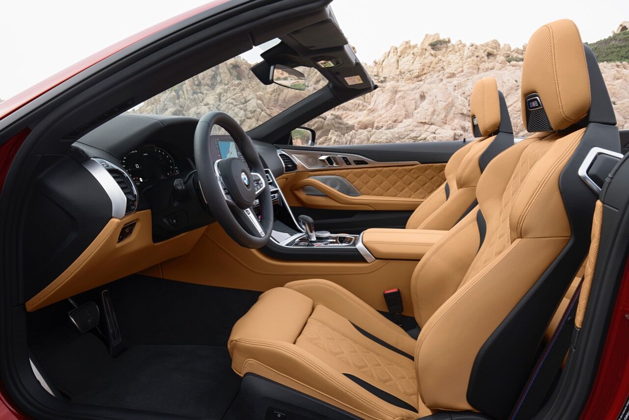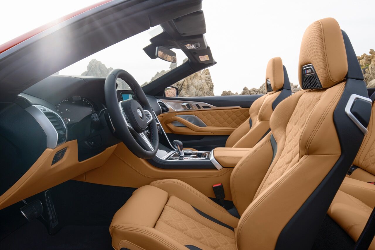 En el interior del BMW M8 Competition Cabrio se mezclan el lujo y la deportividad gracias a elementos como el volante M (con esos botones rojos) o los asientos M Sport disponibles cinco tapicerías de cuero y con reglajes eléctricos. En este descapotable se incluye de serie un deflector de viento para reducir las turbulencias y también una calefacción para el cuello; ambas opciones interesantes para los que vayan a ir descapotados la mayoría del tiempo.