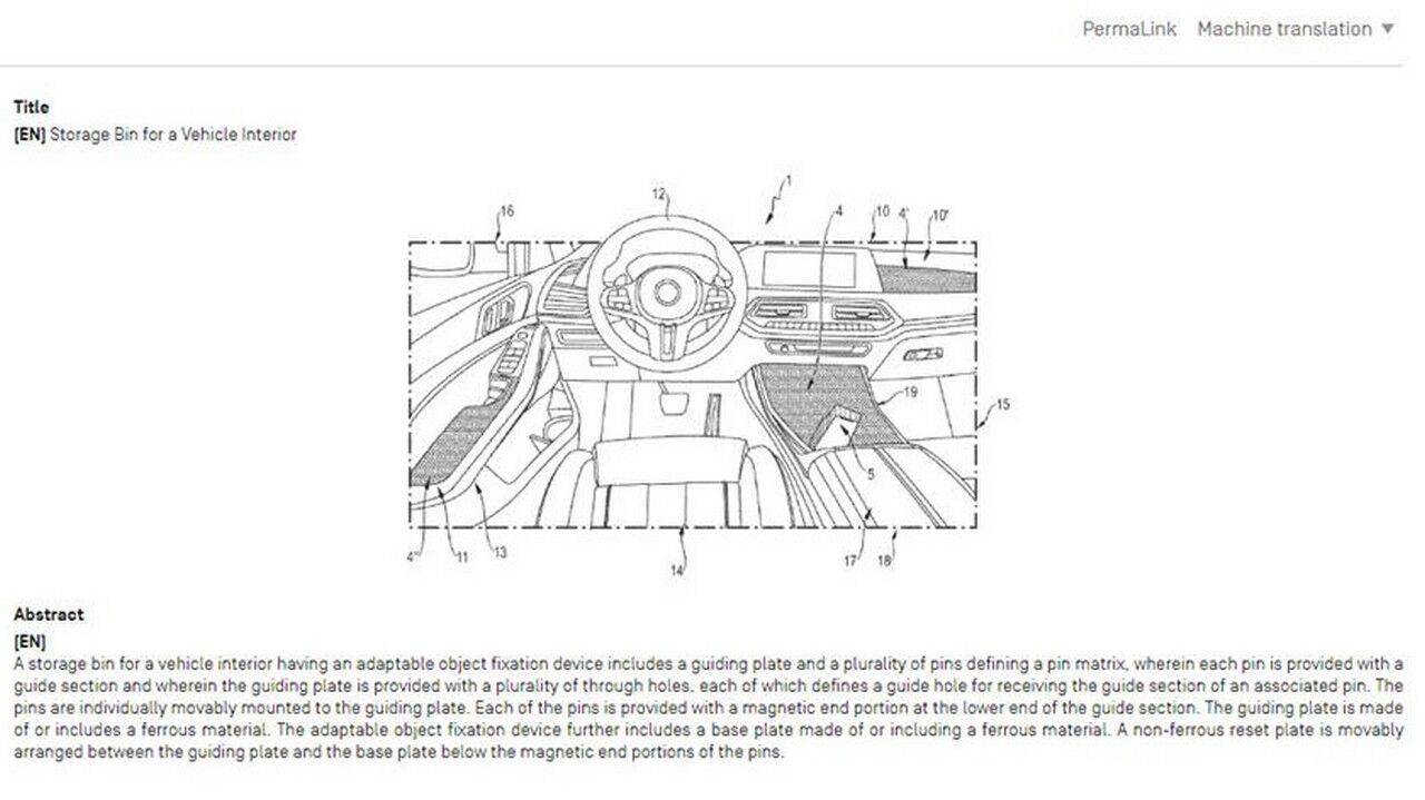 En estos documentos, la idea del fabricante bávaro ve el cubrir el espacio tradicional del interior de un vehículo con “un dispositivo de fijación de objetos adaptable” compuesto por “una placa de guiado y una pluralidad de pasadores que definen una matriz de pasadores”. Lo que hace que esto sea interesante es que las patentes establecen que cada uno de los pasadores presentaría una “porción de extremo magnético en un extremo inferior de la sección de la guía”. Piensa en el magnetismo como una especie de espuma viscoelástica para tus cosas diarias.