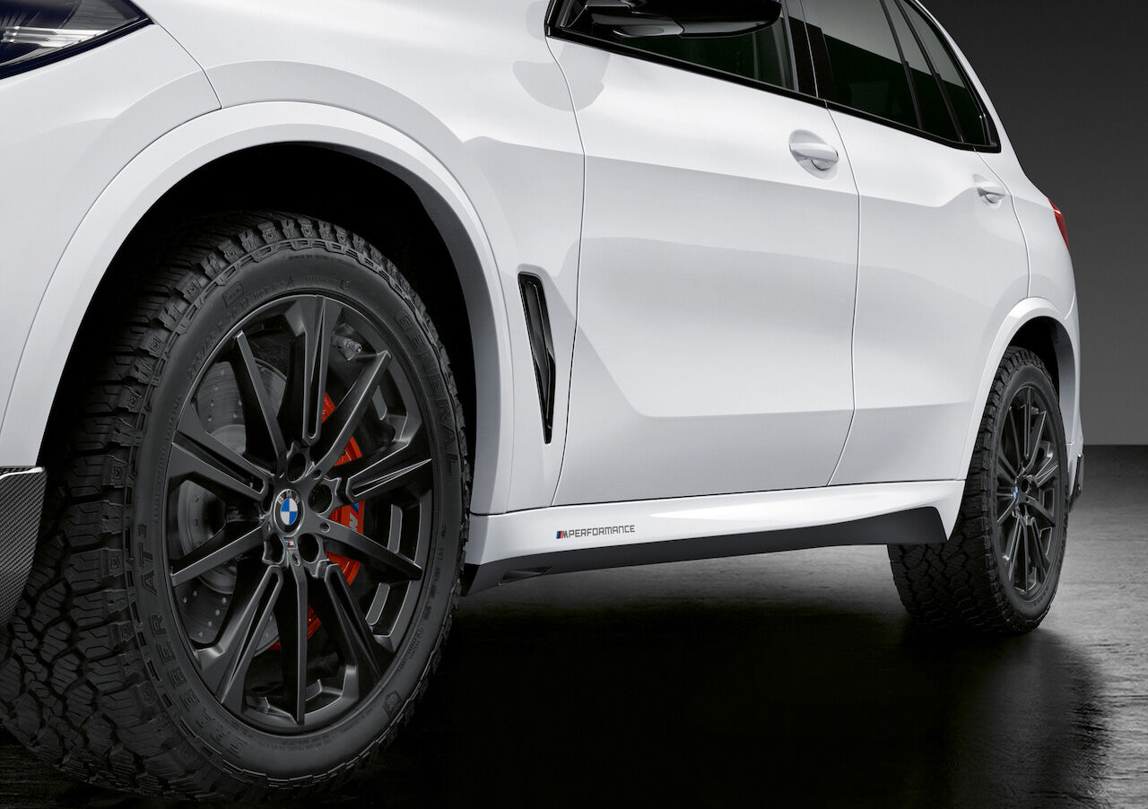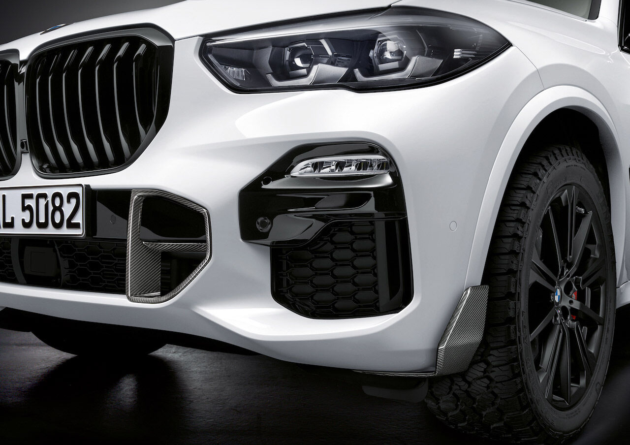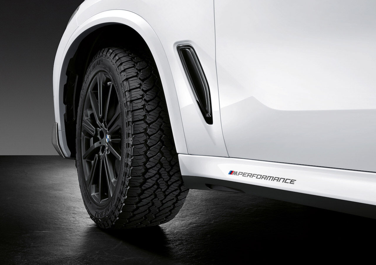 El exterior del X5 puede estar potenciado por una serie de piezas de fibra de carbono que ocupan algunos lugares de la carrocería como es el caso de las tomas de aire y aletas delanteras, espejos retrovisores, parte inferior de las puertas o difusor trasero. Tampoco pasan desapercibidas las llantas de hasta 22 pulgadas (las hay de 20 pulgadas con neumáticos todoterreno), que pueden ir acompañadas por un sistema de frenos M Performance con pinzas en color rojo que mejoran el rendimiento.
