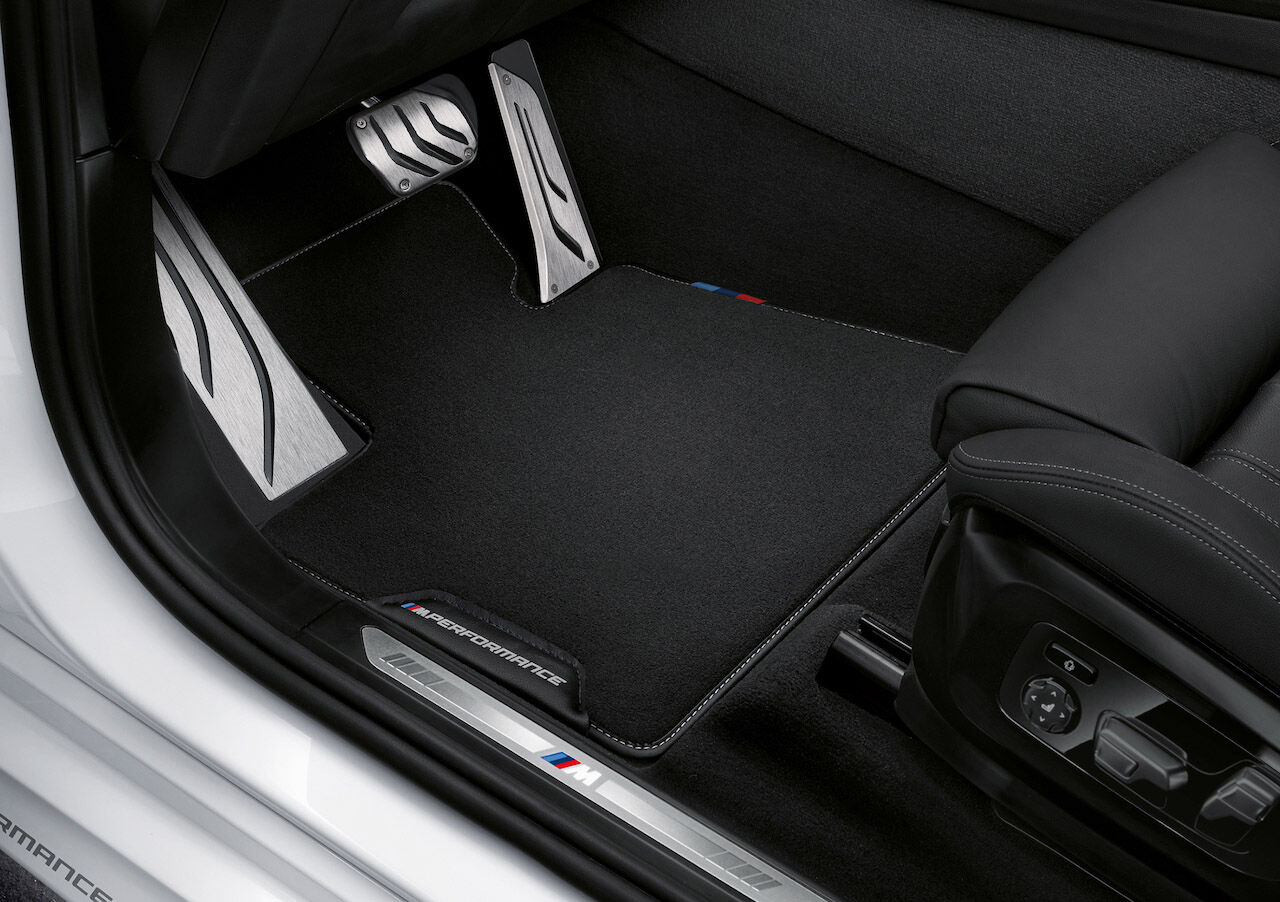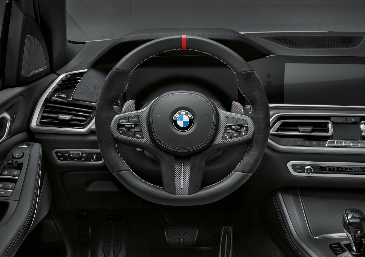 En el interior del vehículo también aparecen algunas molduras en carbono, incluyendo las del volante M Performance forrado en Alcántara por los laterales y con un ribete rojo en la parte superior. Otros elementos del habitáculo que son novedad son los pedales de acero inoxidables o alfombrillas específicas. Otro accesorio que puede montar el BMW X5 M Performance Parts son unos proyectores con el logo ‘M’ en las puertas.