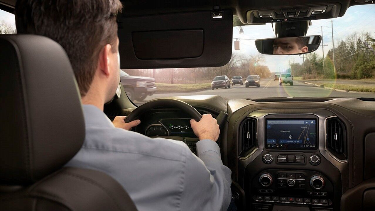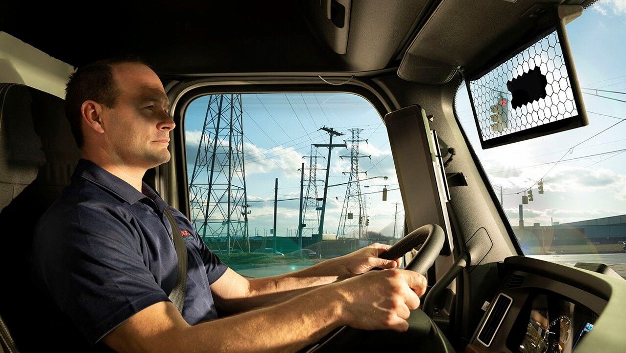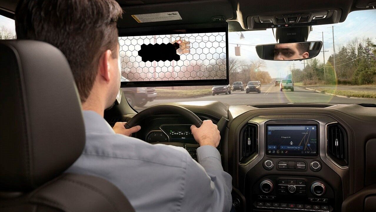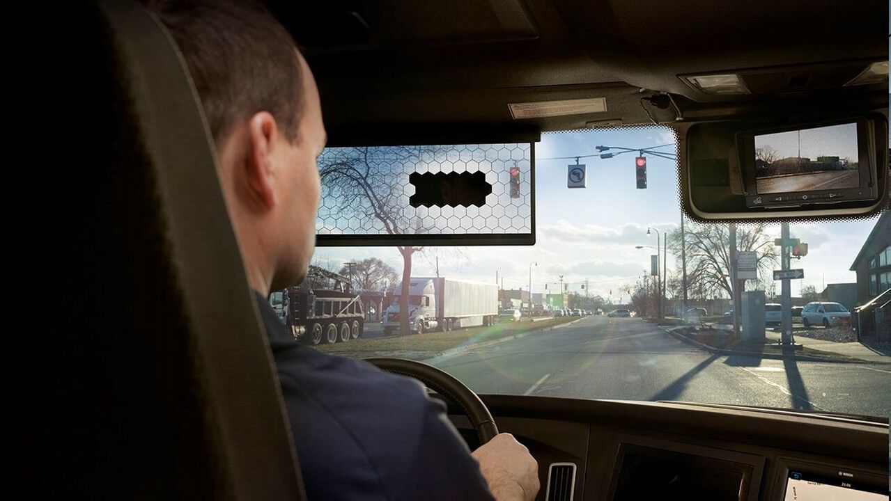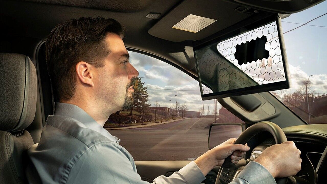 Los insertos en forma de hexágono parecen una colmena digital, y el conjunto se pliega desde el espacio justo encima del parabrisas como un parasol normal. Pero cuando está bajado, puedes ver el mundo exterior en lugar de mirarte a la cara en un espejo. Es más como un par de gafas de sol que una visera tradicional, y es mucho más seguro porque se puede ver a través de los hexágonos no afectados. El Virtual Visor se ajusta automáticamente en tiempo real según sea necesario.