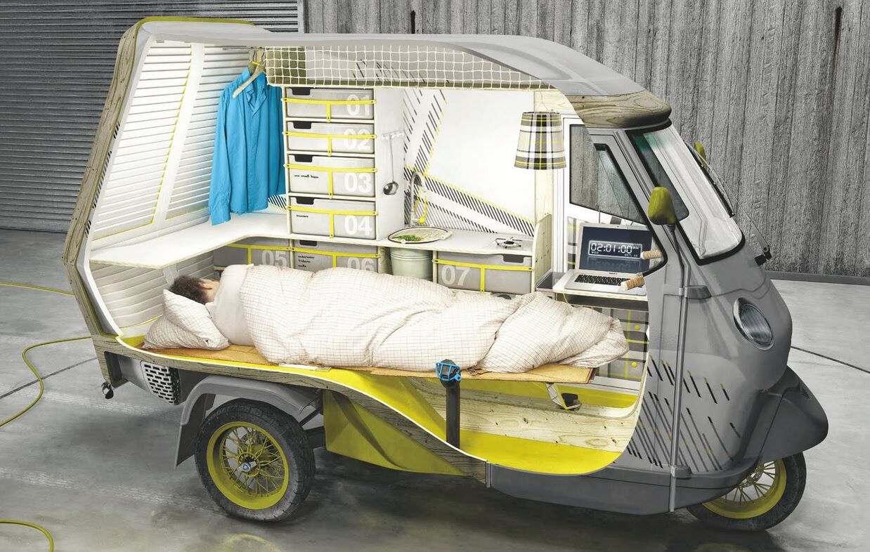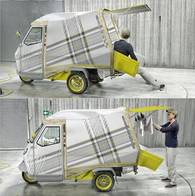 El Bufalino es un concepto de vehículo de tres ruedas con forma de furgoneta creada a partir de la estructura de un triciclo Piaggio APE 50. Ha sido creado por el diseñador industrial Cornelius Comanns y está pensado para satisfacer las necesidades básicas de una persona y realizar viajes con una especie de campamento base que siempre viaja contigo.