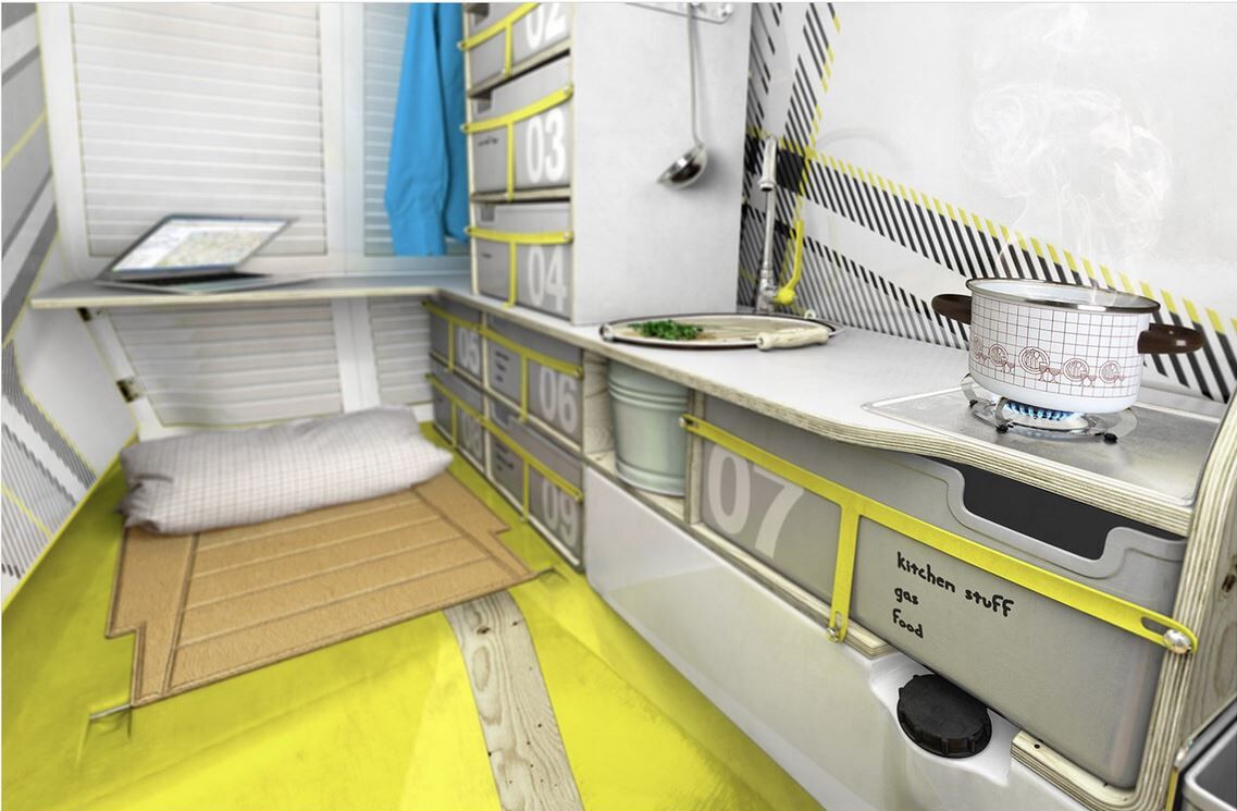 El aprovechamiento del espacio es increíble. La cama se forma abatiendo el asiento del conductor, que se une a una superficie acolchada situada en el espacio de carga. Por lo tanto, con una almohada y un saco de dormir ya te puedes tumbar cómodamente. La cocina consiste en un único fogón alimentado por gas butano, y una especie de fregadero está a su lado para lavar la ropa o los platos.
