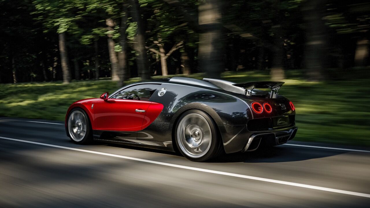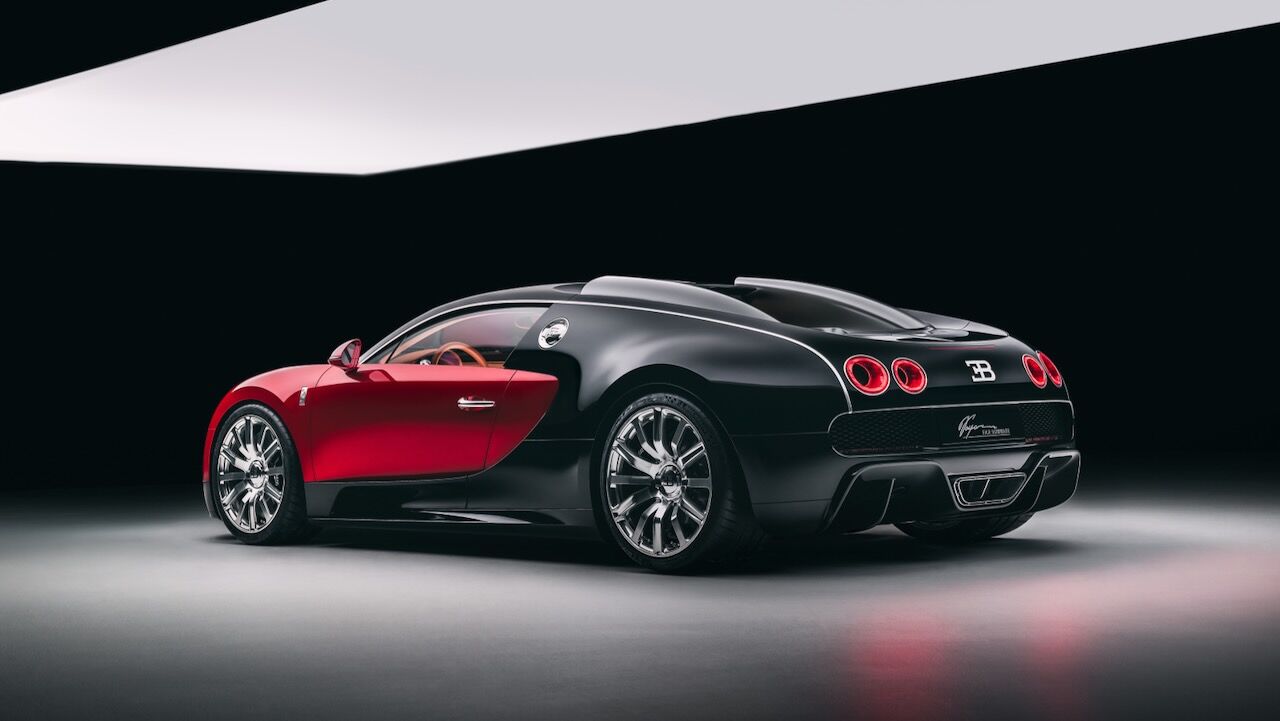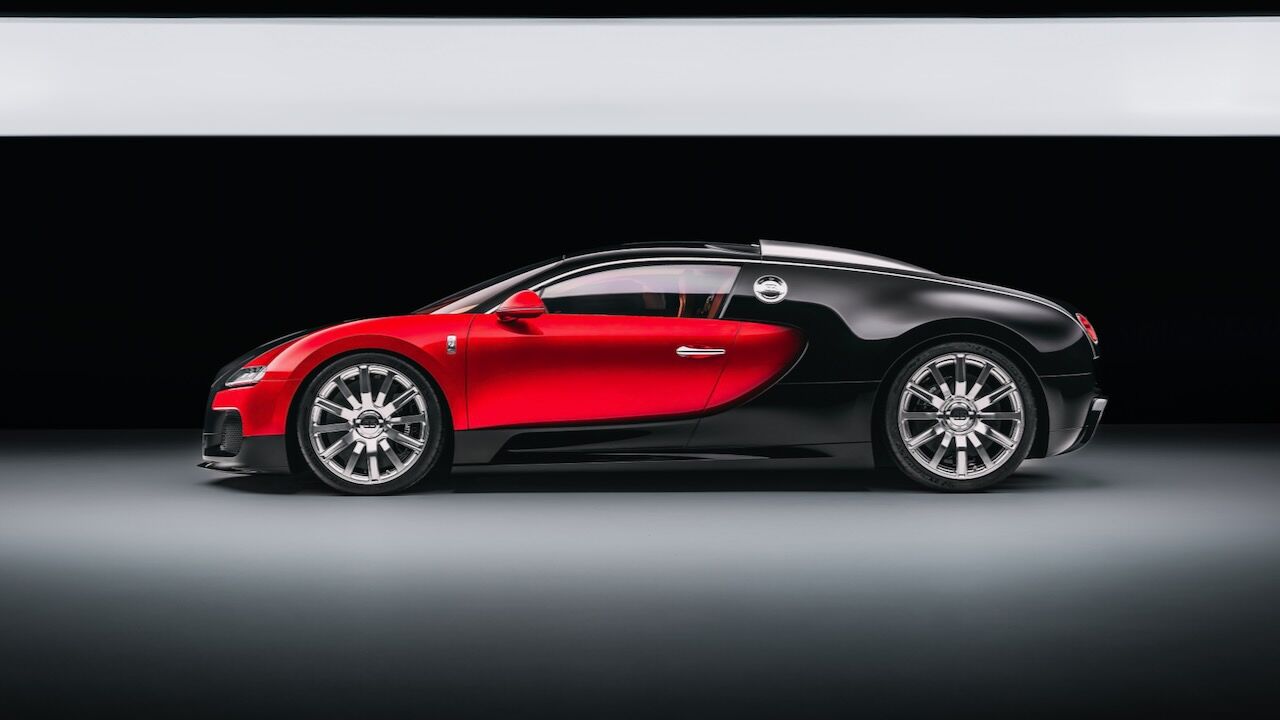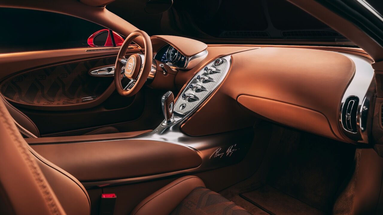 Como decíamos, se han hecho modificaciones para acercarse al diseño original del Veyron, un viaje que comienza con su pintura. Aunque lo parezca en las imágenes, no es un simple rojo y negro. Los ingenieros han aplicado una capa base de aluminio plateado bajo un barniz rojo tintado, creando un efecto tridimensional que hace que el coche parezca estar en movimiento. Y las partes negras no son pintura, sino fibra de carbono expuesta que ha sido tintada con un 10 % de pigmento negro. Es sutil, elegante y técnicamente abrumador.