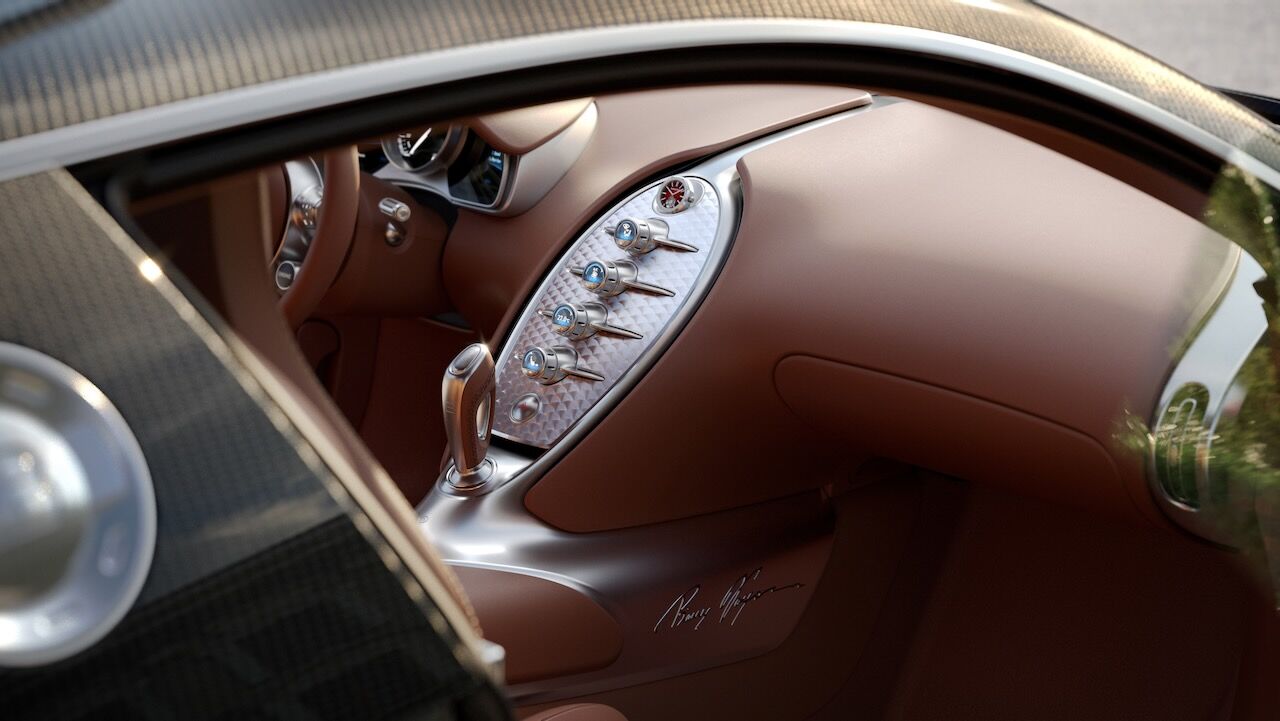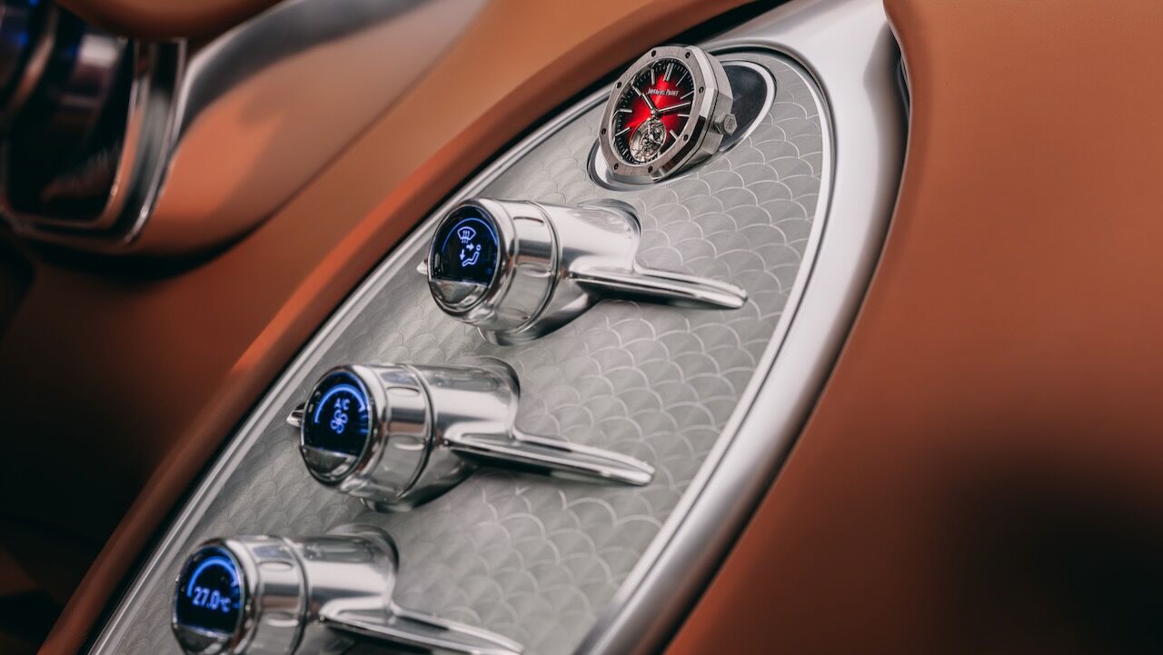 Pero donde realmente se siente el homenaje es en el interior. En el Bugatti FKP Hommage se vuelve a elementos clásicos, con el volante circular, limpio y bauhausiano del Veyron original como protagonista. La consola central es una pieza maciza de aluminio mecanizado que parece sacada de una galería de arte. Y, como toque de excentricidad (algo muy propio de Bugatti), el salpicadero aloja un Audemars Piguet Royal Oak Tourbillon. No es un reloj pegado, está integrado en un mecanismo de «góndola» motorizada que lo mantiene cargado con el movimiento del propio coche.