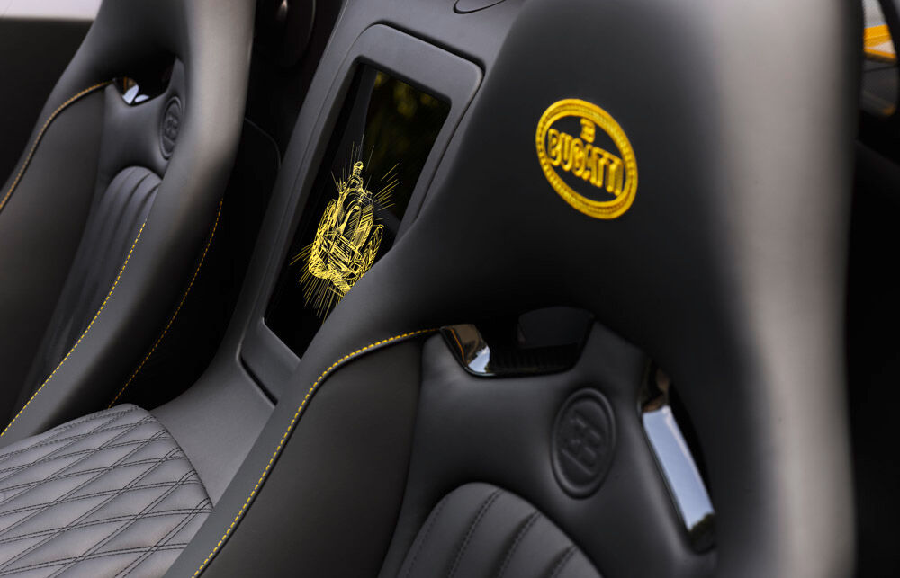 Otro detalle que lo hace único es la incorporación del logotipo tal como lo ideó originalmente Ettore Bugatti. Es algo más grande, con las iniciales EB de mayor tamaño y con los 60 puntos que lo rodean más evidentes. Además de en la parrila, el logo también está bordado en los asientos y serigrafiado en la parte baja del alerón. Cuando se levanta, la vista desde la parte trasera resulta todo un espectáculo.