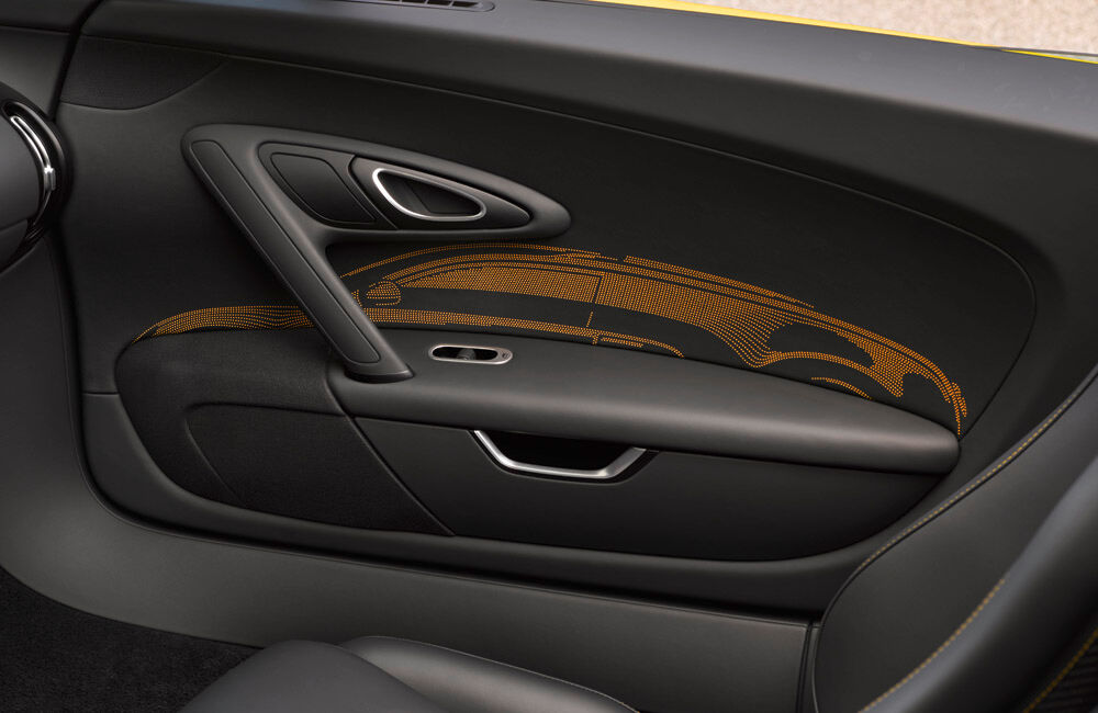 El interior no se queda atrás. Las puertas del Bugatti Veyron Grand Sport Vitesse One of One están fabricadas con dos tipos de cuero, amarillo en la parte inferior y negro en la parte superior. En el lateral aparece la figura de un Bugatti Veyron gracias a la utilización de una nueva técnica láser, con la que se consiguen pequeños agujeros únicamente en la capa de cuero superior, dejando visible la capa inferior en amarillo.