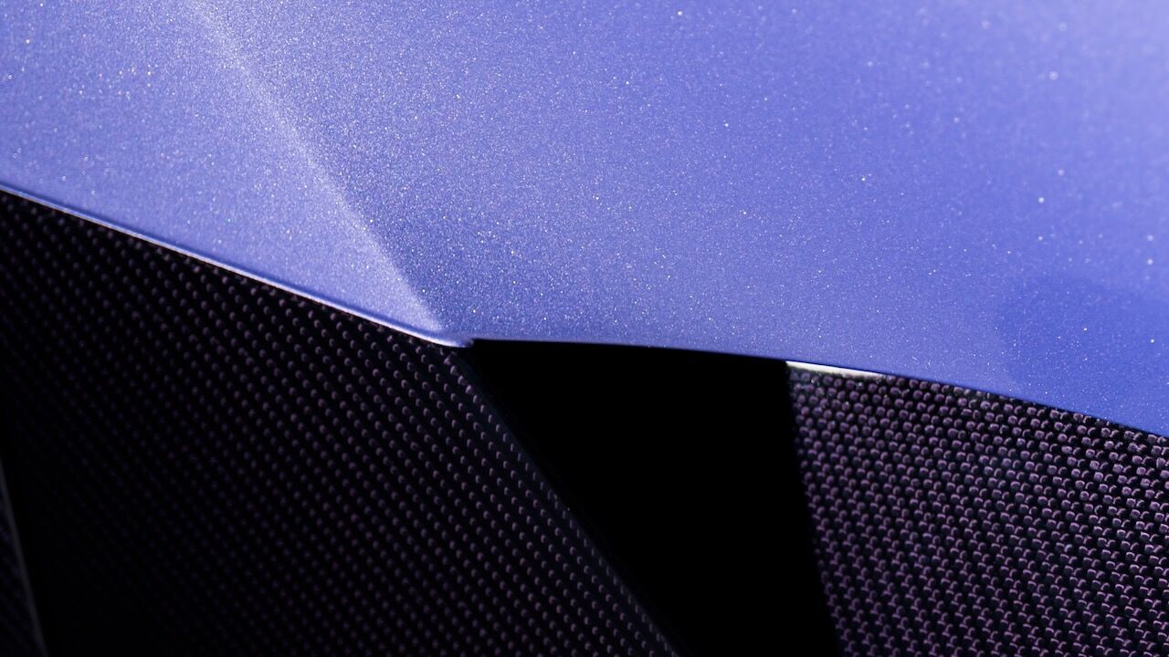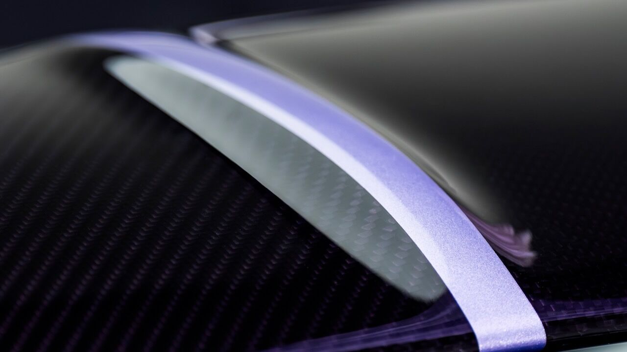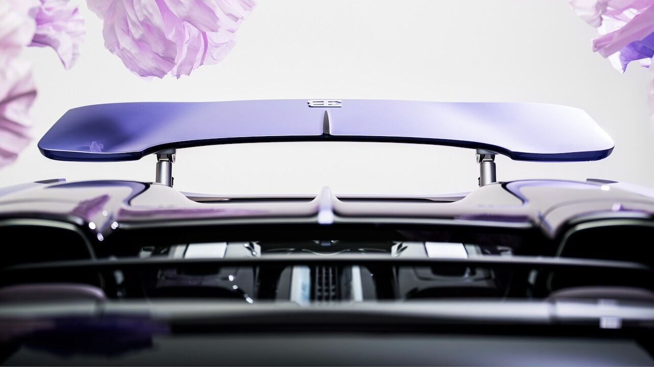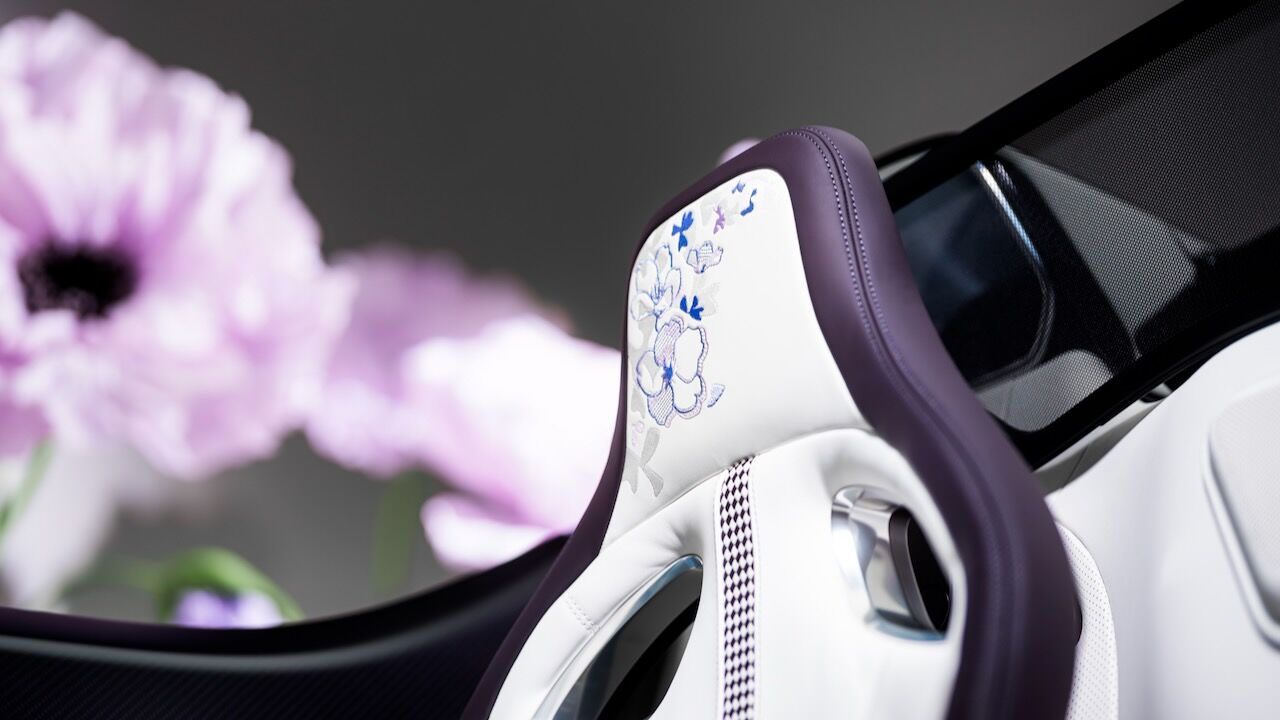 Para empezar, el equipo de diseño invirtió innumerables horas hasta dar con una pintura a medida bautizada como «Lavender». Se trata de un tono que reacciona a la luz y que oscila entre un violeta azulado y rojizo. Se complementa a la perfección por una zona inferior de la carrocería terminada en fibra de carbono vista teñida también de violeta. Los motivos florales también llegan alerón trasero retráctil, con un auténtico lienzo a la vista cuando el aerofreno se despliega. Pintado a mano, se han aplicado múltiples capas de tonos lila e iris para perfilar cada pétalo y la inscripción «Caroline» en la parte central.