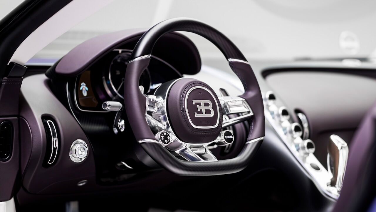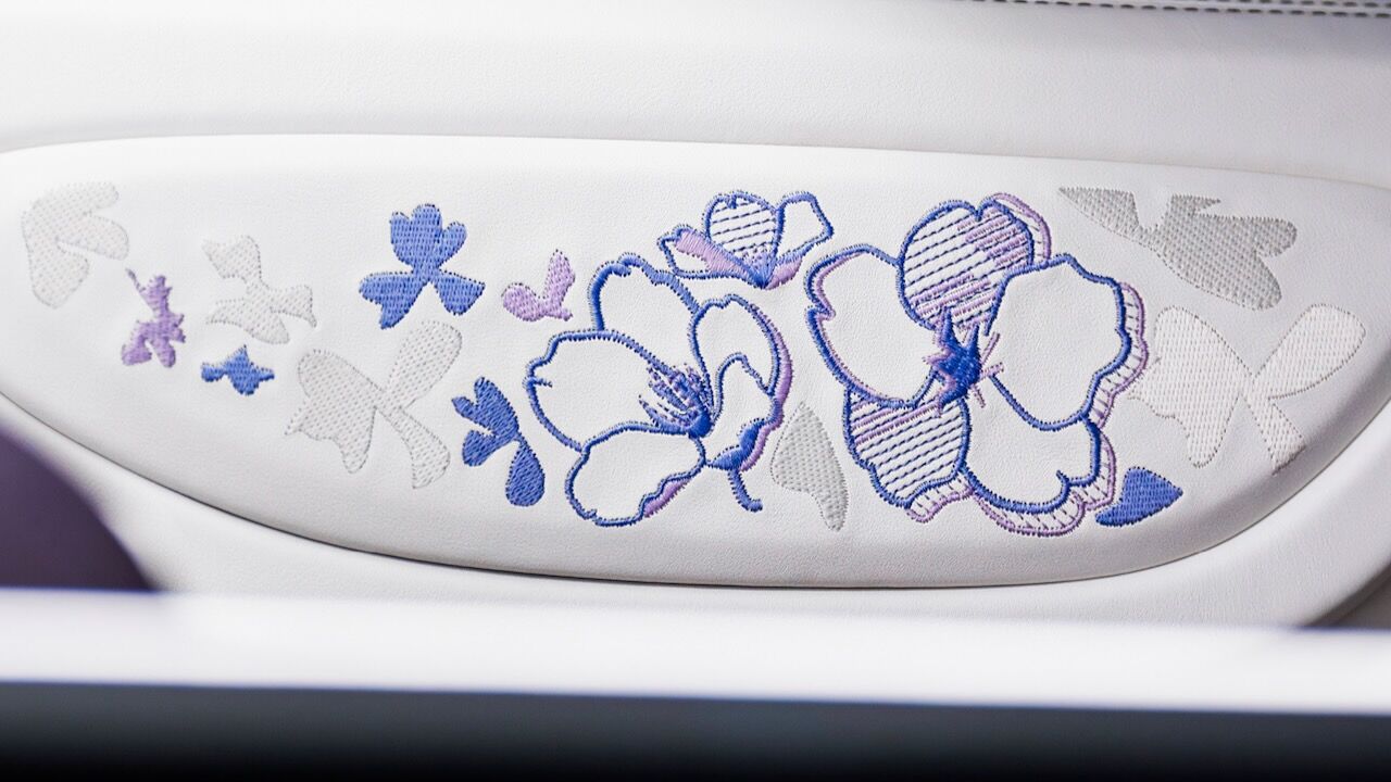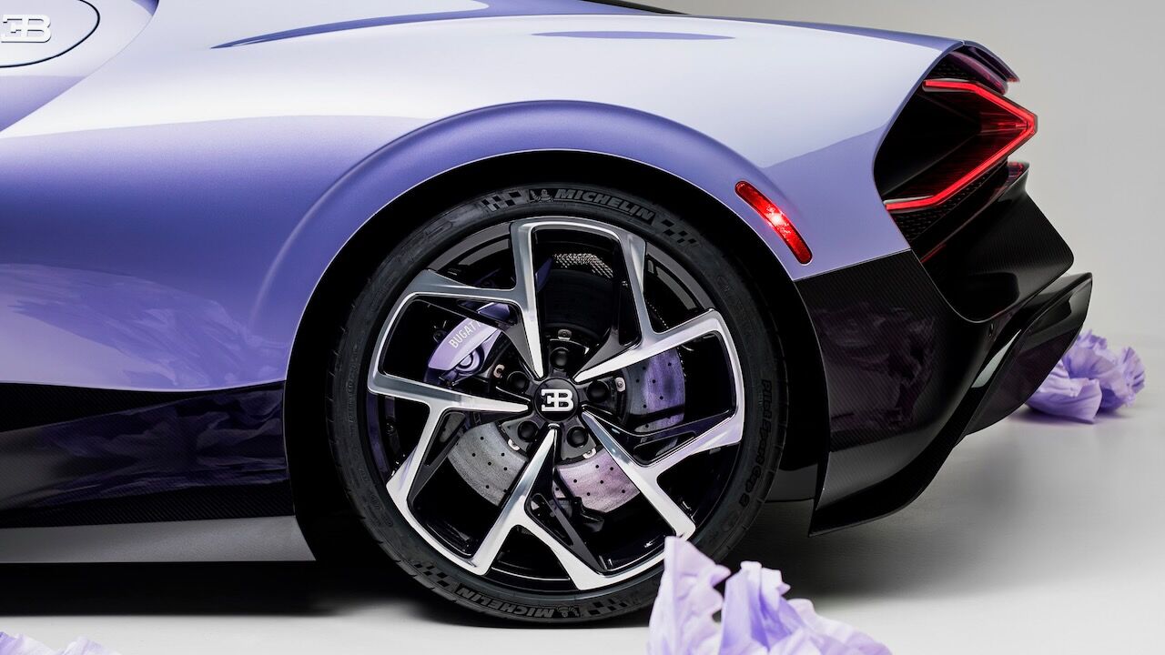 En el habitáculo se combinan cueros en tonos «Blanc» y «Minuit» con las mismas inserciones en fibra de carbono violeta que encontramos en el exterior. Los reposacabezas lucen un tienen más flores bordadas a mano y los paneles de las puertas presentan un bordado dinámico que simula pétalos flotando impulsados por el viento. Como guinda del pastel, el selector del cambio alberga la icónica escultura del elefante danzante de Rembrandt Bugatti, encapsulada en un cristal tintado que armoniza con la paleta de colores.
