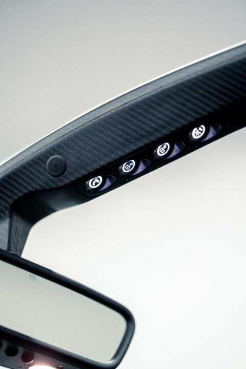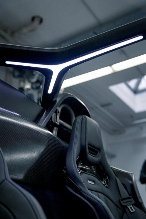 Quizás, lo primero que llame la atención sea el “Speedbow”, que se extiende justo enfrente del pequeño parabrisas hacia el habitáculo y, finalmente, queda conectado a los arcos de protección antivuelco tras los asientos. Este elemento, que se asemeja al “halo” utilizado en la Fórmula 1, está hecho de fibra de carbono e incorpora iluminación ambiental en la parte inferior. El Bussink GT R SpeedLegend también cuenta con otros componentes gestados a medida, incluidas las rejillas de fibra de carbono en los pasos de rueda delanteros.