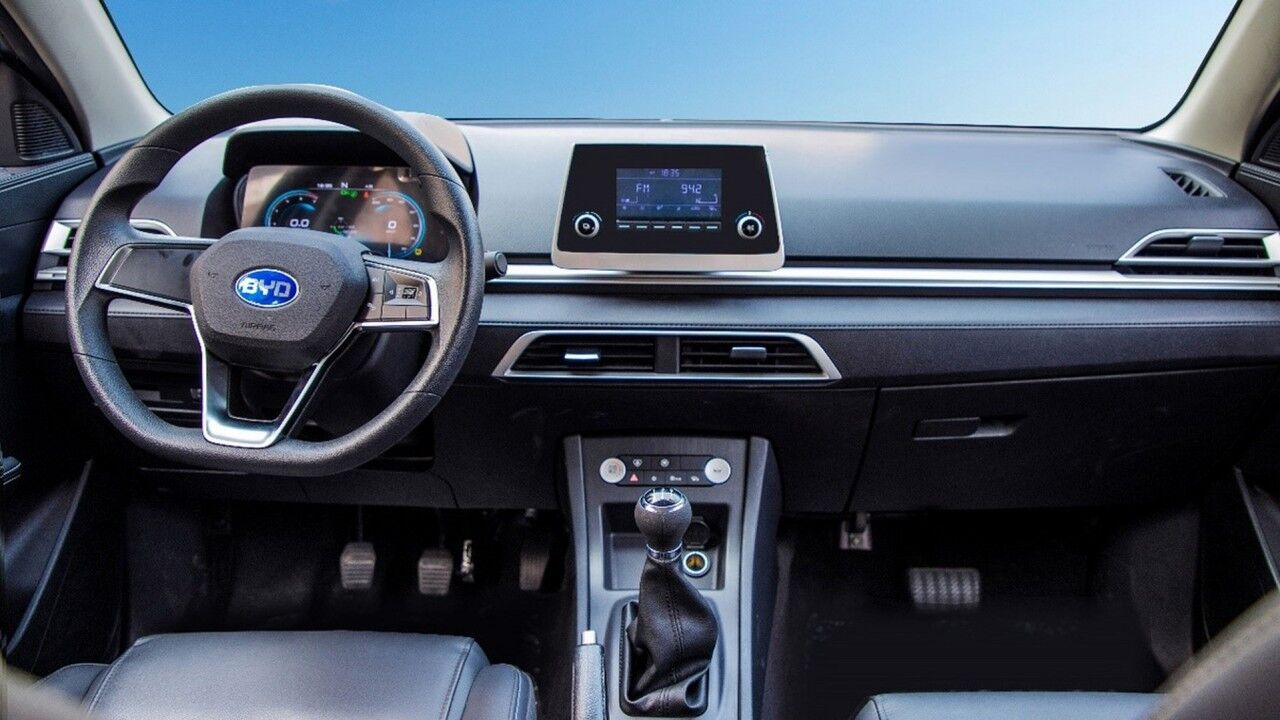 El interior por su parte es lo más destacado de este modelo. En comparación con cualquier otro BYD e3, el derivado para autoescuelas añade un pedal de embrague con su palanca de cambios asociada. Ah, y también hay un freno de mano mecánico que reemplaza al freno de estacionamiento electrónico. Y si somos detalles, hay un cuarto pedal, concretamente el del freno en el lado del copiloto. Pero, ¿qué hace realmente ese saliente de la consola central? En pocas palabras, ayudar a los aspirantes al carné de conducir en tiempos de transición.