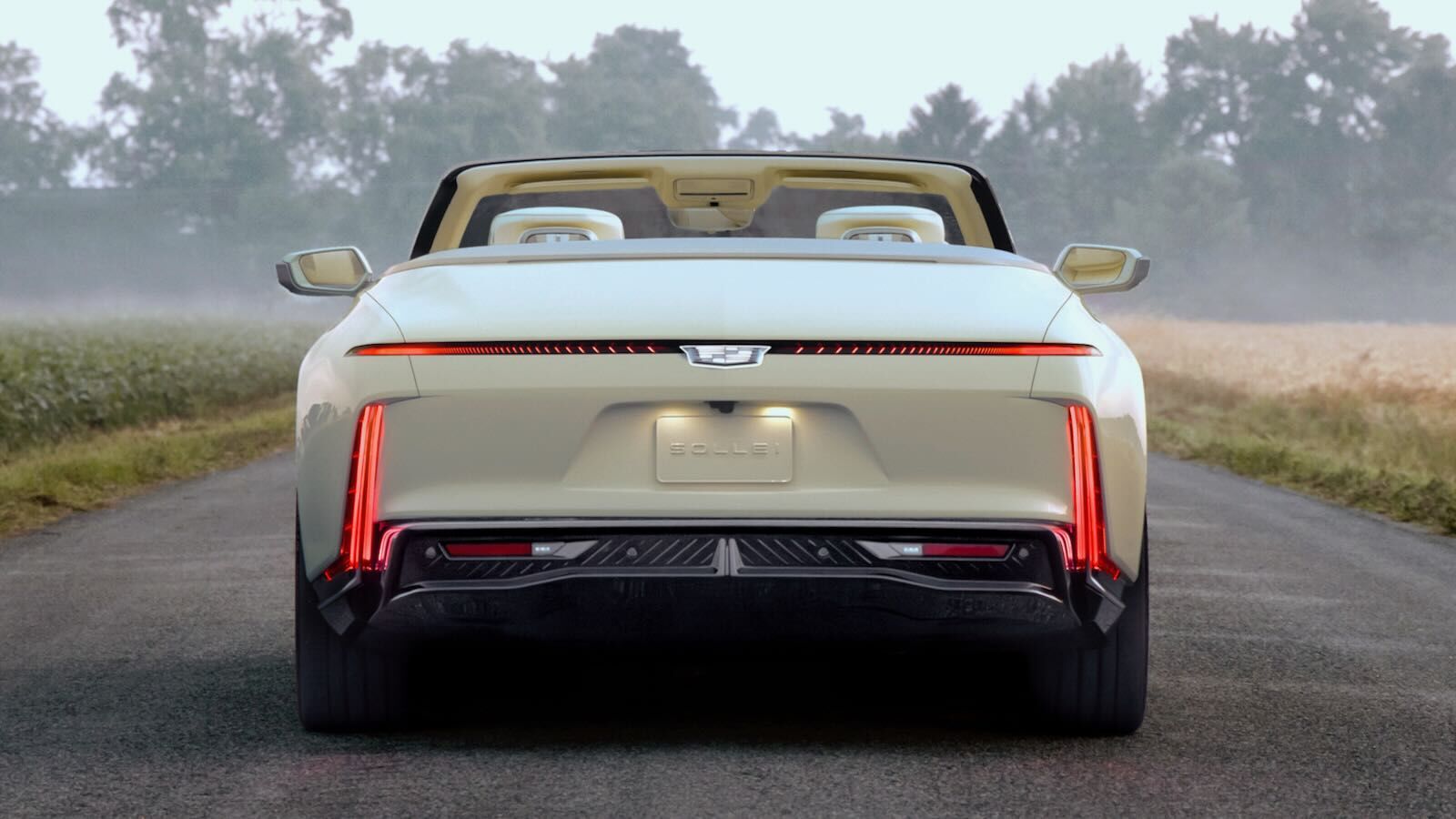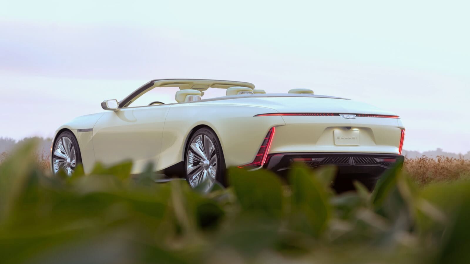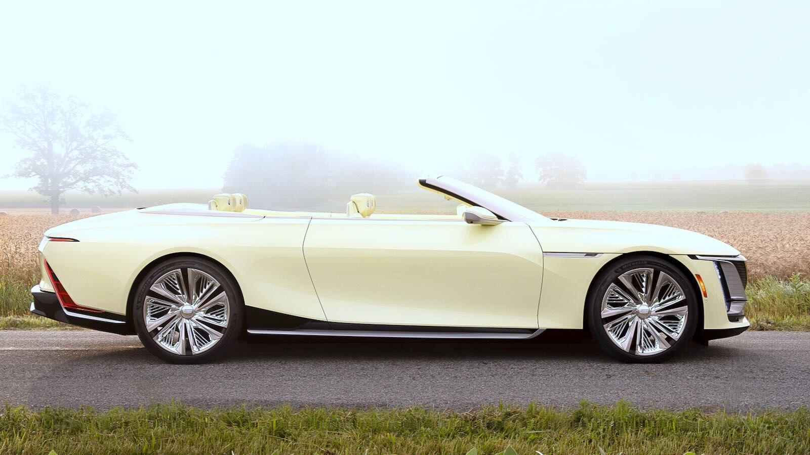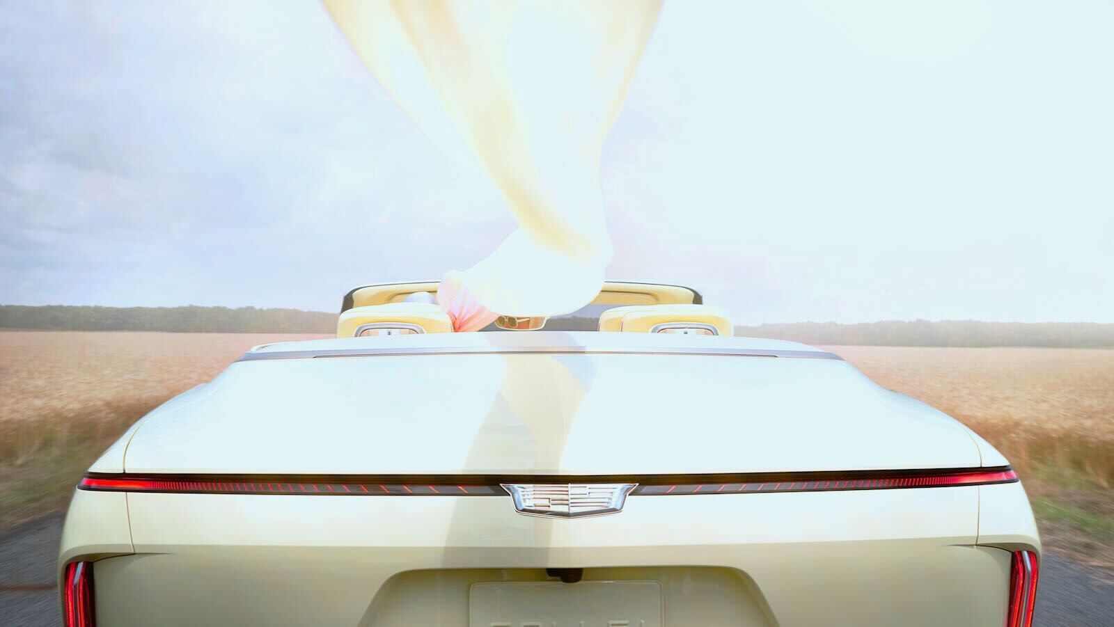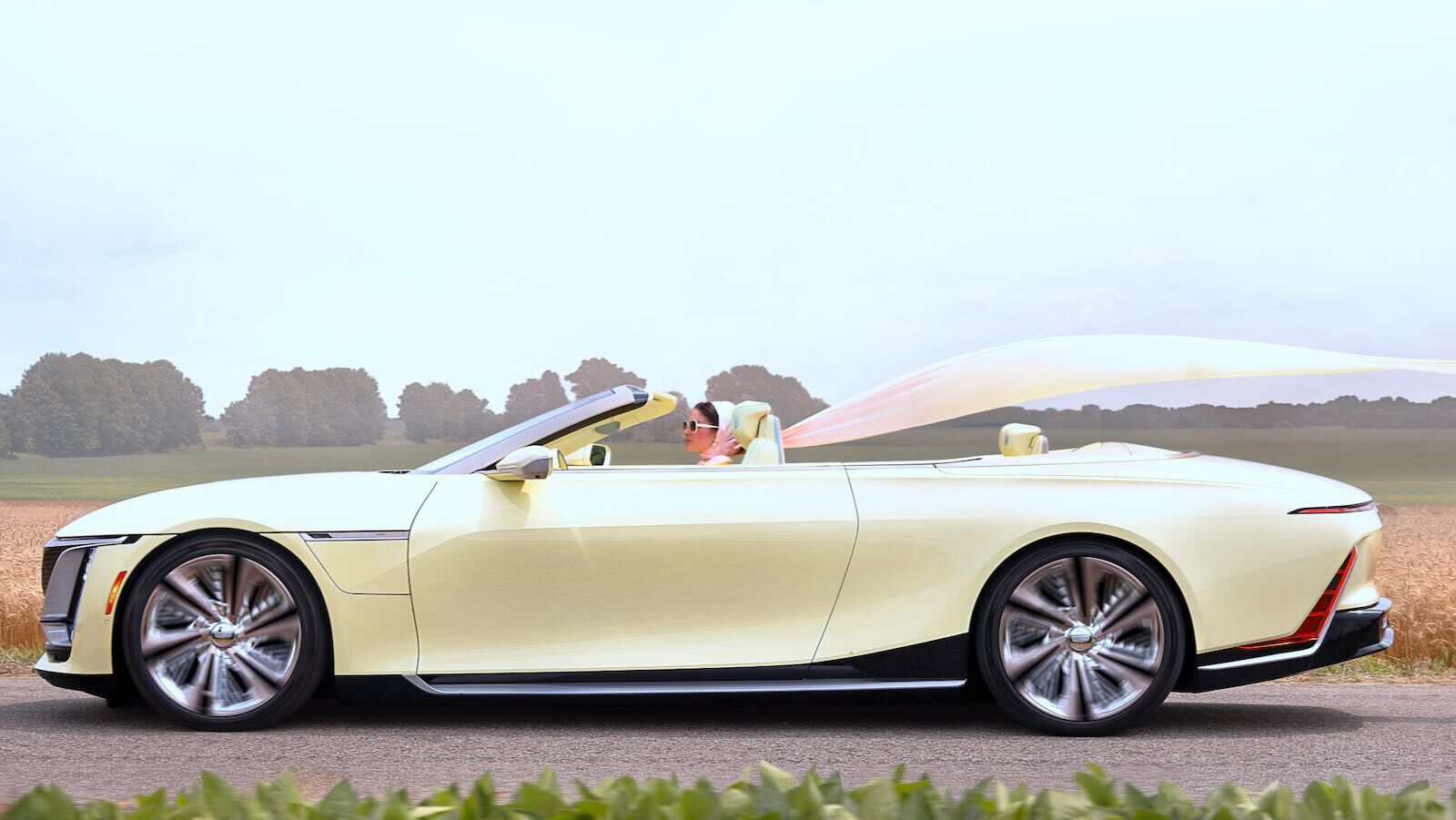 Su diseño se ha inspirado en los clásicos convertibles de Cadillac de los años 50, con un toque contemporáneo. Eligieron el color Manila Cream para la carrocería, que rinde homenaje a modelos históricos de la marca y llantas de aluminio de 23 pulgadas. Sus puertas son larguísimas, de 1,68 metros (sin tiradores convencionales) y una línea central recorre el lateral, conectando los faros delanteros y las ópticas traseras, que se extienden por la parte trasera en un único elemento.