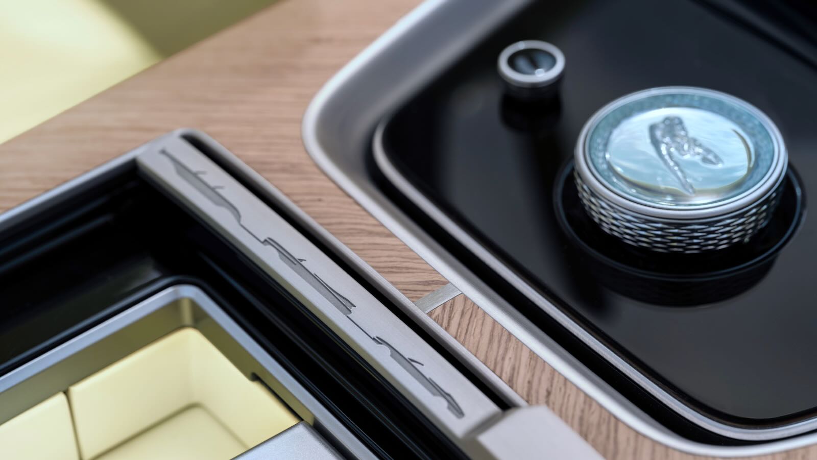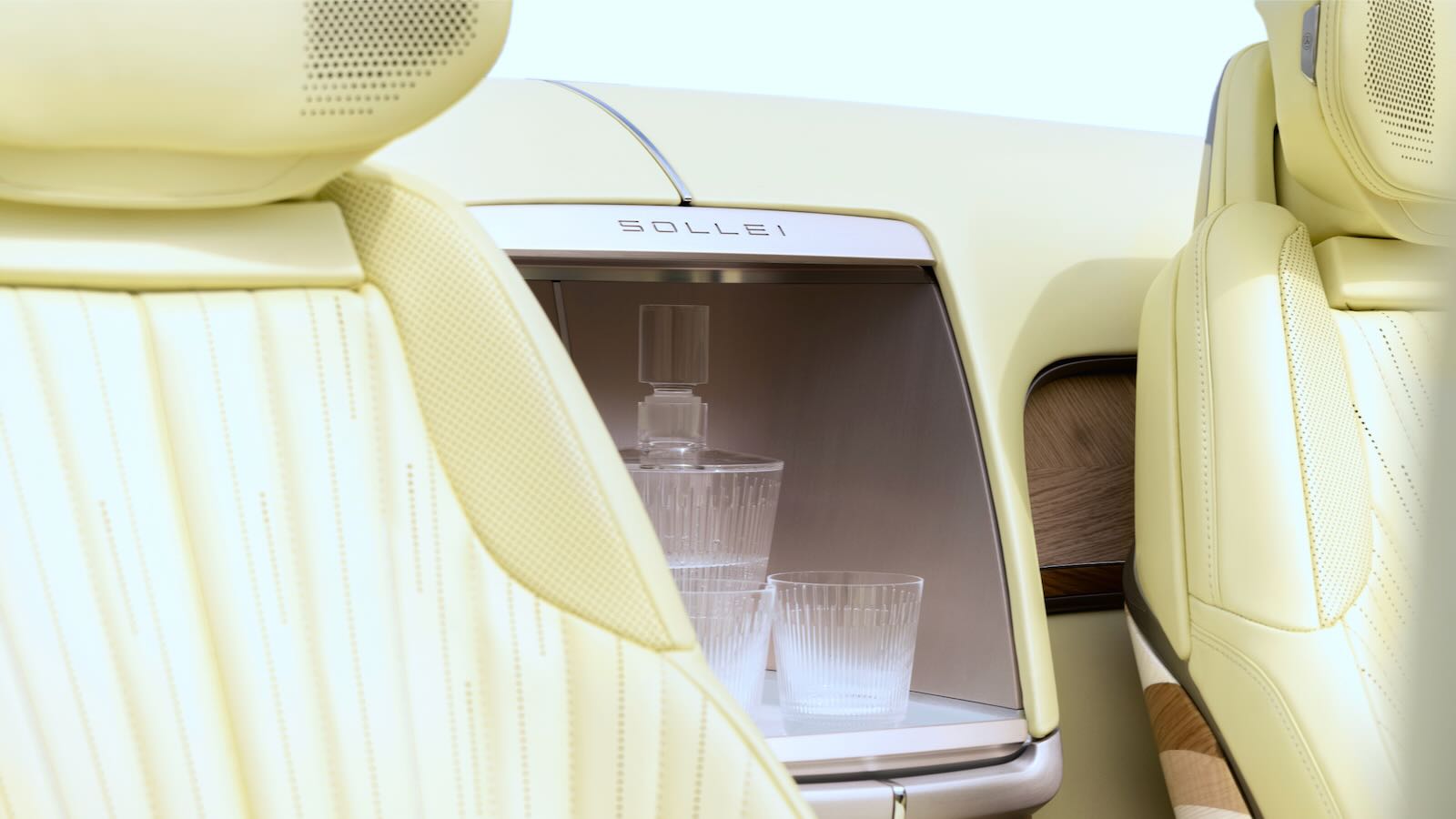 Toda la cabina (de cuatro plazas) está rodeada de un hablo de aluminio, con un interior en el color amarillo vibrante Sola Yellow Iridescent, con un ambiente de lujo y sofisticación. Se han empleado materiales como la madera y el cuero Nappa. Hay detalles como un enfriador de bebidas, una pantalla de 55 pulgadas o un juego de vasos de cristal especialmente diseñados.